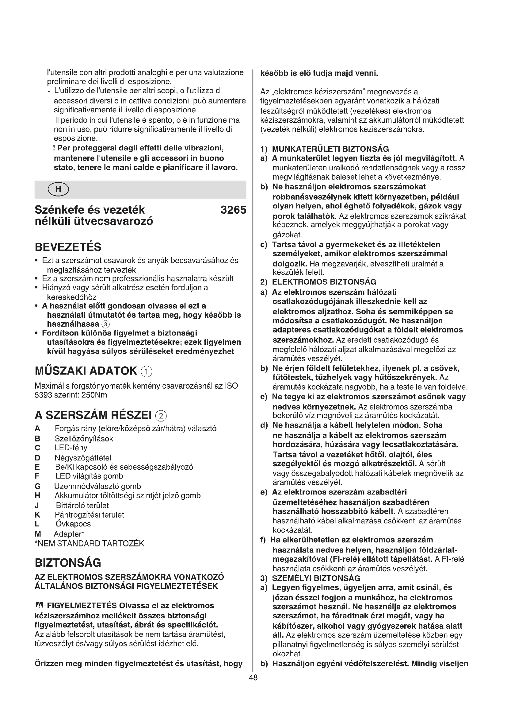 - FIGYELMEZTETÉS Olvassa el az elektromos kéziszerszámhoz mellékelt összes biztonsági gyelmeztetést, utasítást, ábrát és specikációt. Az alább felsorolt utasítások be nem tartása áramütést, tűzveszélyt és/vagy súlyos sérülést idézhet elő. Őrizzen meg minden gyelmeztetést és utasítást, hogy49 beállítását és rögzítését, vizsgáljon meg minden részt, nem sérült-e, és ellenőrizze, nem állnak-e fenn olyan körülmények, amelyek befolyásolhatják az elektromos szerszám helyes működését. Használat előtt javíttassa meg a sérült elektromos szerszámot. A rosszul karbantartott elektromos szerszámok sok balesetet okoznak. f) A vágószerszámok legyenek mindig élesek és tiszták. A megfelelően karbantartott és kiélezett vágóélekkel rendelkező vágószerszámok kevésbé hajlamosak az elgörbülésre, valamint könnyebben kezelhetők. g) Az elektromos kéziszerszámot, tartozékot, vágófeltéteket, stb. mindig ezen biztonsági utasításoknak megfelelően használja, mindig vegye gyelembe a munkakörülményeket, és legyen tekintettel a megmunkálandó munkadarabra. Az elektromos kéziszerszám előírt rendeltetési céltól eltérő használata veszélyes helyzetet eredményezhet. h) Tartsa szárazon, tisztán, olajtól és zsírtól mentesen a fogantyúkat és a tartófelületeket. A csúszós fogantyúk és tartófelületek miatt a szerszám kezelése és vezérlése váratlan helyzetekben nem biztonságos.