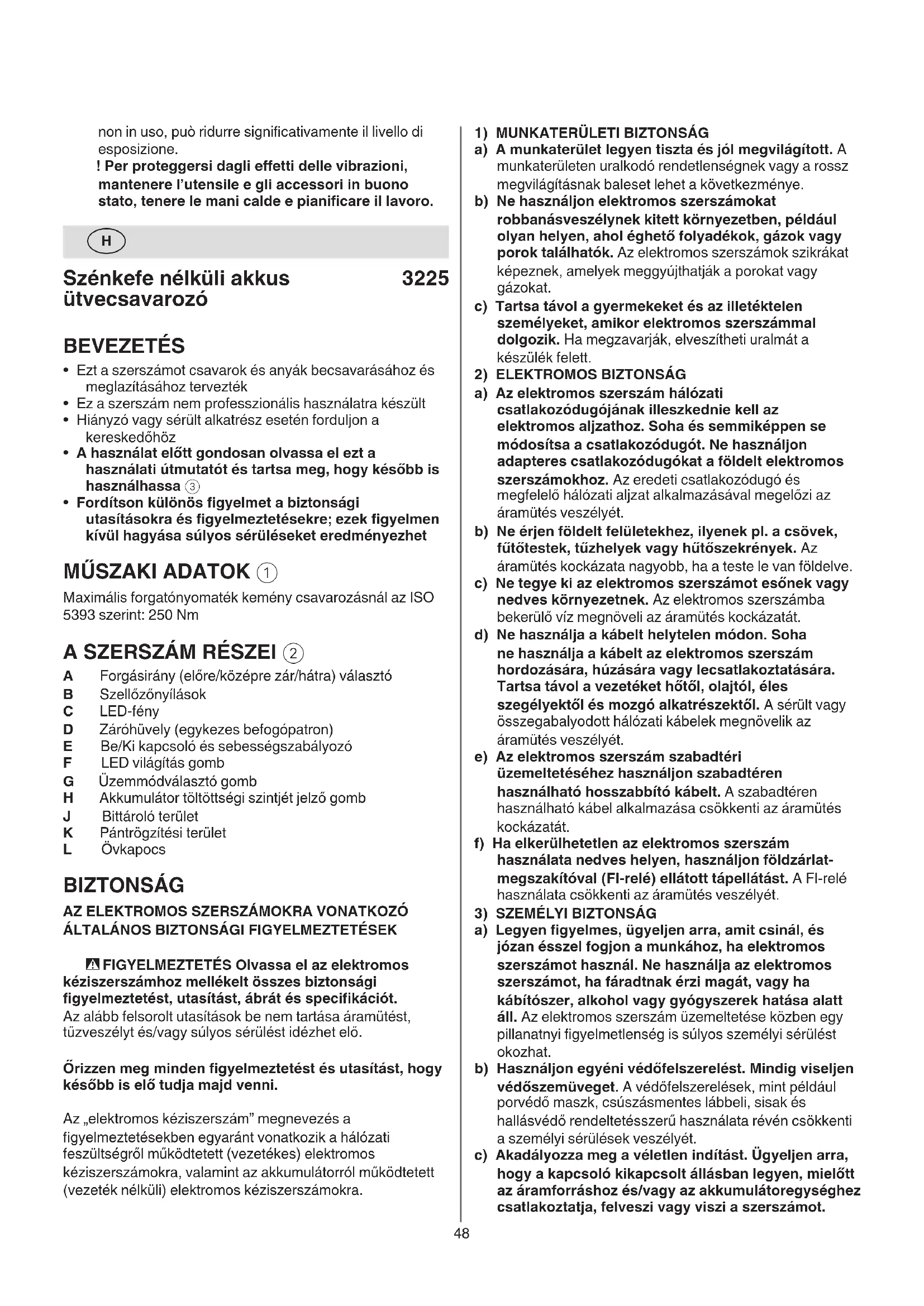 - FIGYELMEZTETÉS Olvassa el az elektromos kéziszerszámhoz mellékelt összes biztonsági gyelmeztetést, utasítást, ábrát és specikációt. Az alább felsorolt utasítások be nem tartása áramütést, tűzveszélyt és/vagy súlyos sérülést idézhet elő. Őrizzen meg minden gyelmeztetést és utasítást, hogy később is elő tudja majd venni. Az „elektromos kéziszerszám” megnevezés a gyelmeztetésekben egyaránt vonatkozik a hálózati feszültségről működtetett (vezetékes) elektromos kéziszerszámokra, valamint az akkumulátorról működtetett (vezeték nélküli) elektromos kéziszerszámokra.49 tiszták. A megfelelően karbantartott és kiélezett vágóélekkel rendelkező vágószerszámok kevésbé hajlamosak az elgörbülésre, valamint könnyebben kezelhetők. g) Az elektromos kéziszerszámot, tartozékot, vágófeltéteket, stb. mindig ezen biztonsági utasításoknak megfelelően használja, mindig vegye gyelembe a munkakörülményeket, és legyen tekintettel a megmunkálandó munkadarabra. Az elektromos kéziszerszám előírt rendeltetési céltól eltérő használata veszélyes helyzetet eredményezhet. h) Tartsa szárazon, tisztán, olajtól és zsírtól mentesen a fogantyúkat és a tartófelületeket. A csúszós fogantyúk és tartófelületek miatt a szerszám kezelése és vezérlése váratlan helyzetekben nem biztonságos.
