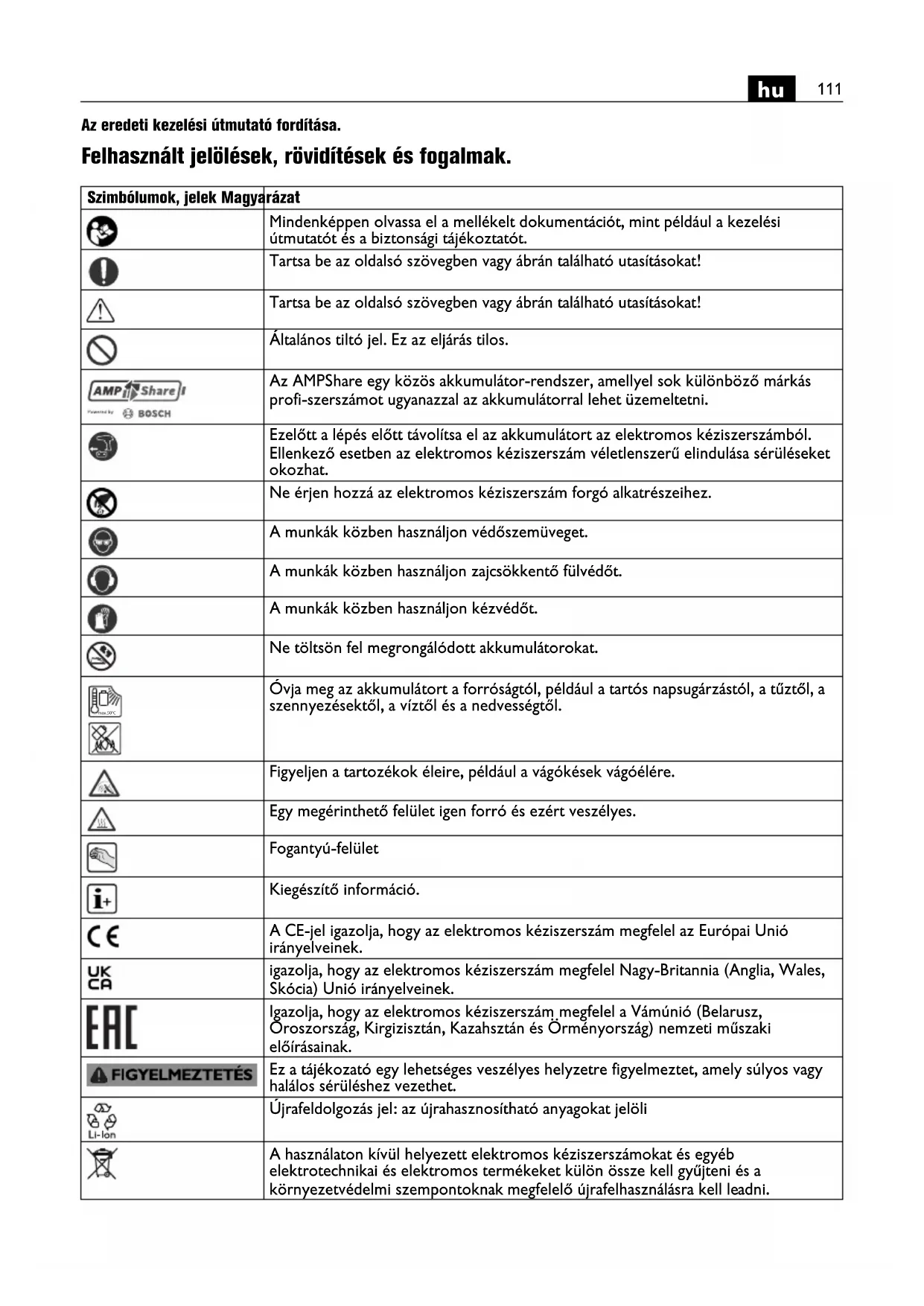 Az eredeti kezelési útmutató fordítása. Felhasznált jelölések, rövidítések és fogalmak. Szimbólumok, jelek Magyarázat Mindenképpen olvassa el a mellékelt dokumentációt, mint például a kezelési útmutatót és a biztonsági tájékoztatót. Tartsa be az oldalsó szövegben vagy ábrán található utasításokat! Tartsa be az oldalsó szövegben vagy ábrán található utasításokat! Általános tiltó jel. Ez az eljárás tilos. Az AMPShare egy közös akkumulátor-rendszer, amellyel sok különböző márkás profi-szerszámot ugyanazzal az akkumulátorral lehet üzemeltetni. Ezelőtt a lépés előtt távolítsa el az akkumulátort az elektromos kéziszerszámból. Ellenkező esetben az elektromos kéziszerszám véletlenszerű elindulása sérüléseket okozhat. Ne érjen hozzá az elektromos kéziszerszám forgó alkatrészeihez. A munkák közben használjon védőszemüveget. A munkák közben használjon zajcsökkentő fülvédőt. A munkák közben használjon kézvédőt. Ne töltsön fel megrongálódott akkumulátorokat. Óvja meg az akkumulátort a forróságtól, például a tartós napsugárzástól, a tűztől, a szennyezésektől, a víztől és a nedvességtől. Figyeljen a tartozékok éleire, például a vágókések vágóélére. Egy megérinthető felület igen forró és ezért veszélyes. Fogantyú-felület Kiegészítő információ. A CE-jel igazolja, hogy az elektromos kéziszerszám megfelel az Európai Unió irányelveinek. igazolja, hogy az elektromos kéziszerszám megfelel Nagy-Britannia (Anglia, Wales, Skócia) Unió irányelveinek. Igazolja, hogy az elektromos kéziszerszám megfelel a Vámúnió (Belarusz, Oroszország, Kirgizisztán, Kazahsztán és Örményország) nemzeti műszaki előírásainak. Ez a tájékozató egy lehetséges veszélyes helyzetre figyelmeztet, amely súlyos vagy halálos sérüléshez vezethet. Újrafeldolgozás jel: az újrahasznosítható anyagokat jelöli A használaton kívül helyezett elektromos kéziszerszámokat és egyéb elektrotechnikai és elektromos termékeket külön össze kell gyűjteni és a környezetvédelmi szempontoknak megfelelő újrafelhasználásra kell leadni. max.50°C112