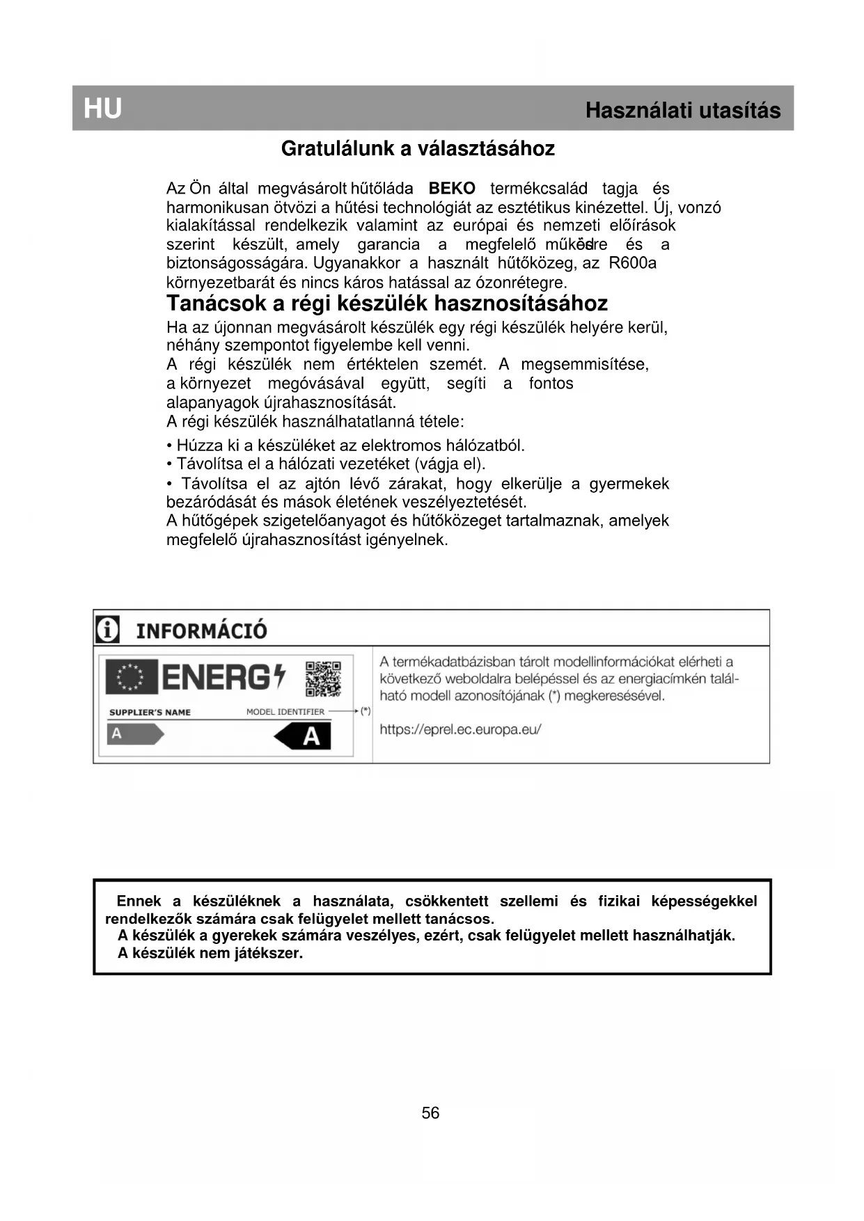 LT Naudojimo instrukcija Ant prietaiso arba pakuotės esantis simbolis nurodo, kad su šiuo prietaisu negalima elgtis kaip su buitinėmis šiukšlėmis. Jį reikia perduoti atitinkam surinkimo punktui, kad elektros ir elektronikos prietaisas būtų perdirbtas. Tinkamai išmesdami šį gaminį, prisidėsite prie apsaugos nuo galimo neigiamo poveikio aplinkai ir žmonių sveikatai, kuris gali būti padarytas šį gaminį netinkamai išmetant. Dėl išsamesnės informacijos apie šio gaminio perdirbimą, prašom kreiptis į savo miesto valdžios instituciją, buitinių atliekų išvežimo tarnybą arba parduotuvę, kurioje pirkote šį prietaisą.Gratulálunk a választásához Az Ön által megvásárolt hűtőláda a BEKO termékcsalád tagja és harmonikusan ötvözi a hűtési technológiát az esztétikus kinézettel. Új, vonzó kialakítással rendelkezik valamint az európai és nemzeti előírások szerint készült, amely garancia a megfelelő működésre és a biztonságosságára. Ugyanakkor a használt hűtőközeg, az R600a környezetbarát és nincs káros hatással az ózonrétegre. Tanácsok a régi készülék hasznosításához Ha az újonnan megvásárolt készülék egy régi készülék helyére kerül, néhány szempontot figyelembe kell venni. A régi készülék nem értéktelen szemét. A megsemmisítése, a környezet megóvásával együtt, segíti a fontos alapanyagok újrahasznosítását. A régi készülék használhatatlanná tétele: