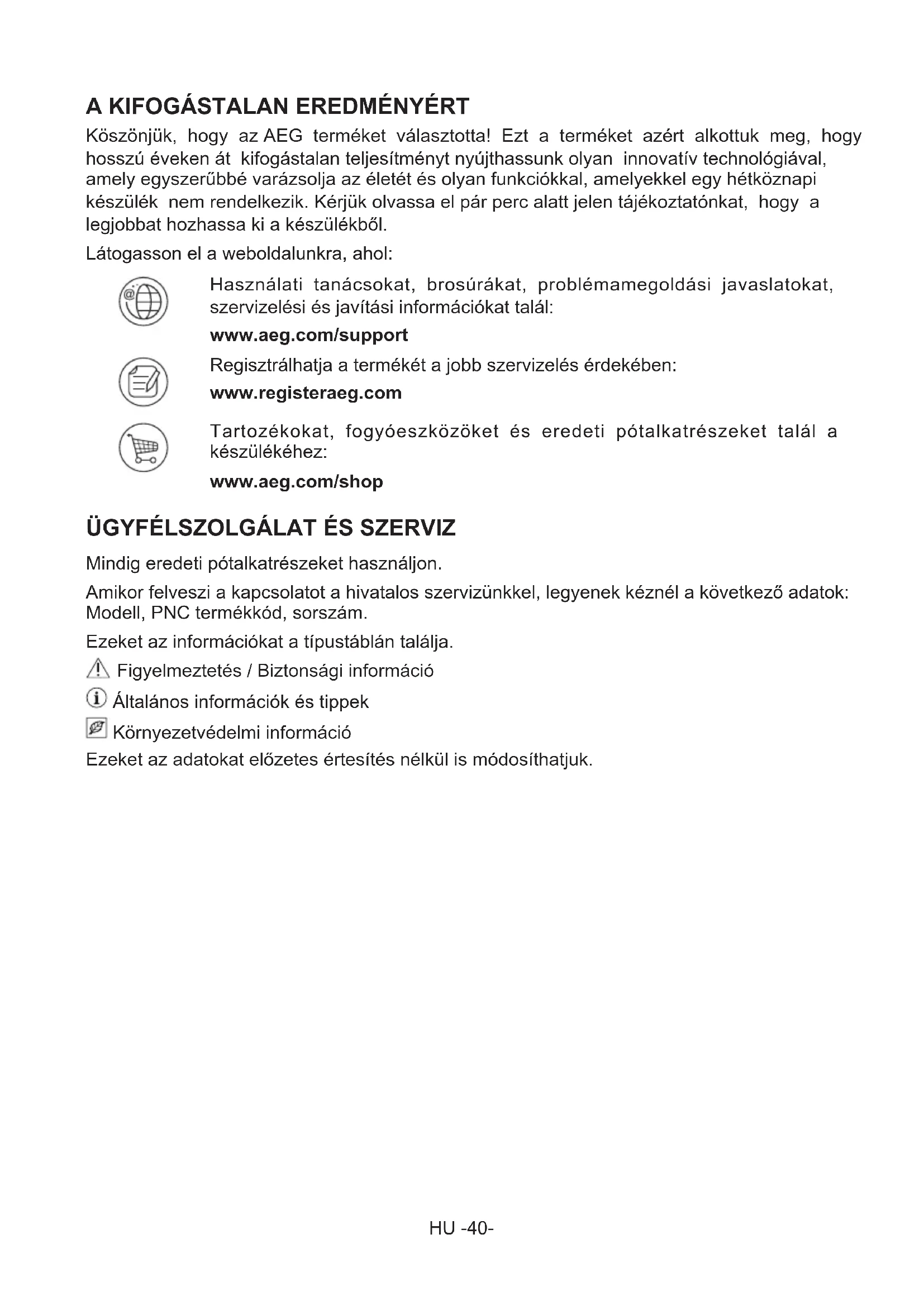 Köszönjük, hogy az AEG terméket választotta! Ezt a terméket azért alkottuk meg, hogy hosszú éveken át kifogástalan teljesítményt nyújthassunk olyan innovatív technológiával, amely egyszerűbbé varázsolja az életét és olyan funkciókkal, amelyekkel egy hétköznapi készülék nem rendelkezik. Kérjük olvassa el pár perc alatt jelen tájékoztatónkat, hogy a legjobbat hozhassa ki a készülékből. Látogasson el a weboldalunkra, ahol: Használati tanácsokat, brosúrákat, problémamegoldási javaslatokat, szervizelési és javítási információkat talál: www.aeg.com/support Regisztrálhatja a termékét a jobb szervizelés érdekében: www.registeraeg.com Tartozékokat, fogyóeszközöket és eredeti pótalkatrészeket talál a készülékéhez: www.aeg.com/shop