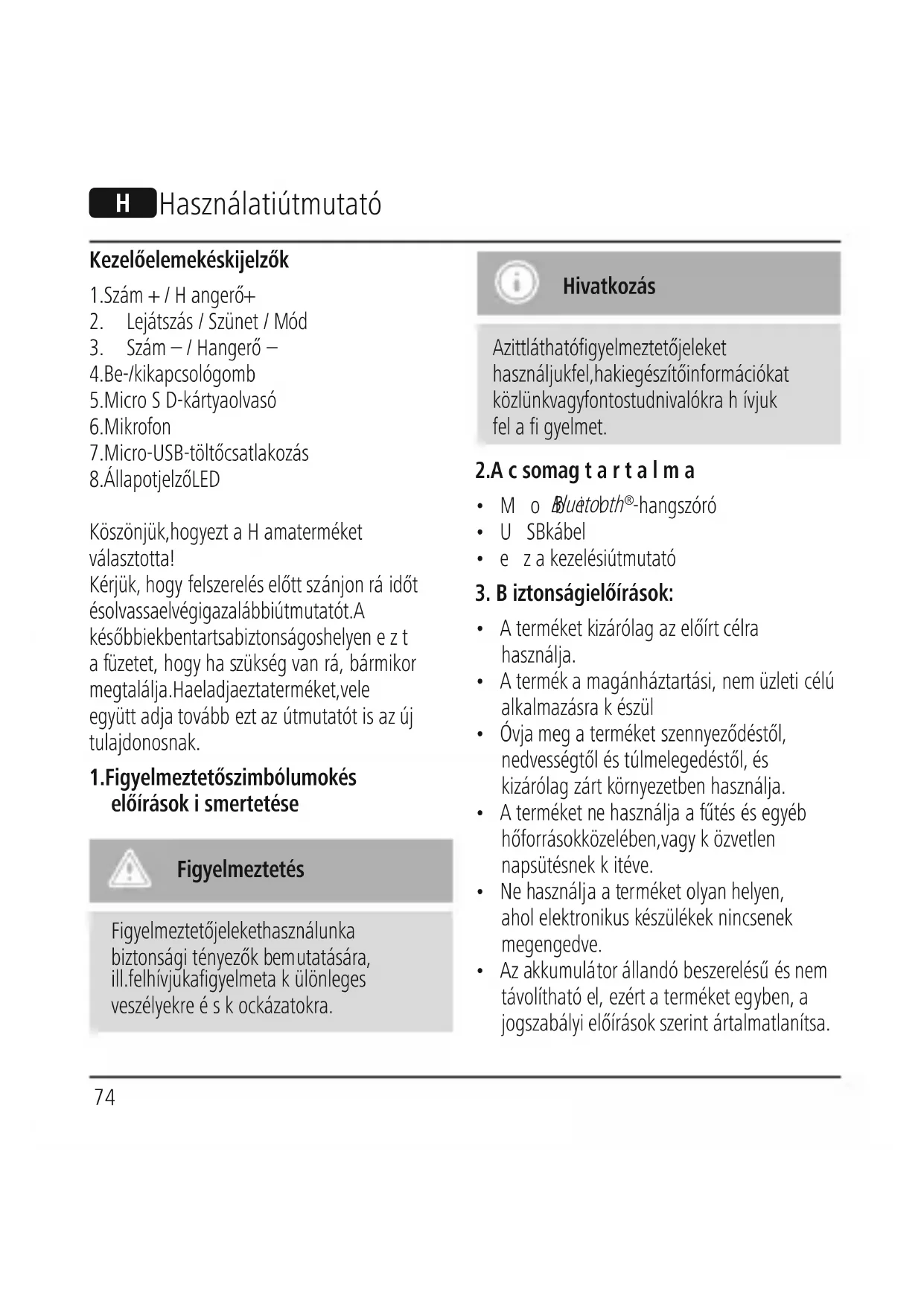 - Azenelejátszás alternatívaként irányítható a 4.4Hanglejátszás MicroSD-ről részben leírtak szerintahangszóróról.78 Hivatkozás–Acsatlakoztatás korlátozott Ahangszóró és az eszköz sikereselső kapcsolódását követően acsatlakozás automatikusan végbemegy. Amennyibena Bluetooth