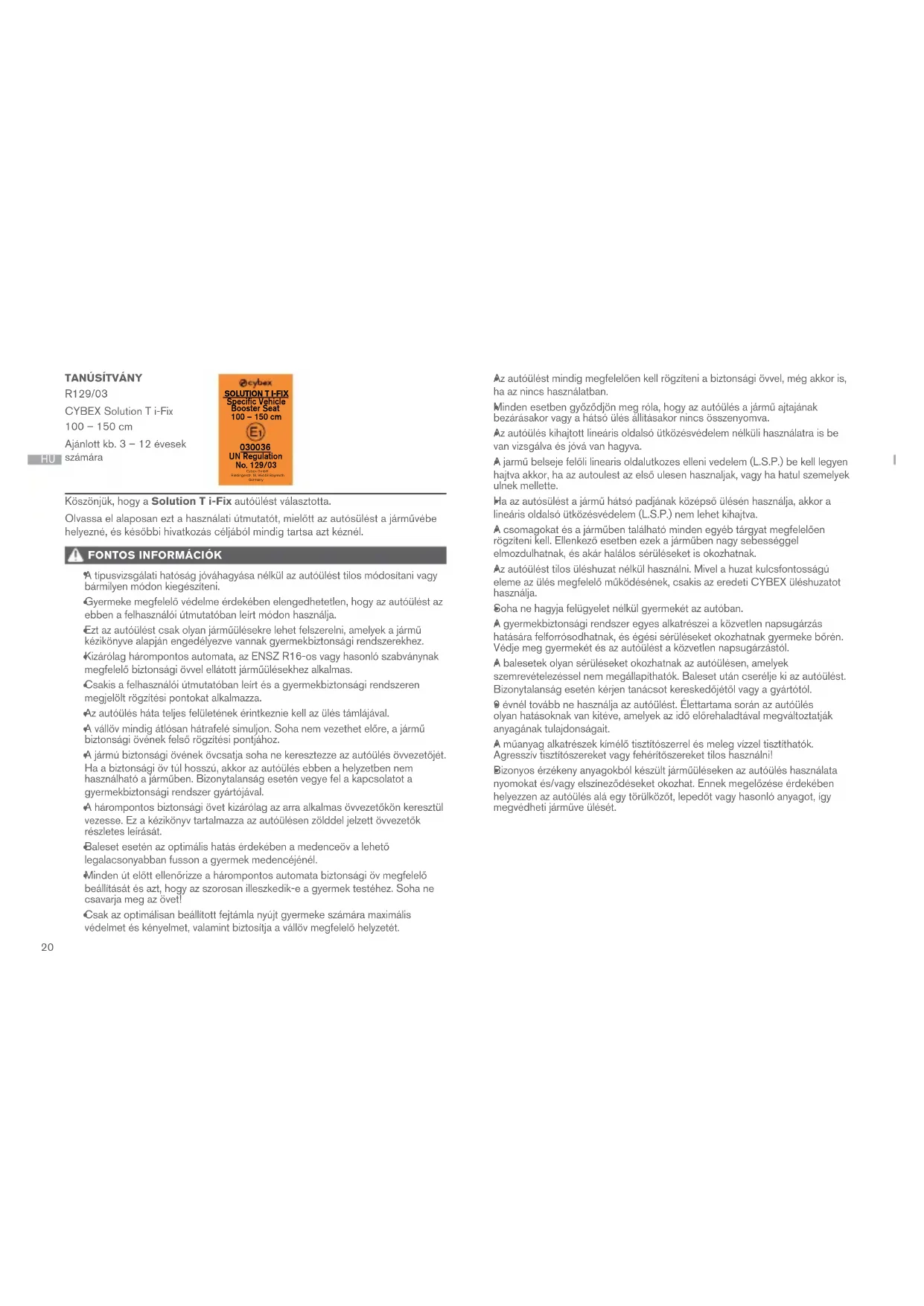 Cybex GmbHRiedingerstr. 18, 95448 BayreuthGermany UN Regulation No. 129/03 Köszönjük, hogy a Solution T i-Fix autóülést választotta. Olvassa el alaposan ezt a használati útmutatót, mielőtt az autósülést a járművébe helyezné, és későbbi hivatkozás céljából mindig tartsa azt kéznél.