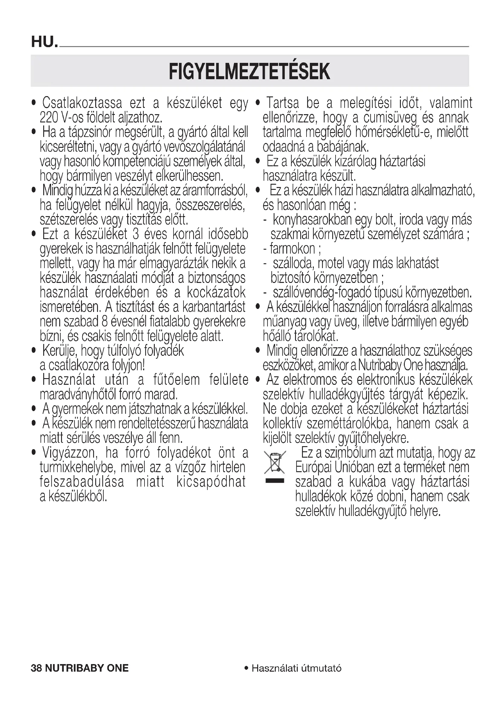 - Az elektromos és elektronikus készülékek szelektív hulladékgyűjtés tárgyát képezik. Ne dobja ezeket a készülékeket háztartási kollektív szeméttárolókba, hanem csak a kijelölt szelektív gyűjtőhelyekre. Ez a szimbólum azt mutatja, hogy az Európai Únióban ezt a terméket nem szabad a kukába vagy háztartási hulladékok közé dobni, hanem csak szelektív hulladékgyűjtő helyre.39NUTRIBABY ONE
