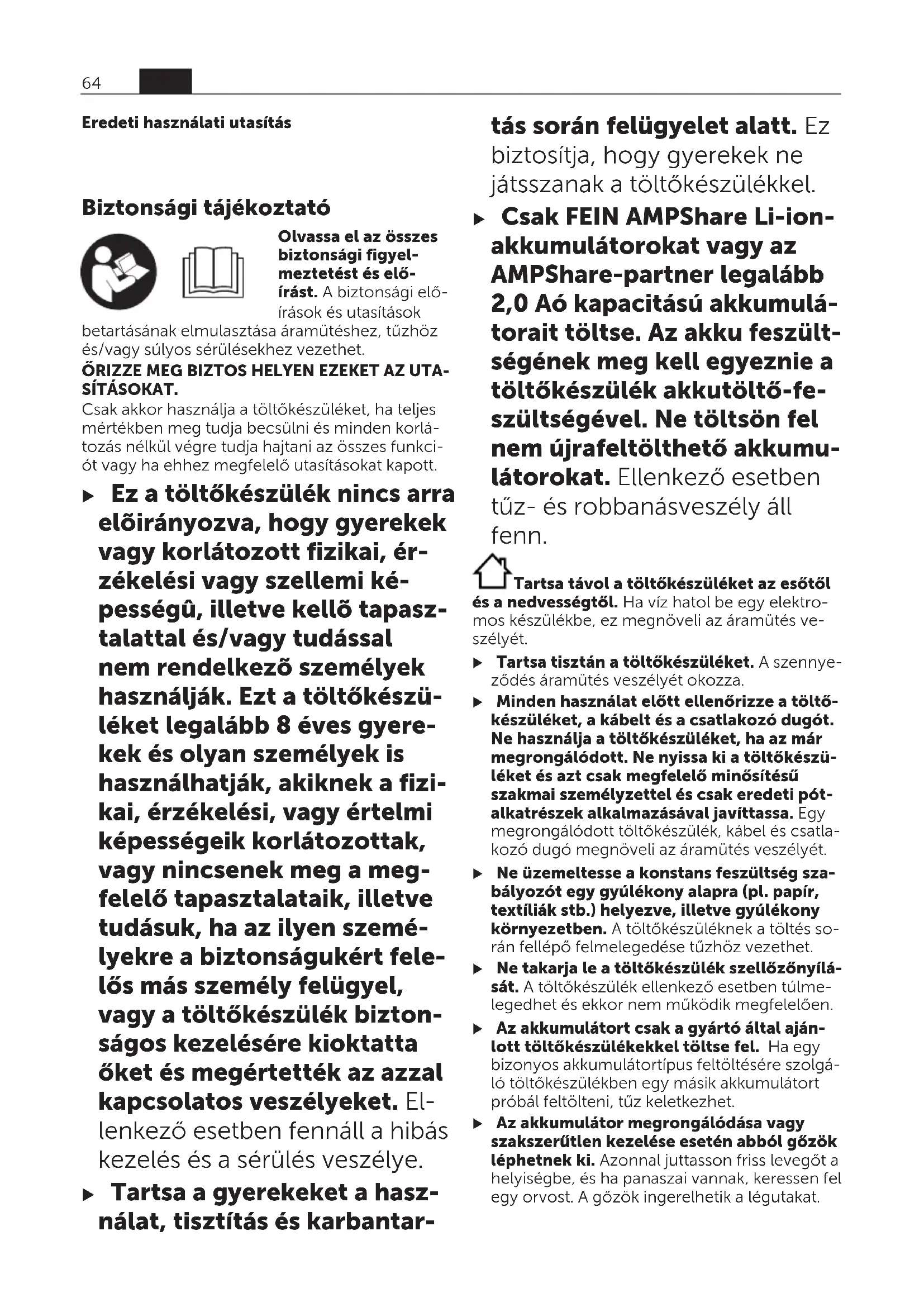 – 4,0Aó perc 16/25 – 5,0Aó perc 20/35 Az akkumulátorcellák száma 5–15 Súly az „EPTA-Procedure01:2014” (2014/01EPTA‑eljárás) szerint kg 0,95 Érintésvédelmi osztály / II A) a hőmérséklettő és az akkumulátor típustól függően B) Az akkumulátor feltöltési szintje 50 % (Power Boost-tal való töltés után). Az akkumulátort azonnali használatra ki lehet venni. C) Az akkumulátor feltöltési szintje kb. 80 % (Power Boost-tal való töltés után). Az akkumulátort azonnali használatra ki lehet venni. D) Az akkumulátor feltöltési szintje kb. 80 % (standard töltési üzemmóddal való töltés után). Az akkumulátort azonnali használatra ki lehet venni. E) Az akkumulátor feltöltési szintje 97 % – 100 % (standard töltési üzemmóddal való töltés után). hu 65 34101366060 • 1.6.22ÜzemeltetésMagyar ÖsszeszerelésMagyar u A töltőkészüléken végzendő bármely munka megkezdése előtt húzza ki a csatlakozó dugót a dugaszolóaljzatból. Fali szerelésMagyar A töltőkészüléket vagy álló helyzetben (asztali készülék / desktop use) vagy a falra akasztva le- het üzemeltetni. A fali rögzítéshez: fúrjon ki az ábrának megfelelő távolságban két furatot. A rögzítéshez használjon 5mm – max. 6,5mm átmérőjű félgömbfejű csavarokat. Üzembe helyezésMagyar u Ügyeljen a helyes hálózati feszültségre! Az áramforrás feszültségének meg kell egyeznie a töltőkészülék típustábláján található adatokkal. A 230V‑os töltőkészülékeket 220V hálózati feszültségről is szabad üzemeltetni. Töltési folyamatMagyar A töltési folyamat megkezdődik, mihelyt bedug- ták a töltőkészülék hálózati csatlakozódugaszát a dugaszolóaljzatba és a akkumulátort a (1) töltő- kosárba. Az intelligens töltési eljárás során a rendszer au- tomatikusan felismeri az akkumulátor töltési szintjét és azt az akkumulátor hőmérsékletétől és feszültségétől függően a mindenkori optimális töltőárammal tölti. Ez az eljárás kíméli az akkumulátort és az, ha a töltőkészülékben tárolják, mindig teljesen feltöl- tött állapotban marad. A kijelző elemek magyarázataMagyar Zöld akkumulátor töltöttségi szint kijelző (3)Magyar Az 5 zöld LED a töltési eljárás közben és a töltési eljárás befejezése után jel- zik az akkumulátor töltöttségi szintjét. Egy folytonosan világító LED kb. 20 % akkumulátor-kapacitásnak felel meg. Állapot LED Akkumulá- tor-kapaci- tás, kb. Az 5 LED egymás után gyullad ki. < 20% A legalsó LED folytonosan vi- lágít. 20% A 2 alsó LED folytonosan vilá- gít. 40% A 3 alsó LED folytonosan vilá- gít. 60% A 4 alsó LED folytonosan vilá- gít. 80% Mind az 5 LED folytonosan vi- lágít. > 95% Megjegyzés: A töltés csak akkor lehetséges, ha az akku hőmérséklete a megengedett töltési hő- mérsékleti tartományban van, lásd a "Műszaki Adatok" szakaszt. Piros hőméréklet felügyelet/hiba kijelző (5)Magyar Folyamatos fényMagyar A piros LED tartós fénye azt jelzi, hogy az akkumulátor hőmérséklete kívül van a megengedett töltési hőmérsék- let tartományon, lásd a "Műszaki Ada- tok" szakaszt. Mihelyt az akkumulátor visszatér a megengedett hőmérséklet tartományba, a töltési folyamat megkezdődik. Villogó fényMagyar A piros villogó fény azt jelzi, hogy az akkumulátor vagy a töltőkészülék meghibásodott. Power Boost gomb (4)Magyar A(4)Power Boost gomb megnyomásával a gyors töltési üzemmód aktiválásra kerül. Ezt az akkumulátor behelyezése előtt is, de már behe- lyezett akkumulátor mellett is végre lehet hajtani. A(4)Power Boost gomb a gyors töltés közben piros színben világít. A Power Boost gomb ismé- telt megnyomásával vissza lehet kapcsolni a standard töltési üzemmódra. A gyors töltés befejezése után (kb. 50 % feltöltési szint elérése után) a (4) Power Boost gomb kial- szik. Ha az akkumulátor a töltőkészülékben ma- rad, akkor továbbra is töltésre kerül. 66 hu 34101366060 • 1.6.22HangjelzésMagyar Mihelyt a töltési ciklus befejeződik, felhangzik egy rövid hangjel. Hibák – okaik és elhárításuk módjaMagyar A hiba oka Hibaelhárítás A piros hőméréklet felügyelet/hiba kijelző (5) villog Töltési folyamatra nincs lehetőség Az akkumulátor nincs (helyesen) felhelyezve Helyezze fel előírássze- rűen az akkumulátort a töltőkészülékre Az akkumulátor érint- kezői elszennyeződtek Tisztítsa meg az akku- mulátor érintkezőit, például az akkumulátor többszöri bedugásával és kihúzásával, szükség esetén cserélje ki az ak- kumulátort. Az akkumulátor elrom- lott Cserélje ki az akkumu- látort A töltőkészülék meghi- básodott Szükség esetén egy FEIN-elektromos kézi- szerszám vevőszolgálat műhelyében vizsgáltas- sa meg a töltőkészülé- ket. A zöld akkumulátor töltöttségi szint kijelző (3) nem világít A töltőkészülék hálózati csatlakozó dugója nincs (helyesen) be- dugva Dugja be (helyesen) a hálózati csatlakozó du- gót a dugaszolóaljzatba A dugaszolóaljzat, a há- lózati tápvezeték vagy a töltőkészülék meghi- básodott Ellenőrizze a hálózati feszültséget, adott esetben vizsgáltassa meg a töltőkészüléket aFEINelektromos ké- ziszerszámok javítására feljogosított vevőszol- gálattal Munkavégzési tanácsokMagyar Ha az akkumulátor feltöltése után a készülék már csak lényegesen rövidebb ideig üzemeltethető, akkor az akkumulátor elhasználódott és ki kell cserélni. Folytonos, illetve több közvetlenül egymás után, megszakítás nélkül következő töltési ciklus ese- tén a töltőkészülék felmelegedhet. Ez azonban normális jelenség és nem utal a töltékszülék meghibásodására. Akkumulátor-hűtés (Active Air Cooling)Magyar A töltőkészülékbe beépített ventilátor vezérlés felügyel a behelyezett akkumu