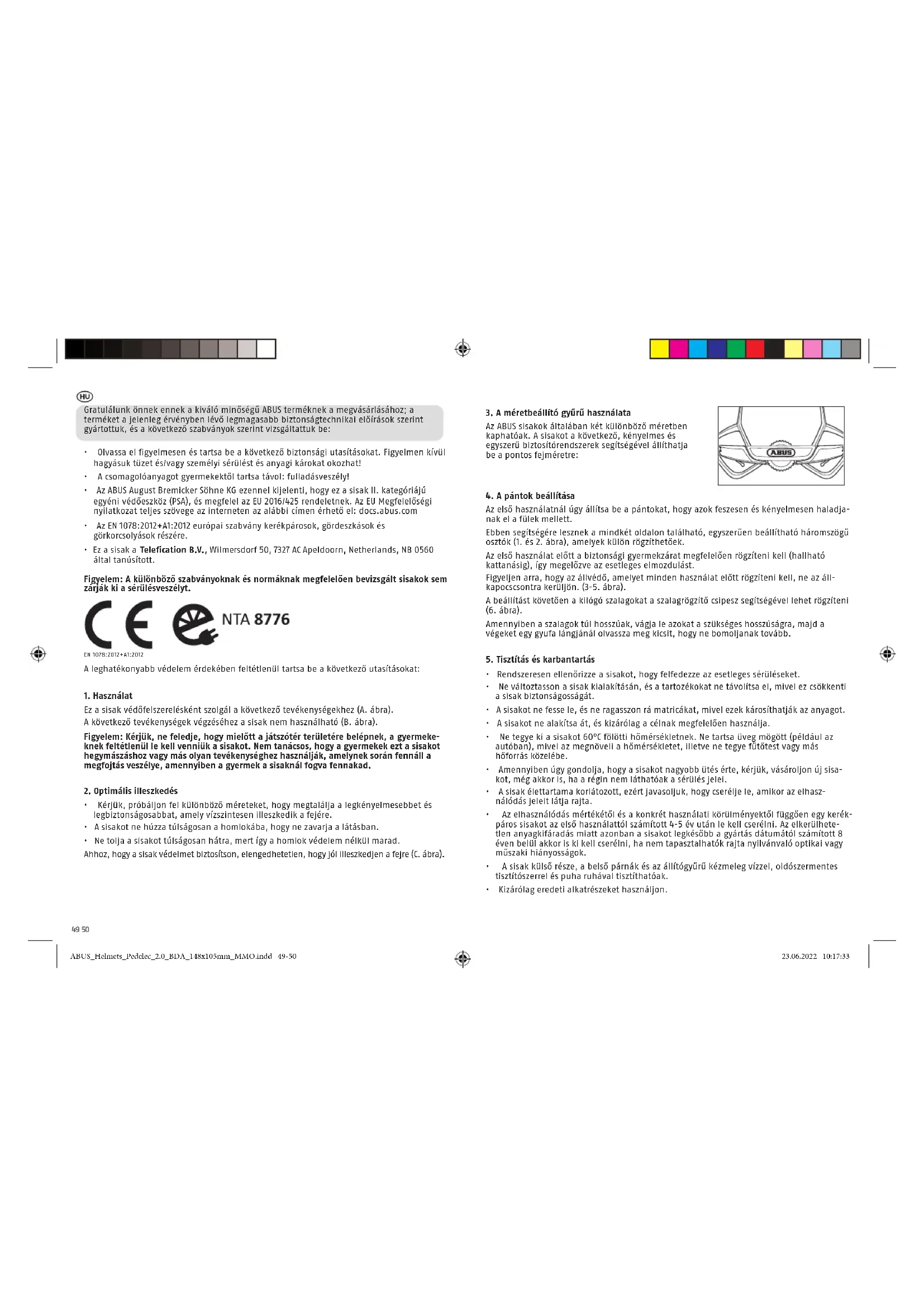 - Az ABUS August Bremicker Söhne KG ezennel kijelenti, hogy ez a sisak II. kategóriájú egyéni védőeszköz (PSA), és megfelel az EU 2016/425 rendeletnek. Az EU Megfelelőségi nyilatkozat teljes szövege az interneten az alábbi címen érhető el: docs.abus.com