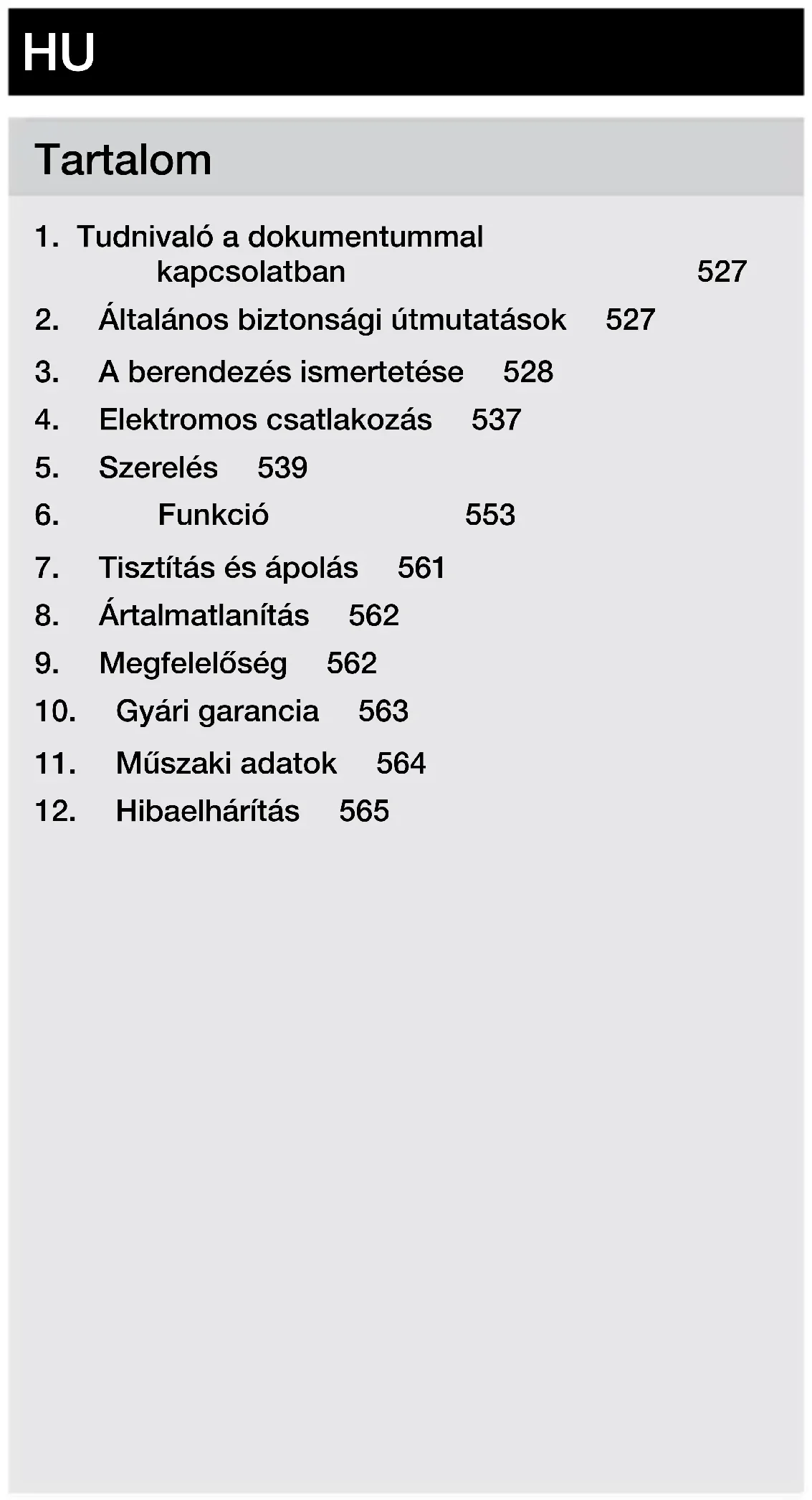 - Tartsa azokat jól hozzáférhető helyen. – Áram alatt végzett munka veszélyes helyzetek kialakulá- sához vezethet. Áram alatt lévő alkatrészek megérintése áramütéshez, égési sérülésekhez vagy halálos baleset- hez vezethet. – Hálózati feszültségen munkát csak szakképzett szak- emberek végezhetnek. – Tartsa be az adott országban hatályos villanyszerelési előírásokat és bekötési feltételeket (pl. DE: VDE0100, AT:ÖVE-ÖNORM E8001-1, CH:SEV1000). – Csak eredeti pótalkatrészeket használjon. – Csak szaküzemek általi javítás megengedett.– 528 – Tartalom