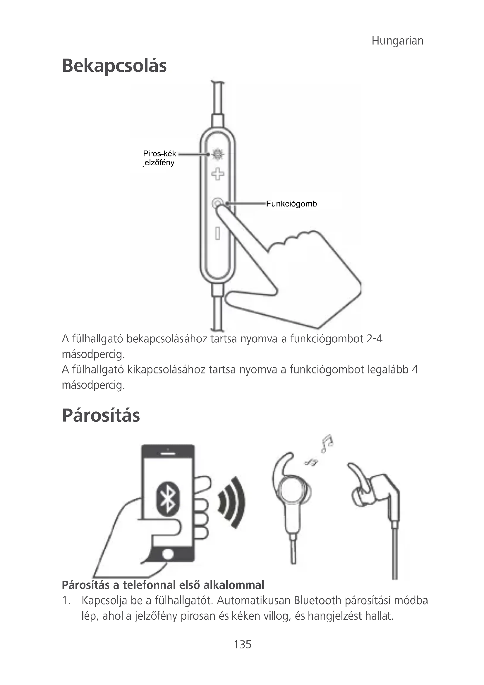 A fülhallgató bekapcsolásához tartsa nyomva a funkciógombot 2-4 másodpercig. A fülhallgató kikapcsolásához tartsa nyomva a funkciógombot legalább 4 másodpercig. Párosítás Párosítás a telefonnal első alkalommal
