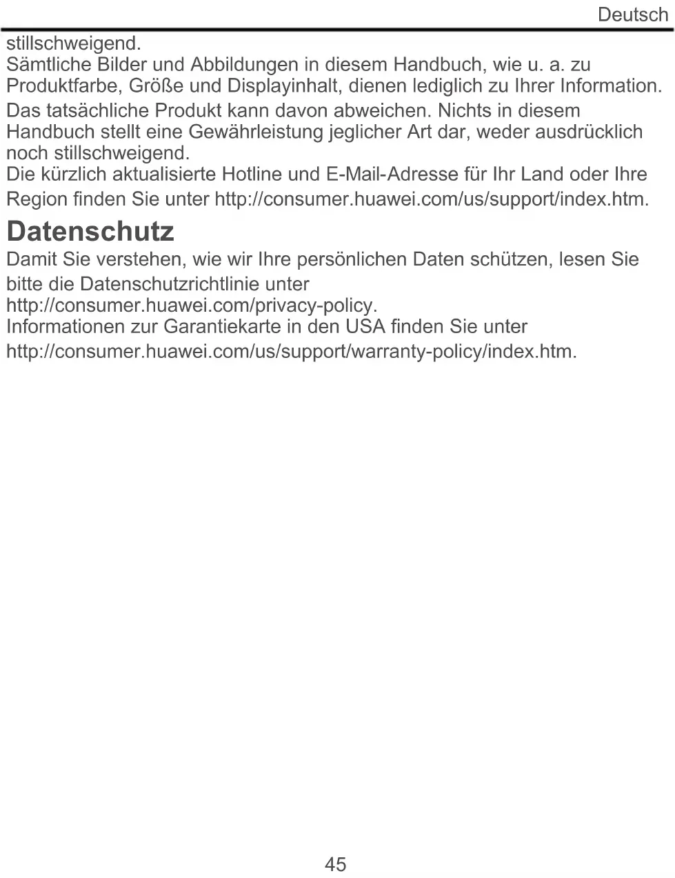Adatvédelem A személyes adatainak védelmével kapcsolatos részletekért keresse fel a http://consumer.huawei.com/privacy-policy weboldalt, és olvassa el az adatvédelmi irányelveinket. Az Egyesült Államokra vonatkozó garanciakártya információit a következő weboldalon találja: http://consumer.huawei.com/us/support/warranty-policy/index.htm.Italiano