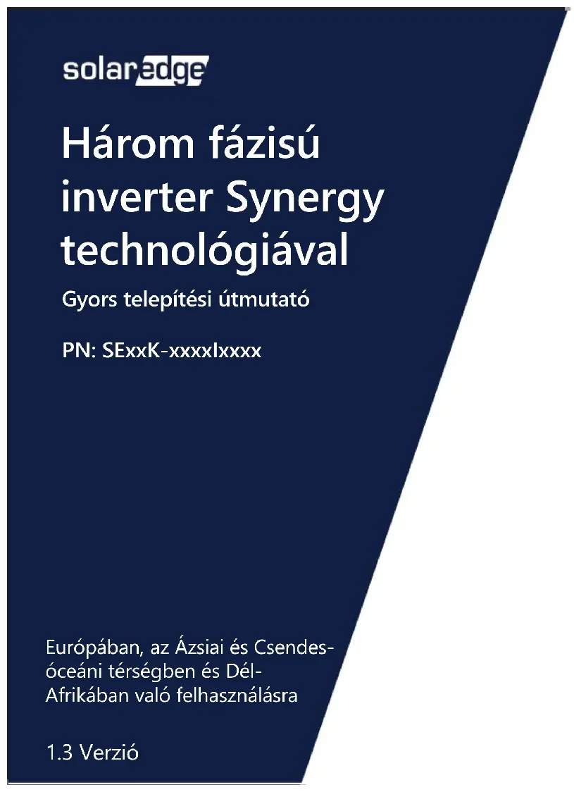 Ez a jel olyan információt jelöl, amely a felhasználót a termék lehető legjobb használatában támogatja. Ez a szimbólum a SolarEdge berendezés földelési pontjainál jelenik meg. VIGYÁZAT! Veszélyt jelöl. Olyan eljárásra hívja fel a figyelmet, amelynek nem megfelelő módú kivitelezése vagy nem pontos betartása a termék károsodásához vagy megsemmisüléséhez vezethet. A Vigyázat jelzés után ne folytassa a munkát, amíg a jelzett feltételeket tökéletesen meg nem érti és azok nem teljesültek. A fő áramköri lapon kapcsolja BE/KI az AC kapcsolót és várjon 5 percet FIGYELMEZTETÉS! Veszélyt jelöl. Olyan eljárásra hívja fel a figyelmet, amelynek nem megfelelő módú kivitelezése vagy nem pontos betartása személyi sérüléshez vagy halálhoz vezethet. A Figyelmeztetés jelzés után ne folytassa a munkát, amíg a jelzett feltételeket tökéletesen meg nem érti és azok nem teljesültek. A Synergy Menedzseren kapcsolja BE/KI a DC biztonsági kapcsolót és várjon 5 percet (Csak a DC biztonsági kapcsolóval felszerelt modellek esetében) Ne vágja le a kábelek csatlakozóit