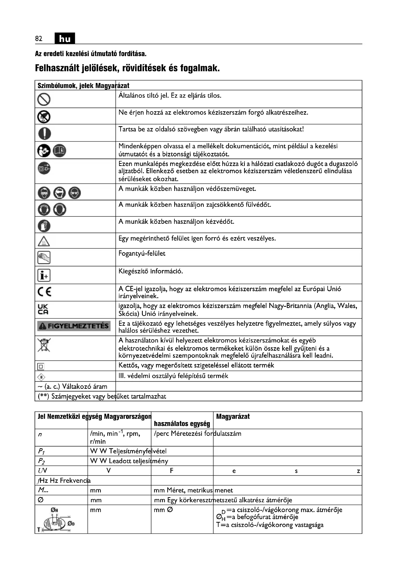 Az eredeti kezelési útmutató fordítása. Felhasznált jelölések, rövidítések és fogalmak. Szimbólumok, jelek Magyarázat Általános tiltó jel. Ez az eljárás tilos. Ne érjen hozzá az elektromos kéziszerszám forgó alkatrészeihez. Tartsa be az oldalsó szövegben vagy ábrán található utasításokat! Mindenképpen olvassa el a mellékelt dokumentációt, mint például a kezelési útmutatót és a biztonsági tájékoztatót. Ezen munkalépés megkezdése előtt húzza ki a hálózati csatlakozó dugót a dugaszoló aljzatból. Ellenkező esetben az elektromos kéziszerszám véletlenszerű elindulása sérüléseket okozhat. A munkák közben használjon védőszemüveget. A munkák közben használjon zajcsökkentő fülvédőt. A munkák közben használjon kézvédőt. Egy megérinthető felület igen forró és ezért veszélyes. Fogantyú-felület Kiegészítő információ. A CE-jel igazolja, hogy az elektromos kéziszerszám megfelel az Európai Unió irányelveinek. igazolja, hogy az elektromos kéziszerszám megfelel Nagy-Britannia (Anglia, Wales, Skócia) Unió irányelveinek. Ez a tájékozató egy lehetséges veszélyes helyzetre figyelmeztet, amely súlyos vagy halálos sérüléshez vezethet. A használaton kívül helyezett elektromos kéziszerszámokat és egyéb elektrotechnikai és elektromos termékeket külön össze kell gyűjteni és a környezetvédelmi szempontoknak megfelelő újrafelhasználásra kell leadni. Kettős, vagy megerősített szigeteléssel ellátott termék