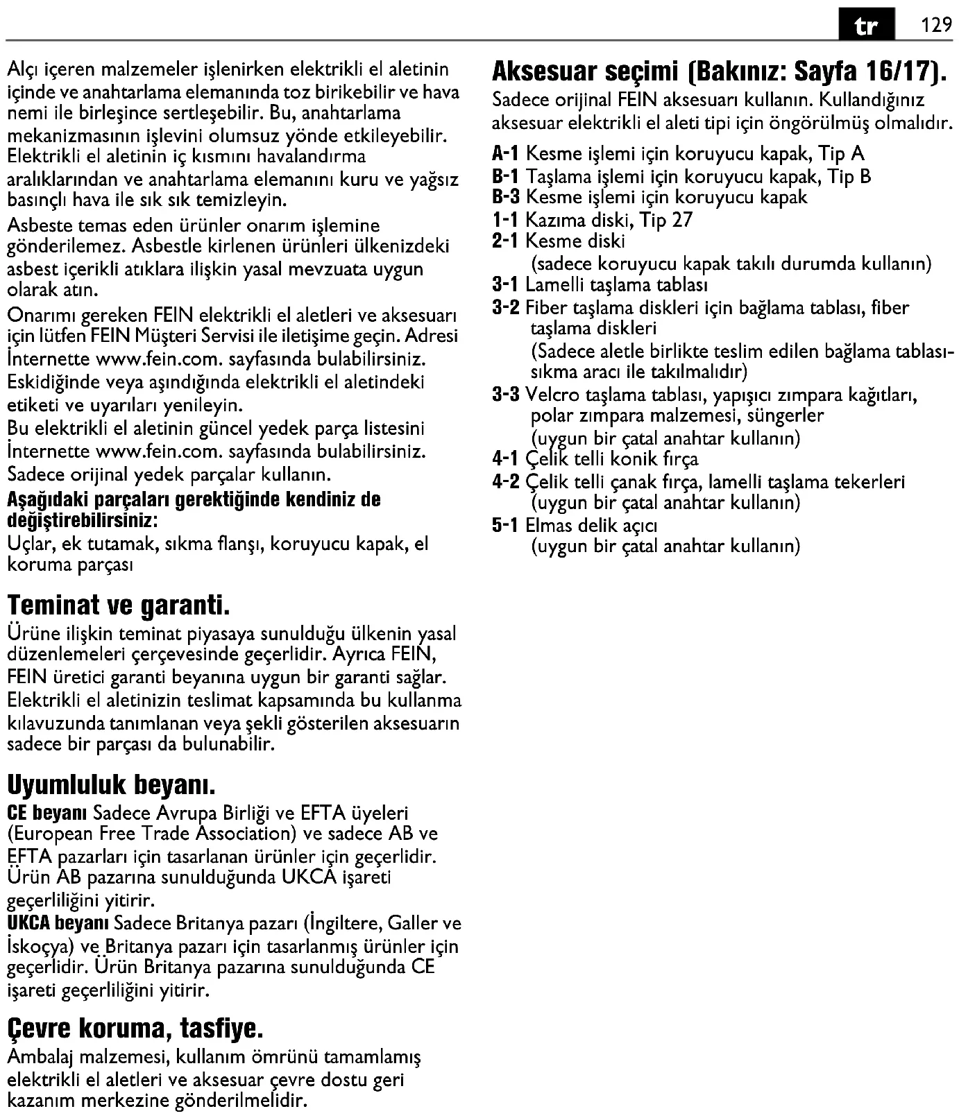 A javításra szoruló FEIN elektromos kéziszerszámokkal és tartozékokkal forduljon a FEIN Vevőszolgálathoz. A címet a www.fein.com címen találhatja meg. Ha elhalványul, vagy elkopik, tegyen fel új figyelmeztető címkéket az elektromos kéziszerszámra. Ennek az elektromos kéziszerszámnak a pillanatnyilag érvényes pótalkatrész-listáját az interneten a www.fein.com címen találhatja meg. Csak eredeti pótalkatrészeket használjon. A következő alkatrészeket szükség esetén Ön is kicserélheti: Betétszerszámok, pótfogantyú, befogó karimák, védőbúra, kézvédő Jótállás és szavatosság. A termékre vonatkozó jótállás a forgalomba hozási országban hatályos törvényes rendelkezéseknek megfelelően érvényes. Termékeinket ezen túlmenően a FEIN jótállási nyilatkozatában leírtaknak megfelelő kiterjesztett garanciával szállítjuk. Az elektromos kéziszerszám szállítási terjedelmében lehet, hogy az ezen kezelési útmutatóban leírásra vagy ábrázolásra került tartozékoknak csak egy része található meg. Megfelelőségi nyilatkozat. A CE-nyilatkozat csak az Európai Unió és az EFTA (Európai Szabadkereskedelmi Társulás) országaira és csak azokra a termékekre érvényes, amelyek az EU- vagy EFTA-piac számára kerültek gyártásra. A terméknek az EU-piacon való forgalombahozatala után az UKCA-jel érvényét veszti. Az UKCA-nyilatkozat csak a brit piacra (Angliára, Walesre és Skóciára) és csak azokra a termékekre vonatkozik, amelyek a brit piac számára kerültek gyártásra. A terméknek a brit piacon való forgalombahozatala után a CE-jel érvényét veszti. Környezetvédelem, hulladékkezelés. A csomagolásokat, a selejtes elektromos kéziszerszámokat és tartozékokat a környezetvédelmi szempontoknak megfelelően kell újra felhasználni. A tartozék kiválasztása (lásd a 16/17 oldalon). Csak eredeti FEIN gyártmányú tartozékokat használjon. A tartozéknak az adott elektromos kéziszerszám típusához kell szolgálnia. A-1 Védőbúra daraboláshoz, „A” típus B-1 Védőbúra csiszoláshoz, „B” típus B-3 Védőburkolat daraboláshoz 1-1 Nagyoló tárcsa, 27. típus 2-1 Hasítókorong (csak a berendezésre felszerelt védőburkolattal szabad használni) 3-1 Lamellás csiszolótányér 3-2 Támasztótányér a rostszálas csiszolókorongokhoz, rostszálas csiszolókorongok (csak a készülékkel szállított támasztótányér- befogó eszközzel szabad felszerelni) 3-3 Csiszoló tányér tépőzáras vagy tapadó csiszolólapokkal, tapadó bundás csiszolólapokkal, szivaccsal (használjon hozzá egy megfelelő villáskulcsot) 4-1 Acéldrótos kúpalakú kefe 4-2 Acéldrót edénykefe, lamellás csiszolókerekek (használjon hozzá egy megfelelő villáskulcsot) 5-1 Gyémántbetétes lyukvágó (használjon hozzá egy megfelelő villáskulcsot)139