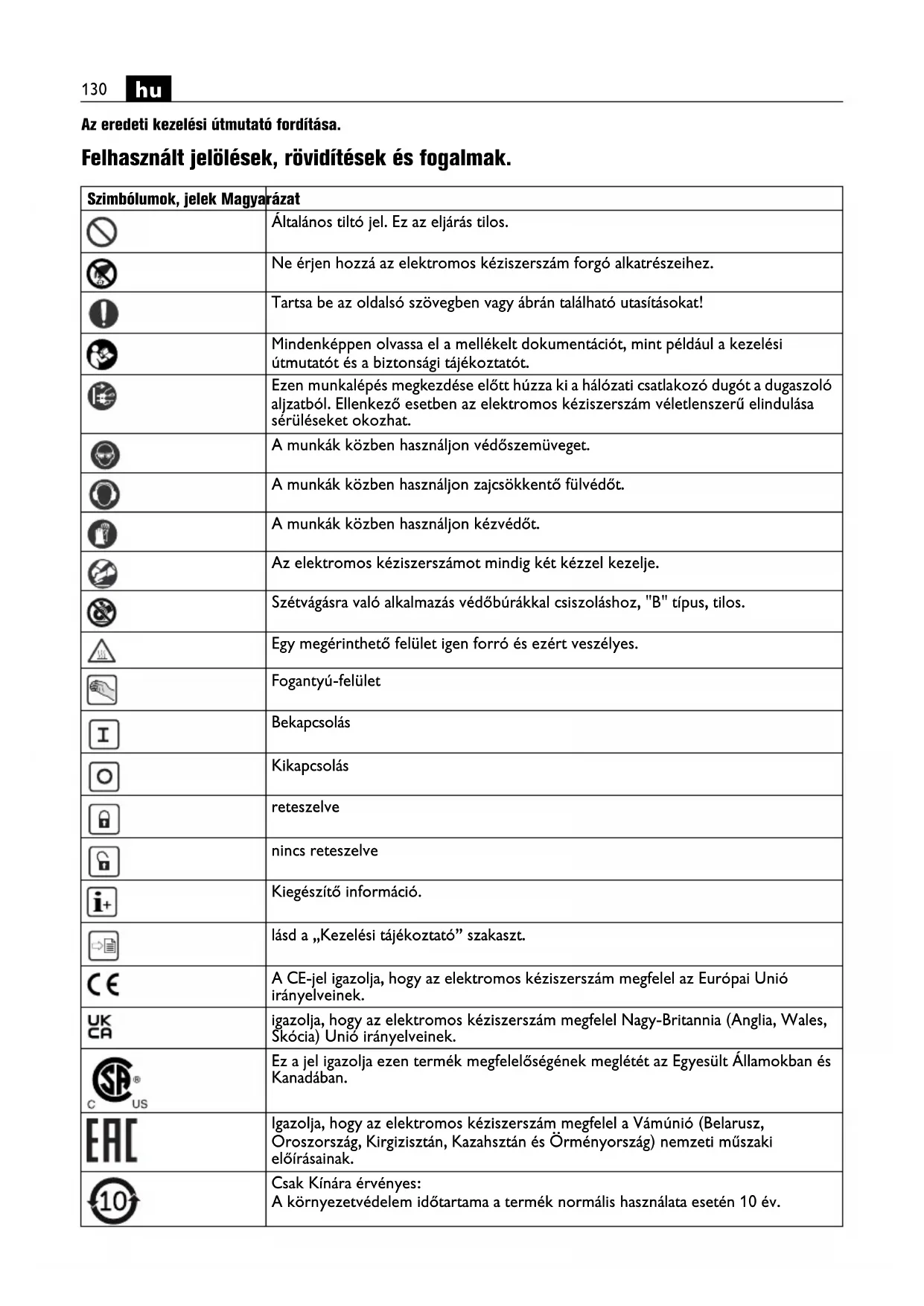 Az eredeti kezelési útmutató fordítása. Felhasznált jelölések, rövidítések és fogalmak. Szimbólumok, jelek Magyarázat Általános tiltó jel. Ez az eljárás tilos. Ne érjen hozzá az elektromos kéziszerszám forgó alkatrészeihez. Tartsa be az oldalsó szövegben vagy ábrán található utasításokat! Mindenképpen olvassa el a mellékelt dokumentációt, mint például a kezelési útmutatót és a biztonsági tájékoztatót. Ezen munkalépés megkezdése előtt húzza ki a hálózati csatlakozó dugót a dugaszoló aljzatból. Ellenkező esetben az elektromos kéziszerszám véletlenszerű elindulása sérüléseket okozhat. A munkák közben használjon védőszemüveget. A munkák közben használjon zajcsökkentő fülvédőt. A munkák közben használjon kézvédőt. Az elektromos kéziszerszámot mindig két kézzel kezelje. Szétvágásra való alkalmazás védőbúrákkal csiszoláshoz, "B" típus, tilos. Egy megérinthető felület igen forró és ezért veszélyes. Fogantyú-felület Bekapcsolás Kikapcsolás reteszelve nincs reteszelve Kiegészítő információ. lásd a „Kezelési tájékoztató” szakaszt. A CE-jel igazolja, hogy az elektromos kéziszerszám megfelel az Európai Unió irányelveinek. igazolja, hogy az elektromos kéziszerszám megfelel Nagy-Britannia (Anglia, Wales, Skócia) Unió irányelveinek. Ez a jel igazolja ezen termék megfelelőségének meglétét az Egyesült Államokban és Kanadában. Igazolja, hogy az elektromos kéziszerszám megfelel a Vámúnió (Belarusz, Oroszország, Kirgizisztán, Kazahsztán és Örményország) nemzeti műszaki előírásainak. Csak Kínára érvényes: A környezetvédelem időtartama a termék normális használata esetén 10 év.131