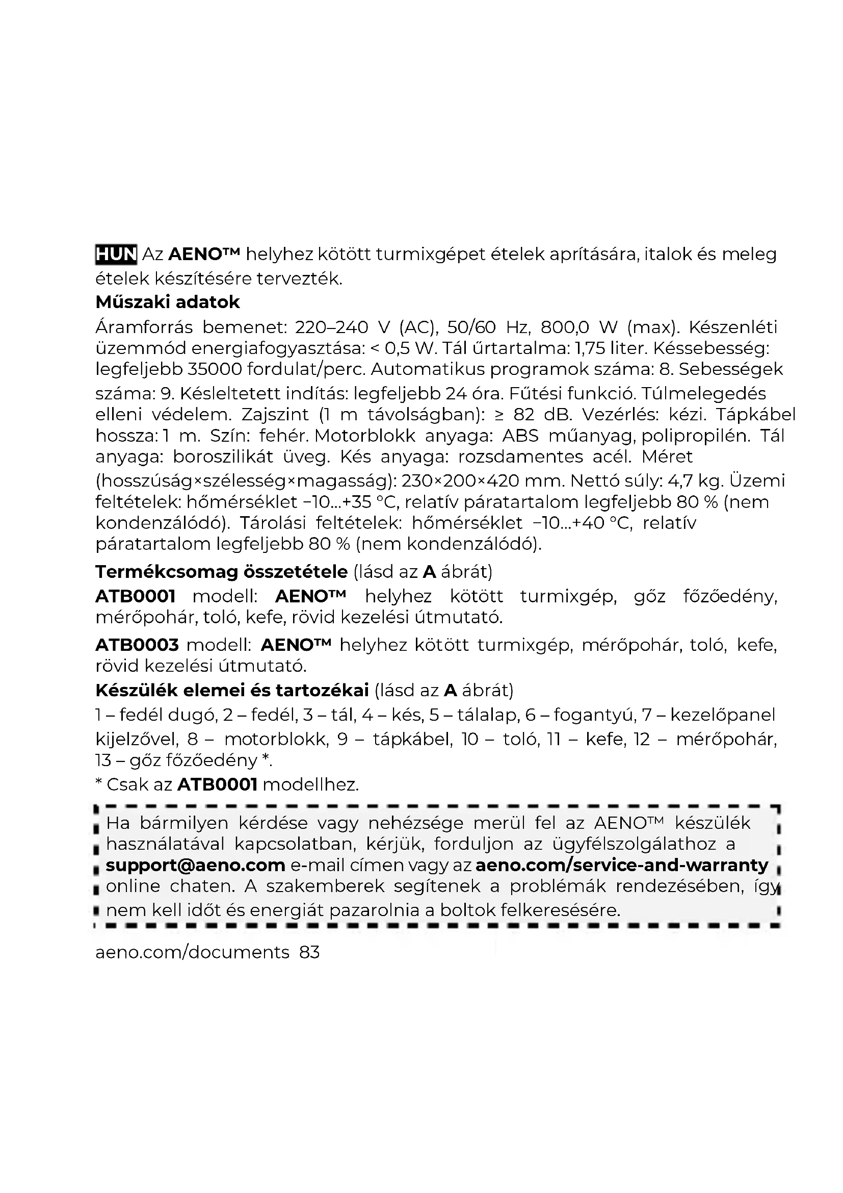 - Csak az ATB0001 modellhez. Ha bármilyen kérdése vagy nehézsége merül fel az AENO™ készülék használatával kapcsolatban, kérjük, forduljon az ügyfélszolgálathoz a support@aeno.com e-mail címen vagy az aeno.com/service-and-warranty online chaten. A szakemberek segítenek a problémák rendezésében, így nem kell időt és energiát pazarolnia a boltok felkeresésére.84 aeno.com/documents Korlátozások és figyelmeztetések FIGYELEM! Elektromos áramütés veszélye nem zárható ki. FIGYELEM! Óvatosan bánjon az éles késsel és óvatosan ürítse a tálat. Legyen óvatos a tisztítás során is. A készülék működése közben ne érintsen meg semmilyen mozgó alkatrészt. FIGYELEM! A készülék egyes részei felforrósodhatnak és égési sérüléseket okozhatnak! Ne nyúljon a készülék táljához és fedeléhez védőfelszerelés nélkül vagy addig, amíg azok teljesen ki nem hűltek. FIGYELEM! Ne lépje túl a forró ("Soup") (1400 ml) és a hideg ("Cold") (1750 ml) folyadékok maximális szintjét (lásd a B ábrát), ez túlfolyást okozhat. FIGYELEM! A hosszú növényi szárak működés közben a kés köré tekeredhetnek, és károsíthatják a készülék motorját. Ha a növényi szárakat kíván turmixgéppel aprítani, vágja fel őket úgy, hogy a szárdarabok legfeljebb 1 cm hosszúak legyenek. FIGYELEM! Ne aprítson csontos és/vagy porcos húst, magos gyümölcsöt, keményhéjas dióféléket a turmixgépben. Előzetesen távolítsa el a csontokat, porcokat, magokat és héjakat, hogy elkerülje a kés sérülését. Ezt a készüléket 16 év alatti gyermekek vagy csökkent fizikai, pszichikai vagy szellemi képességű személyek nem használhatják, ha kellő tapasztalattal és tudással nem rendelkeznek a készülék használatában, és nem felügyelik őket a biztonságukért felelős személy. A készüléket kizárólag háztartási környezetben történő használatra szánták. Ne használja a készüléket kültéren. Ne engedje, hogy gyermekek játsszanak a készülékkel és tartozékaival. Ne ejtse le vagy dobja el a készüléket. Ne használjon sérült készüléket. Ha a készüléket alacsony hőmérsékleten szállították vagy tárolták, használat előtt hagyja szobahőmérsékleten 2 órán át. Győződjön meg arról, hogy a műszaki adatokban feltüntetett névleges feszültség és frekvencia megegyezik az elektromos hálózat paramétereivel. A készüléket csak száraz kézzel kezelje. Ne hagyja a készüléket felügyelet nélkül a hálózatra csatlakoztatva. Használat után és tisztítás előtt húzza ki a készülék csatlakozóját a konnektorból. A készüléket a hálózati csatlakozót, nem pedig a tápkábelt megfogva válassza le a hálózatról.aeno.com/documents 85 Ne merítse a készüléket, a tápkábel dugóját vagy magát a kábelt (9) vízbe vagy más folyadékba. Győződjön meg arról, hogy a tápkábel nincs megcsavarodva, elgörbülve, nem nyomódik semmihez, nem érintkezik forró, éles tárgyakkal vagy hőforrásokkal. Ne tárolja a motorblokkot (8) és a tálat (3) a hűtőszekrényben. Ne nyissa ki a fedelet (2), amíg a kés (4) teljesen meg nem áll. Ne tegyen cukrot a tálba, mert az a tál aljára éghet. Ne használjon kémiailag agresszív tisztítószereket, csiszoló pasztákat, savakat és oldószereket tartalmazó anyagokat vagy fémszivacsokat a készülék tisztításához. A készülék részletes leírása, üzemmódjai és funkciói az aeno.com/documents weboldalon elérhető teljes kezelési útmutatóban találhatók. Automatikus programok (lásd a C ábrát)