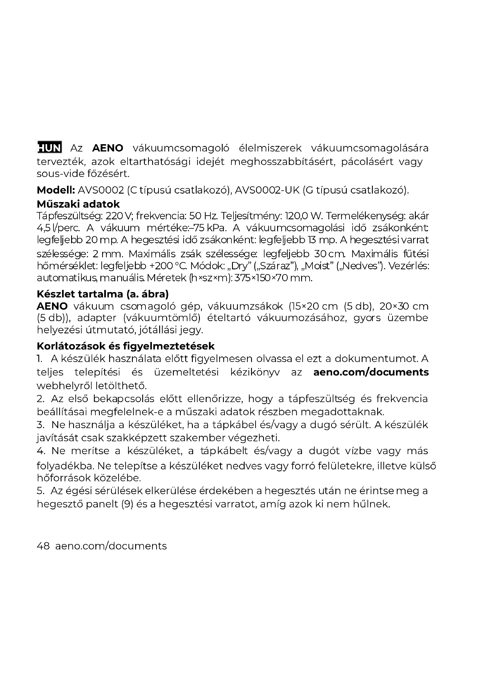 - Krhki brtveni šav. Mogući uzrok: nedovoljno vrijeme brtvljenja. Rješenje: ponovite postupak brtvljenja još jednom. POZOR! Ako ništa od navedenoga ne riješi vaš problem, obratite se svom dobavljaču ili servisnom centru. Nemojte rastavljati uređaj i ne pokušavajte ga sami popraviti. Ovaj simbol znači da prilikom odlaganja uređaja, njegovih baterija i akumulatora te njegovog električnog i elektroničkog pribora morate slijediti propise o zbrinjavanja otpada električne i elektroničke opreme (WEEE) te o zbrinjavanju otpadnih baterija i akumulatora. U skladu s propisima ova oprema prikuplja se odvojeno na kraju uporabnog roka. Uređaj, njegove baterije i akumulatori te njegov električni i elektronički pribor ne smiju se odlagati skupa s nerazvrstanim komunalnim otpadom jer to šteti okolišu. U svrhu urednog odlaganja ovakve opreme, morate je vratiti u prodajno mjesto ili u vaš lokalni centar za reciklažu. Za detaljne informacije obratite se lokalnoj službi za zbrinjavanje komunalnog otpada. ASBISc zadržava pravo modificiranja uređaja te unošenja dopuna i izmjena u ovaj dokument bez prethodne najave korisnicima. Jamstveni rok i radna trajnost je 2 godine od datuma nabavke proizvoda. Podaci o proizvođaču: ASBISc Enterprises PLC, Iapetou, 1, Agios Athanasios, 4101, Limassol, Cyprus (Cipar). Proizvedeno u Kini. Ažurirane informacije i detaljan opis uređaja te upute za spajanje, certifikati, podaci o tvrtkama koje primaju reklamacije glede kvalitete i jamstva dostupne su za preuzimanje na poveznici aeno.com/documents. Svi navedeni zaštitni znakovi i njihova imena su vlasništvo njihovih vlasnika.48 aeno.com/documents HUN Az AENO vákuumcsomagoló élelmiszerek vákuumcsomagolására tervezték, azok eltarthatósági idejét meghosszabbításért, pácolásért vagy sous-vide főzésért. Modell: AVS0002 (C típusú csatlakozó), AVS0002-UK (G típusú csatlakozó). Műszaki adatok Tápfeszültség: 220 V; frekvencia: 50 Hz. Teljesítmény: 120,0 W. Termelékenység: akár 4,5 l/perc. A vákuum mértéke:–75 kPa. A vákuumcsomagolási idő zsákonként: legfeljebb 20 mp. A hegesztési idő zsákonként: legfeljebb 13 mp. A hegesztési varrat szélessége: 2 mm. Maximális zsák szélessége: legfeljebb 30 cm. Maximális fűtési hőmérséklet: legfeljebb +200 °C. Módok: „Dry” („Száraz”), „Moist” („Nedves”). Vezérlés: automatikus, manuális. Méretek (h×sz×m): 375×150×70 mm. Készlet tartalma (a. ábra) AENO vákuum csomagoló gép, vákuumzsákok (15×20 cm (5 db), 20×30 cm (5 db)), adapter (vákuumtömlő) ételtartó vákuumozásához, gyors üzembe helyezési útmutató, jótállási jegy. Korlátozások és figyelmeztetések