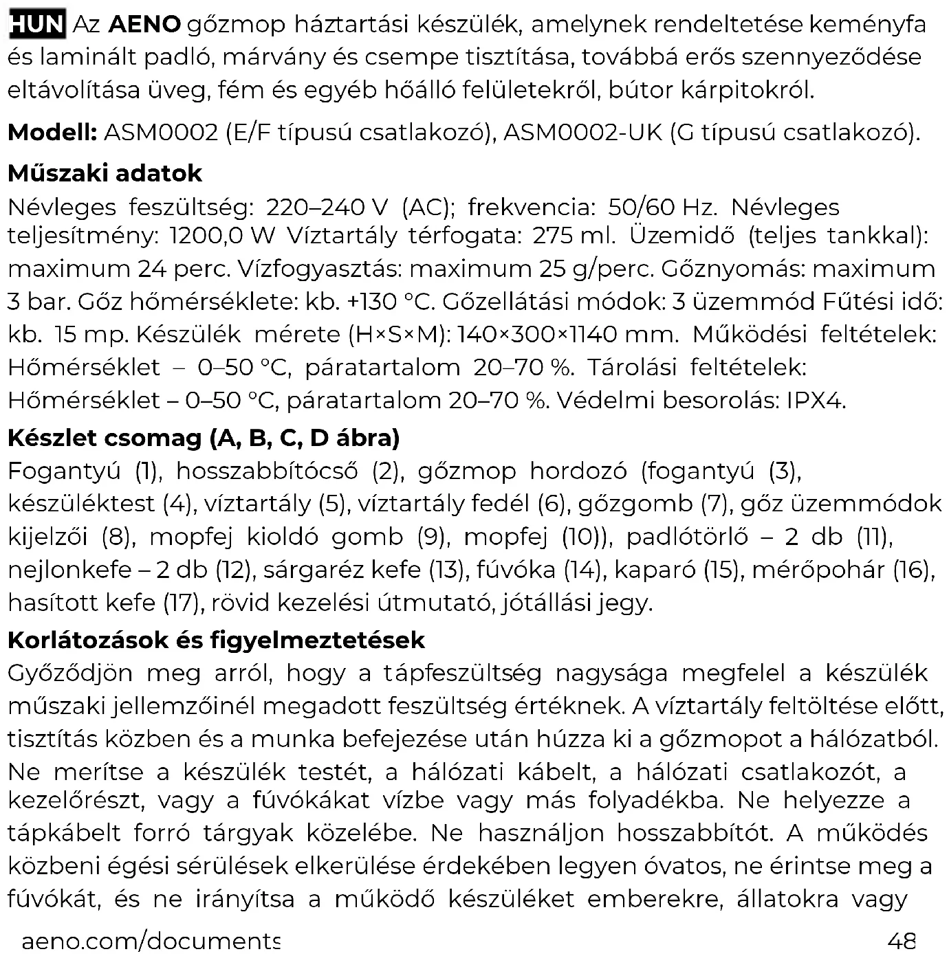 HUN Az AENO gőzmop háztartási készülék, amelynek rendeltetése keményfa és laminált padló, márvány és csempe tisztítása, továbbá erős szennyeződése eltávolítása üveg, fém és egyéb hőálló felületekről, bútor kárpitokról. Modell: ASM0002 (E/F típusú csatlakozó), ASM0002-UK (G típusú csatlakozó). Műszaki adatok Névleges feszültség: 220–240 V (AC); frekvencia: 50/60 Hz. Névleges teljesítmény: 1200,0 W Víztartály térfogata: 275 ml. Üzemidő (teljes tankkal): maximum 24 perc. Vízfogyasztás: maximum 25 g/perc. Gőznyomás: maximum 3 bar. Gőz hőmérséklete: kb. +130 °C. Gőzellátási módok: 3 üzemmód Fűtési idő: kb. 15 mp. Készülék mérete (H×S×M): 140×300×1140 mm. Működési feltételek: Hőmérséklet – 0–50 °C, páratartalom 20–70 %. Tárolási feltételek: Hőmérséklet – 0–50 °C, páratartalom 20–70 %. Védelmi besorolás: IPX4. Készlet csomag (A, B, C, D ábra) Fogantyú (1), hosszabbítócső (2), gőzmop hordozó (fogantyú (3), készüléktest (4), víztartály (5), víztartály fedél (6), gőzgomb (7), gőz üzemmódok kijelzői (8), mopfej kioldó gomb (9), mopfej (10)), padlótörlő – 2 db (11), nejlonkefe – 2 db (12), sárgaréz kefe (13), fúvóka (14), kaparó (15), mérőpohár (16), hasított kefe (17), rövid kezelési útmutató, jótállási jegy. Korlátozások és figyelmeztetések Győződjön meg arról, hogy a tápfeszültség nagysága megfelel a készülék műszaki jellemzőinél megadott feszültség értéknek. A víztartály feltöltése előtt, tisztítás közben és a munka befejezése után húzza ki a gőzmopot a hálózatból. Ne merítse a készülék testét, a hálózati kábelt, a hálózati csatlakozót, a kezelőrészt, vagy a fúvókákat vízbe vagy más folyadékba. Ne helyezze a tápkábelt forró tárgyak közelébe. Ne használjon hosszabbítót. A működés közbeni égési sérülések elkerülése érdekében legyen óvatos, ne érintse meg a fúvókát, és ne irányítsa a működő készüléket emberekre, állatokra vagy49