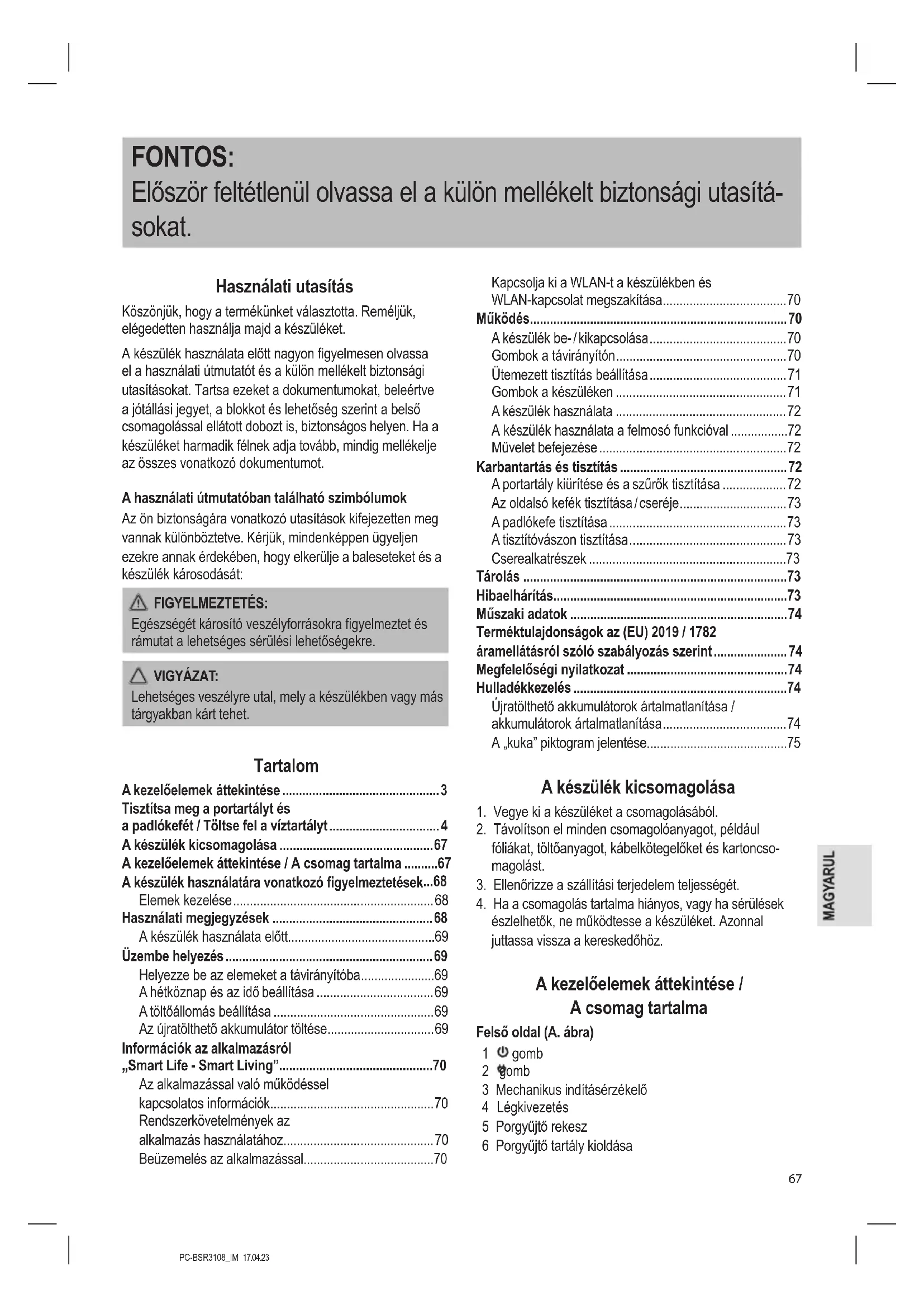 - A kezelőelemek áttekintése / A csomag tartalma A készülék használatára vonatkozó gyelmeztetések p. 67