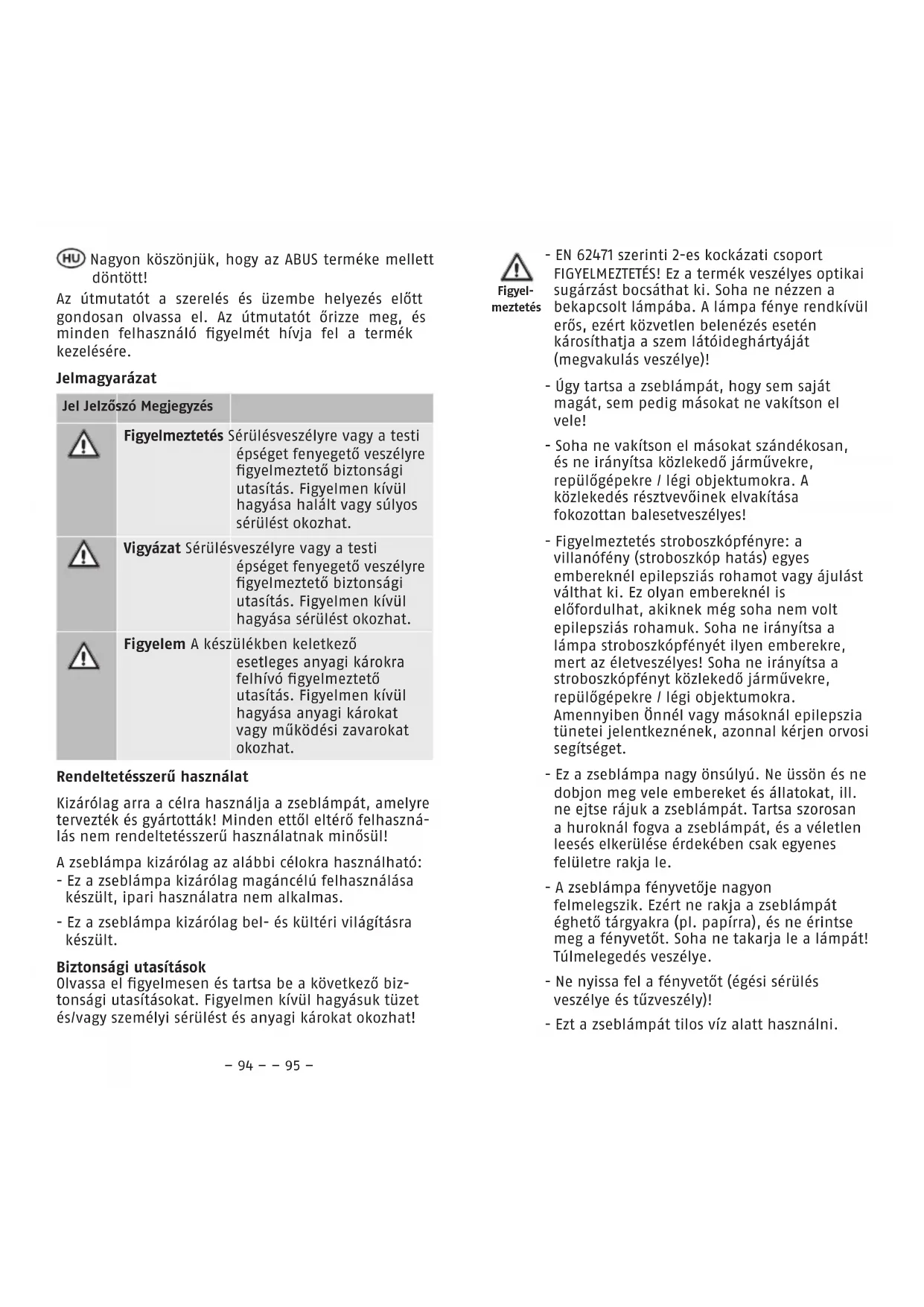 otvárať zatvárať– 92 – – 93 – menším svetelným kužeľom zasvietite do diaľky. Keď batérie zoslabnú, svetlo začne mihotať a zníži sa jeho intenzita. Batérie hneď vymeňte za 3 nové 1,5 V alkalické batérie C. Odporúčame používať kvalitné značkové batérie, napr. Panasonic, Varta alebo Duracell. Technické údaje Typ batérií 3x 1,5 V alkalické C Trieda ochrany IP44 Režim intenzívny/menej intenzívny/červené svetlo/ vypnuté//dlhé podržanie: blikanie Trvanie svietenia 500 lumenov: cca 3 h, 250 lumenov: cca 5,5 h Max. dosah 200 m Teplota skladovania +10°C až +35°C Rozsah prevádzkovej teploty -20°C až +40°C Materiál hliník a PC Rozmery cca 260 x 44 x 31,7 mm Hmotnosť netto cca 380 g (bez batérií) Vyhlásenie o zhode Spoločnosť ABUS August Bremicker Söhne KG, Altenhofer Weg 25, 58300 Wetter týmto vyhlasuje, že baterka TL-525 je pri použití v súlade s predpísaným účelom v súlade so základnými požiadavkami a ostatnými príslušnými ustanoveniami smerníc 2014/30/ EÚ a 2011/65/EÚ. Úplné znenie vyhlásenia o zhode EÚ je možné vyžiadať na: info@abus.de. Likvidácia Obal likvidujte triedene. Lepenku a kartón dajte do zberového papiera, fólie a plastové diely do zberu recyklovateľných materiálov. Zlikvidujte zariadenie podľa smernice ES o odpade z elektrických a elektronických zariadení 2002/96/ ES – WEEE (Waste Electrical and Electronic Equipment). V prípade otázok sa obráťte na komunálny úrad zodpovedný za likvidáciu. Informácie o odberových miestach pre staré zariadenie nájdete napr. v miestnej obecnej, príp. mestskej správe, miestnych spoločnostiach zameraných na likvidáciu odpadu alebo u vášho predajcu. Nelikvidujte batérie v domovom odpade Záruka Výrobky spoločnosti ABUS sú skoncipované, vyrobené s najväčšou starostlivosťou a skontrolované podľa platných predpisov. Záruka sa vzťahuje výlučne na nedostatky, ktorých pôvodom je chyba materiálu alebo výrobná chyba. Pokiaľ je možné dokázať chybu materiálu alebo výrobnú chybu, spoločnosť ABUS po posúdení výrobok opraví alebo vymení. Záruka končí v týchto prípadoch uplynutím pôvodnej záručnej doby. Ďalšie nároky sú výslovne vylúčené. Spoločnosť ABUS neručí za nedostatky a poškodenia, ktoré vznikli vonkajšími vplyvmi (napr. prepravou, násilným pôsobením), neodbornou obsluhou, normálnym opotrebovaním a nedodržiavaním tohto návodu. Pri uplatňovaní nároku na záruku je potrebné k reklamovanému výrobku priložiť originálny doklad o nákupe s dátumom nákupu a krátky písomný popis chyby. Technické zmeny vyhradené. Za tlačové chyby a omyly nezodpovedáme WEEE-Reg.-Nr. DE79663011 © ABUS 2020 ABUS August Bremicker Söhne KG D 58292 Wetter | Germany. Tel.: +49 (0) 23 35 63 40 |– 94 – – 95 – Nagyon köszönjük, hogy az ABUS terméke mellett döntött! Az útmutatót a szerelés és üzembe helyezés előtt gondosan olvassa el. Az útmutatót őrizze meg, és minden felhasználó gyelmét hívja fel a termék kezelésére. Jel Jelzőszó Megjegyzés Figyelmeztetés Sérülésveszélyre vagy a testi épséget fenyegető veszélyre gyelmeztető biztonsági utasítás. Figyelmen kívül hagyása halált vagy súlyos sérülést okozhat. Vigyázat Sérülésveszélyre vagy a testi épséget fenyegető veszélyre gyelmeztető biztonsági utasítás. Figyelmen kívül hagyása sérülést okozhat. Figyelem A készülékben keletkező esetleges anyagi károkra felhívó gyelmeztető utasítás. Figyelmen kívül hagyása anyagi károkat vagy működési zavarokat okozhat. Jelmagyarázat Rendeltetésszerű használat Kizárólag arra a célra használja a zseblámpát, amelyre tervezték és gyártották! Minden ettől eltérő felhaszná- lás nem rendeltetésszerű használatnak minősül! A zseblámpa kizárólag az alábbi célokra használható: - Ez a zseblámpa kizárólag magáncélú felhasználása készült, ipari használatra nem alkalmas. - Ez a zseblámpa kizárólag bel- és kültéri világításra készült. Biztonsági utasítások Olvassa el gyelmesen és tartsa be a következő biz- tonsági utasításokat. Figyelmen kívül hagyásuk tüzet és/vagy személyi sérülést és anyagi károkat okozhat! - EN 62471 szerinti 2-es kockázati csoport FIGYELMEZTETÉS! Ez a termék veszélyes optikai sugárzást bocsáthat ki. Soha ne nézzen a bekapcsolt lámpába. A lámpa fénye rendkívül erős, ezért közvetlen belenézés esetén károsíthatja a szem látóideghártyáját (megvakulás veszélye)! - Úgy tartsa a zseblámpát, hogy sem saját magát, sem pedig másokat ne vakítson el vele! - Soha ne vakítson el másokat szándékosan, és ne irányítsa közlekedő járművekre, repülőgépekre / légi objektumokra. A közlekedés résztvevőinek elvakítása fokozottan balesetveszélyes! - Figyelmeztetés stroboszkópfényre: a villanófény (stroboszkóp hatás) egyes embereknél epilepsziás rohamot vagy ájulást válthat ki. Ez olyan embereknél is előfordulhat, akiknek még soha nem volt epilepsziás rohamuk. Soha ne irányítsa a lámpa stroboszkópfényét ilyen emberekre, mert az életveszélyes! Soha ne irányítsa a stroboszkópfényt közlekedő járművekre, repülőgépekre / légi objektumokra. Amennyiben Önnél vagy másoknál epilepszia tünetei jelentkeznének, azonnal kérjen orvosi segítséget. - Ez a zseblámpa nagy önsúlyú. Ne üssön és ne dobjon meg vele embereket és állatokat, ill. ne ejtse rájuk a zseblámpát. Tartsa szorosan a huroknál fogva a zseblámpát, és a véletlen leesés elkerülése érdekében csak egyenes felületre rakja le. - A zseblámpa fényvetője nagyon felmelegszik. Ezért ne rakja a zseblámpát éghető tárgyakra (pl. papírra), és ne érintse meg a fényvetőt. Soha ne takarja le a lámpát! Túlmelegedés veszélye. - Ne nyissa fel a fényvetőt (égési sérülés veszély