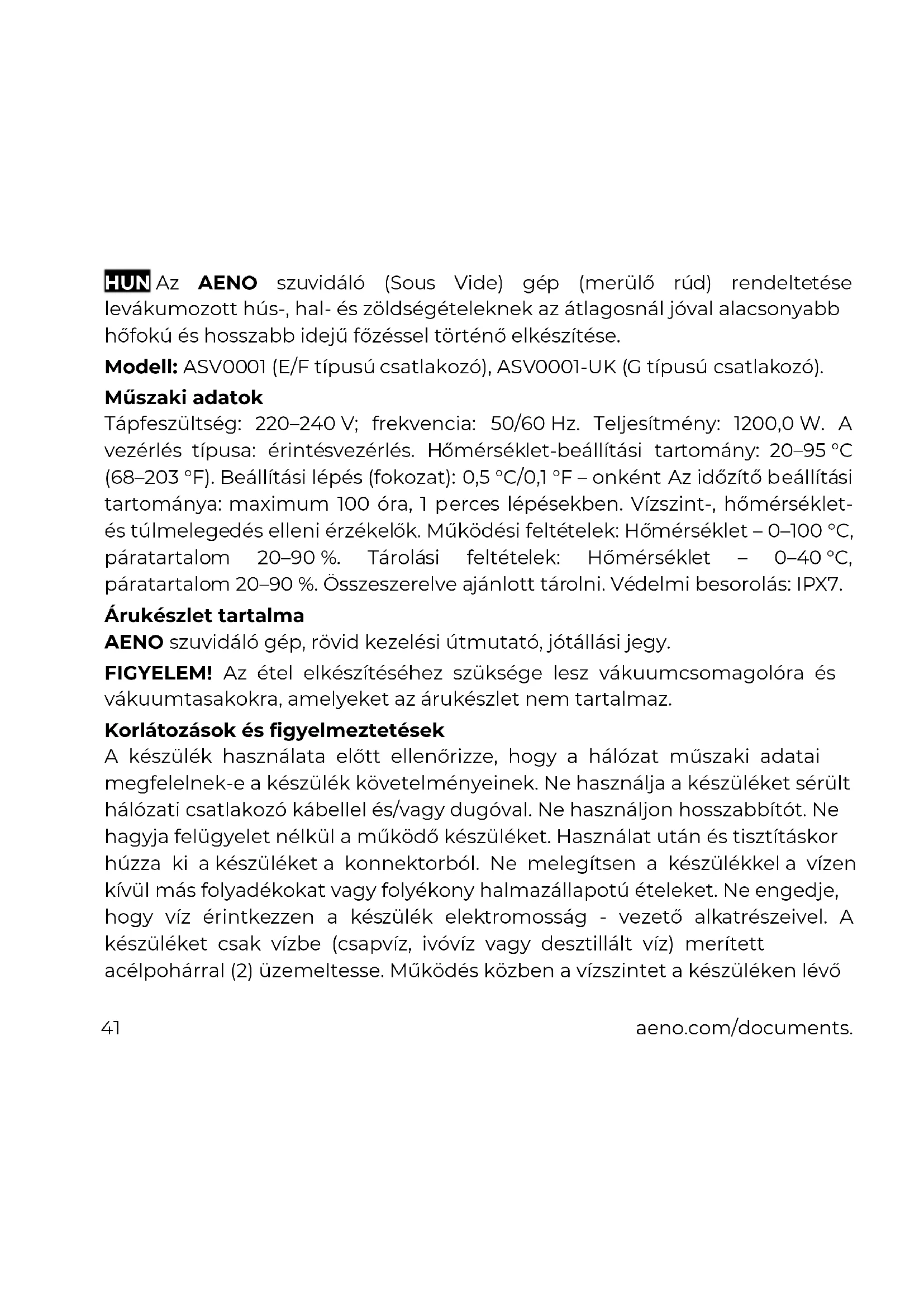 HUN Az AENO szuvidáló (Sous Vide) gép (merülő rúd) rendeltetése levákumozott hús-, hal- és zöldségételeknek az átlagosnál jóval alacsonyabb hőfokú és hosszabb idejű főzéssel történő elkészítése. Modell: ASV0001 (E/F típusú csatlakozó), ASV0001-UK (G típusú csatlakozó). Műszaki adatok Tápfeszültség: 220–240 V; frekvencia: 50/60 Hz. Teljesítmény: 1200,0 W. A vezérlés típusa: érintésvezérlés. Hőmérséklet-beállítási tartomány: 20–95 °C (68–203 °F). Beállítási lépés (fokozat): 0,5 °C/0,1 °F – onként Az időzítő beállítási tartománya: maximum 100 óra, 1 perces lépésekben. Vízszint-, hőmérséklet- és túlmelegedés elleni érzékelők. Működési feltételek: Hőmérséklet – 0–100 °C, páratartalom 20–90 %. Tárolási feltételek: Hőmérséklet – 0–40 °C, páratartalom 20–90 %. Összeszerelve ajánlott tárolni. Védelmi besorolás: IPX7. Árukészlet tartalma AENO szuvidáló gép, rövid kezelési útmutató, jótállási jegy. FIGYELEM! Az étel elkészítéséhez szüksége lesz vákuumcsomagolóra és vákuumtasakokra, amelyeket az árukészlet nem tartalmaz. Korlátozások és figyelmeztetések A készülék használata előtt ellenőrizze, hogy a hálózat műszaki adatai megfelelnek-e a készülék követelményeinek. Ne használja a készüléket sérült hálózati csatlakozó kábellel és/vagy dugóval. Ne használjon hosszabbítót. Ne hagyja felügyelet nélkül a működő készüléket. Használat után és tisztításkor húzza ki a készüléket a konnektorból. Ne melegítsen a készülékkel a vízen kívül más folyadékokat vagy folyékony halmazállapotú ételeket. Ne engedje, hogy víz érintkezzen a készülék elektromosság - vezető alkatrészeivel. A készüléket csak vízbe (csapvíz, ivóvíz vagy desztillált víz) merített acélpohárral (2) üzemeltesse. Működés közben a vízszintet a készüléken lévőaeno.com/documents