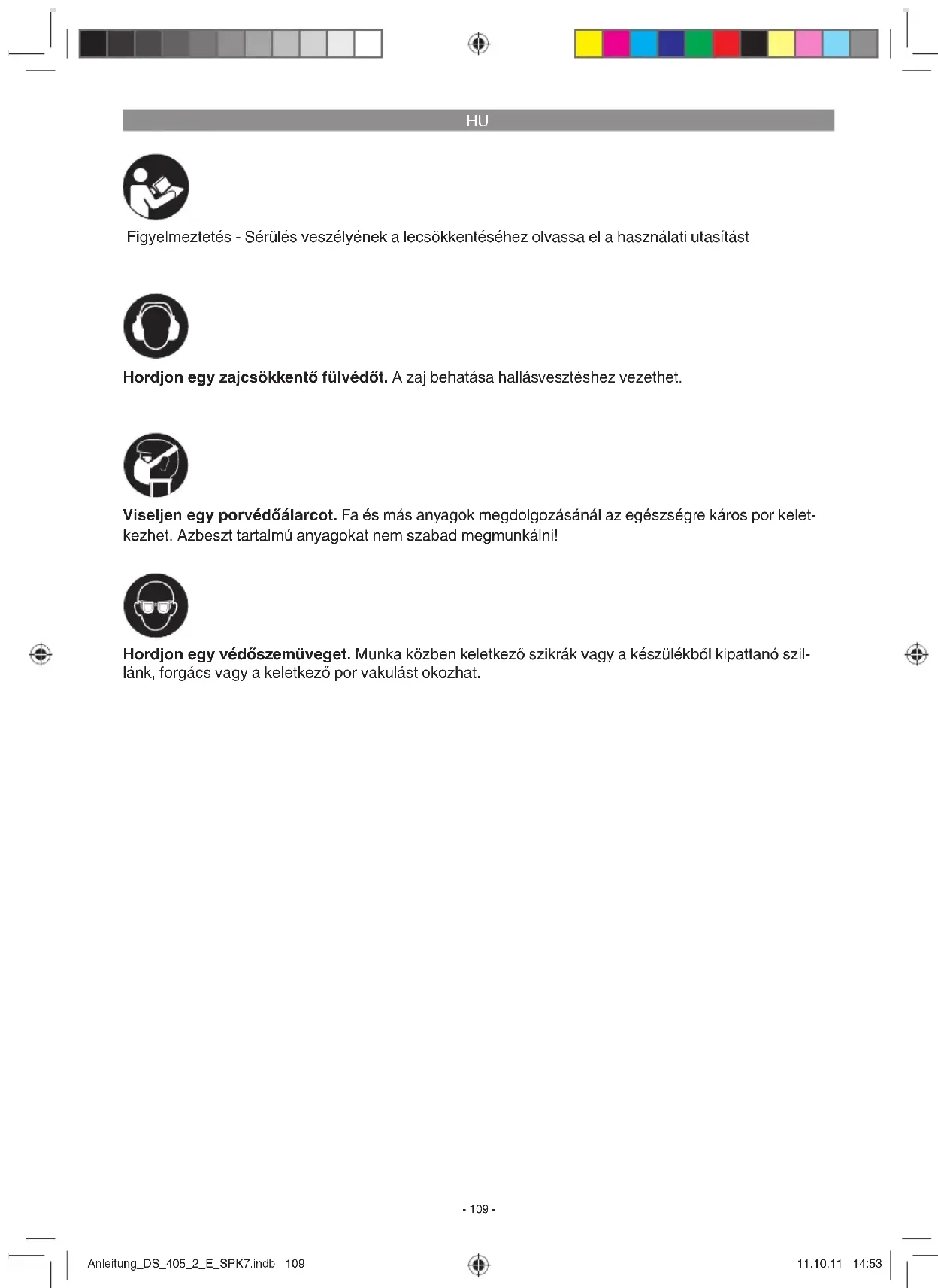 Figyelmeztetés - Sérülés veszélyének a lecsökkentéséhez olvassa el a használati utasítást Hordjon egy zajcsökkentő fülvédőt. A zaj behatása hallásvesztéshez vezethet. Hordjon egy védőszemüveget. Munka közben keletkező szikrák vagy a készülékből kipattanó szil- lánk, forgács vagy a keletkező por vakulást okozhat. Viseljen egy porvédőálarcot. Fa és más anyagok megdolgozásánál az egészségre káros por kelet- kezhet. Azbeszt tartalmú anyagokat nem szabad megmunkálni! Anleitung_DS_405_2_E_SPK7.indb 109Anleitung_DS_405_2_E_SPK7.indb 109 11.10.11 14:5311.10.11 14:53HU