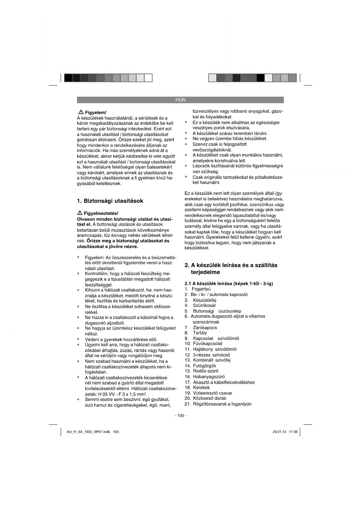 címre. Mellélkelje a vásárlási nyugtát erdetiben vagy egyébb módon levő bizonylatot a vásárlás keltéről. Kérjük őrizze ezért jól meg a pénztári cédulát mind bizonyítékot! Kérjük írja le lehetőleg pontosan a reklamáció okát. Ha a defekt a garnciateljesítményünk keretén belül van, akkor kap azonnal egy megjavított vagy egy új készüléket vissza. A gyorsan kopó /fogyasztó és hiányzó részekkel kapcsolatban utalunk, ennek a használati utasításnak a garanciarendeltetései szerinti korlátolt garanciára. Anl_H_SA_1930_SPK7.indb 106Anl_H_SA_1930_SPK7.indb 106 29.01.13 17:3929.01.13 17:39NOR
