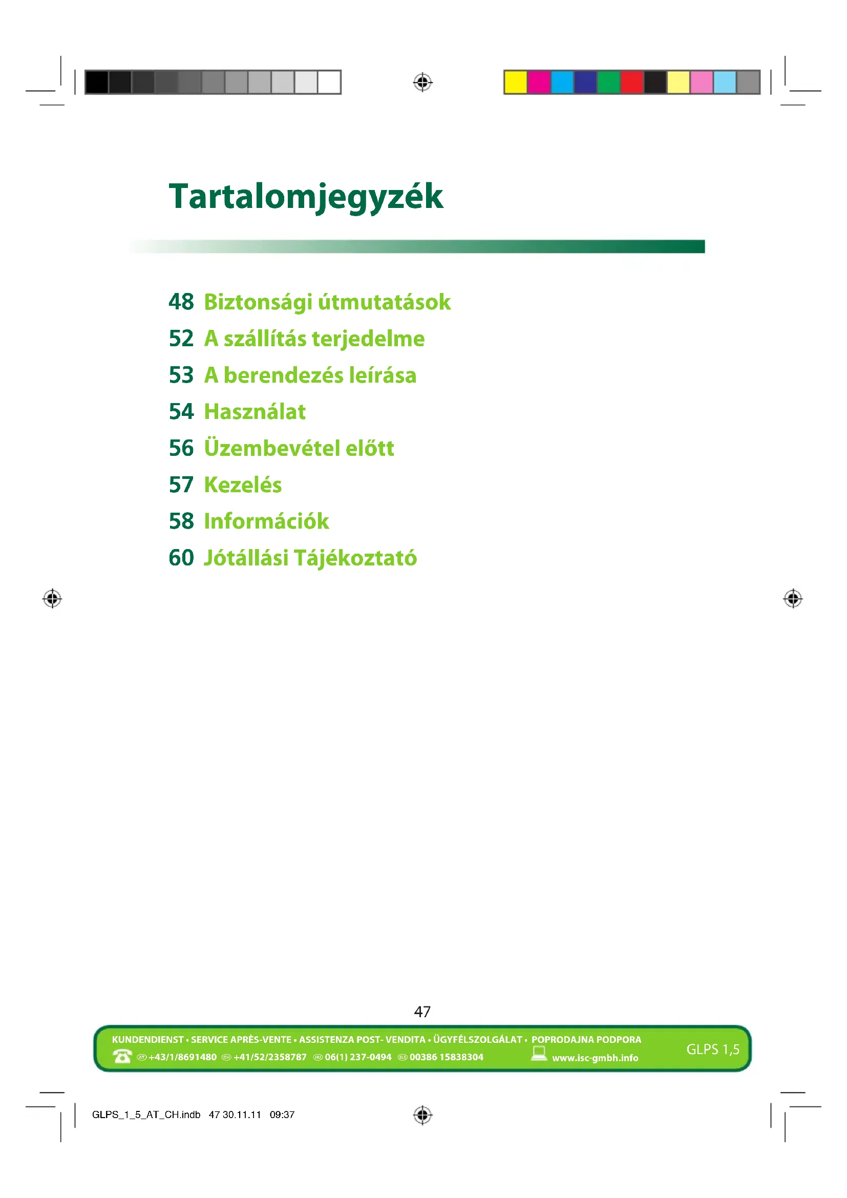 KUNDENDIENST • SERVICE APRÈS-VENTE • ASSISTENZA POST- VENDITA • ÜGYFÉLSZOLGÁLAT • POPRODAJNA PODPORA www.isc-gmbh.info GLPS 1,5 Tartalomjegyzék 48 Biztonsági útmutatások 52 A szállítás terjedelme 53 A berendezés leírása 54 Használat 56 Üzembevétel előtt 57 Kezelés 58 Információk 60 Jótállási Tájékoztató GLPS_1_5_AT_CH.indb 47 30.11.11 09:3748