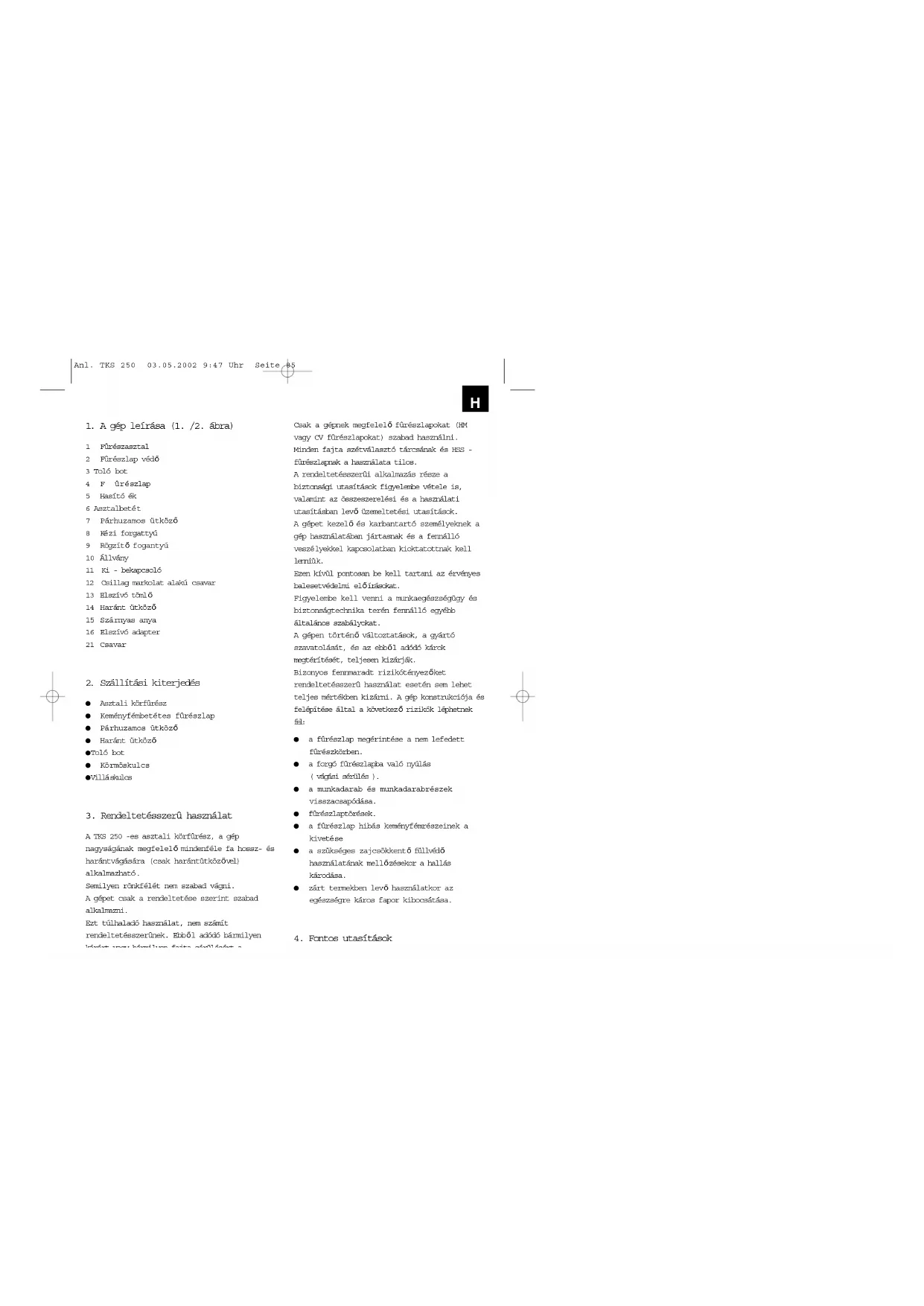 Anl. TKS 250 03.05.2002 9:47 Uhr Seite 90kell mutatnia, ez annyit jelent, hogy el őre mutatnak ( lásd a nyilat a fûrészlapvédőn) A hasító éket (5) valamint a fûrészlapvédőt (2) újra felszerelni és beállítani (lásd