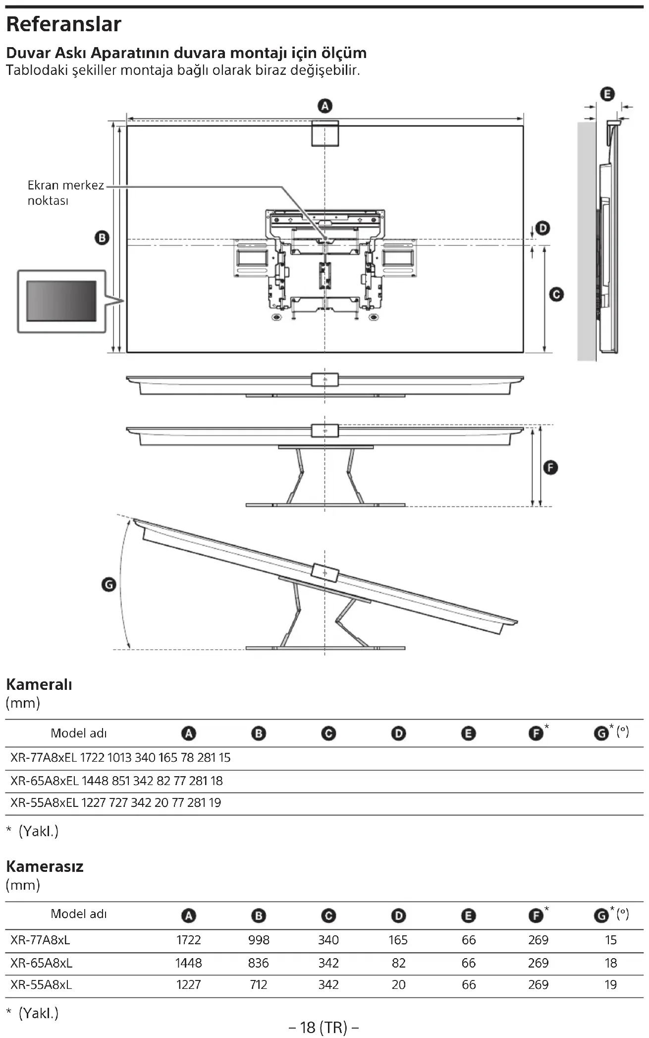 Hivatkozások Mérés a fali konzol falra szereléséhez A felszereléstől függően a táblázat adataihoz képest kisebb eltérés mutatkozhat. A képernyő középpontja Kamerával (mm) Típusnév