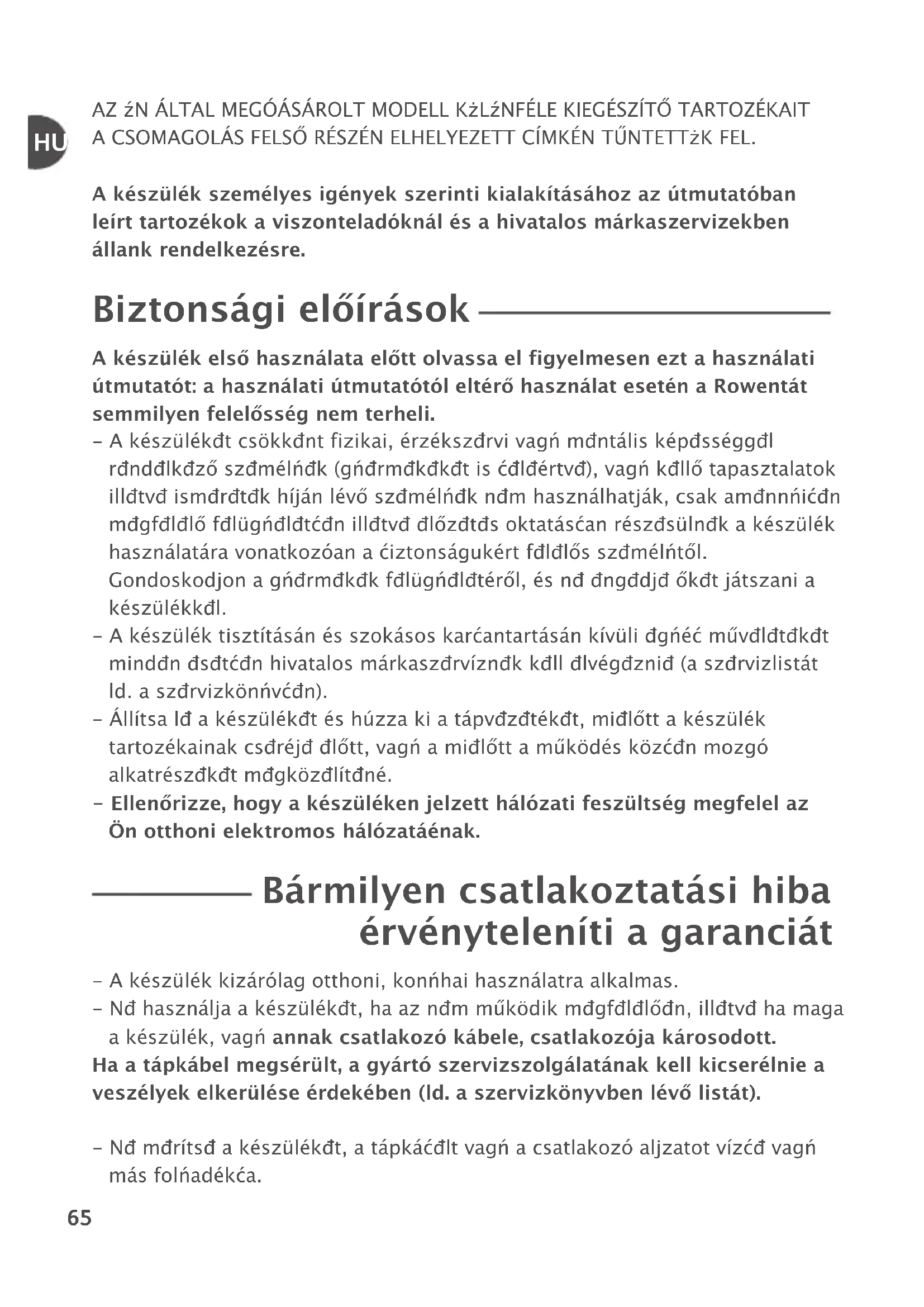 opatrnosťou. Tipy VHprípade, že dôjde kHzafarbeniu rôznych dielov príslušenstva od použitých potravín (napr. mrkvy, pomarančov...), utrite ich handričkou namočenou do jedlého oleja aHpotom ich očistite ako zvyčajne. Čo robiť, ak prístroj nefunguje? Ak prístroj nefunguje, skontrolujte nasledovné: - či je prístroj zapojený do elektrickej siete, - či je zaistený každý diel príslušenstva. Prístroj stále nefunguje? Obráťte sa na autorizované servisné stredisko (pozri zoznam vHservisnej knižke). Elektronický výrobok na konci životnosti Podieľajme sa na ochrane životného prostredia! Tento prístroj obsahuje hodnotné materiály, ktoré sa môžu znova použiť alebo recyklovať. Zaneste ho na zberné miesto, ktoré zabezpečí jeho správnu likvidáciu. Likvidácia obalových materiálov a prístroja Obal obsahuje výhradne také materiály, ktoré nie sú škodlivé pre životné prostredie, aHktoré sa môžu likvidovať vHsúlade sHplatnými nariadeniami týkajúcimi sa recyklácie. Ak chcete prístroj zlikvidovať, informujte sa na príslušnom úrade vo vašom meste.AZ ÖN ÁLTAL MEGVÁSÁROLT MODELL KÜLÖNFÉLE KIEGÉSZÍTŐ TARTOZÉKAIT A CSOMAGOLÁS FELSŐ RÉSZÉN ELHELYEZETT CÍMKÉN TŰNTETTÜK FEL. A készülék személyes igények szerinti kialakításához az útmutatóban leírt tartozékok a viszonteladóknál és a hivatalos márkaszervizekben állank rendelkezésre. Biztonsági előírások A készülék első használata előtt olvassa el figyelmesen ezt a használati útmutatót: a használati útmutatótól eltérő használat esetén a Rowentát semmilyen felelősség nem terheli. - A készüléket csökkent fizikai, érzékszervi vagy mentális képességgel rendelkező személyek (gyermekeket is beleértve), vagy kellő tapasztalatok illetve ismeretek híján lévő személyek nem használhatják, csak amennyiben megfelelő felügyeletben illetve előzetes oktatásban részesülnek a készülék használatára vonatkozóan a biztonságukért felelős személytől. Gondoskodjon a gyermekek felügyeletéről, és ne engedje őket játszani a készülékkel. - A készülék tisztításán és szokásos karbantartásán kívüli egyéb műveleteket minden esetben hivatalos márkaszervíznek kell elvégeznie (a szervizlistát ld. a szervizkönyvben). - Állítsa le a készüléket és húzza ki a tápvezetéket, mielőtt a készülék tartozékainak cseréje előtt, vagy a mielőtt a működés közben mozgó alkatrészeket megközelítené. - Ellenőrizze, hogy a készüléken jelzett hálózati feszültség megfelel az Ön otthoni elektromos hálózatáénak. Bármilyen csatlakoztatási hiba érvényteleníti a garanciát - A készülék kizárólag otthoni, konyhai használatra alkalmas. - Ne használja a készüléket, ha az nem működik megfelelően, illetve ha maga a készülék, vagy annak csatlakozó kábele, csatlakozója károsodott. Ha a tápkábel megsérült, a gyártó szervizszolgálatának kell kicserélnie a veszélyek elkerülése érdekében (ld. a szervizkönyvben lévő listát). - Ne merítse a készüléket, a tápkábelt vagy a csatlakozó aljzatot vízbe vagy más folyadékba.