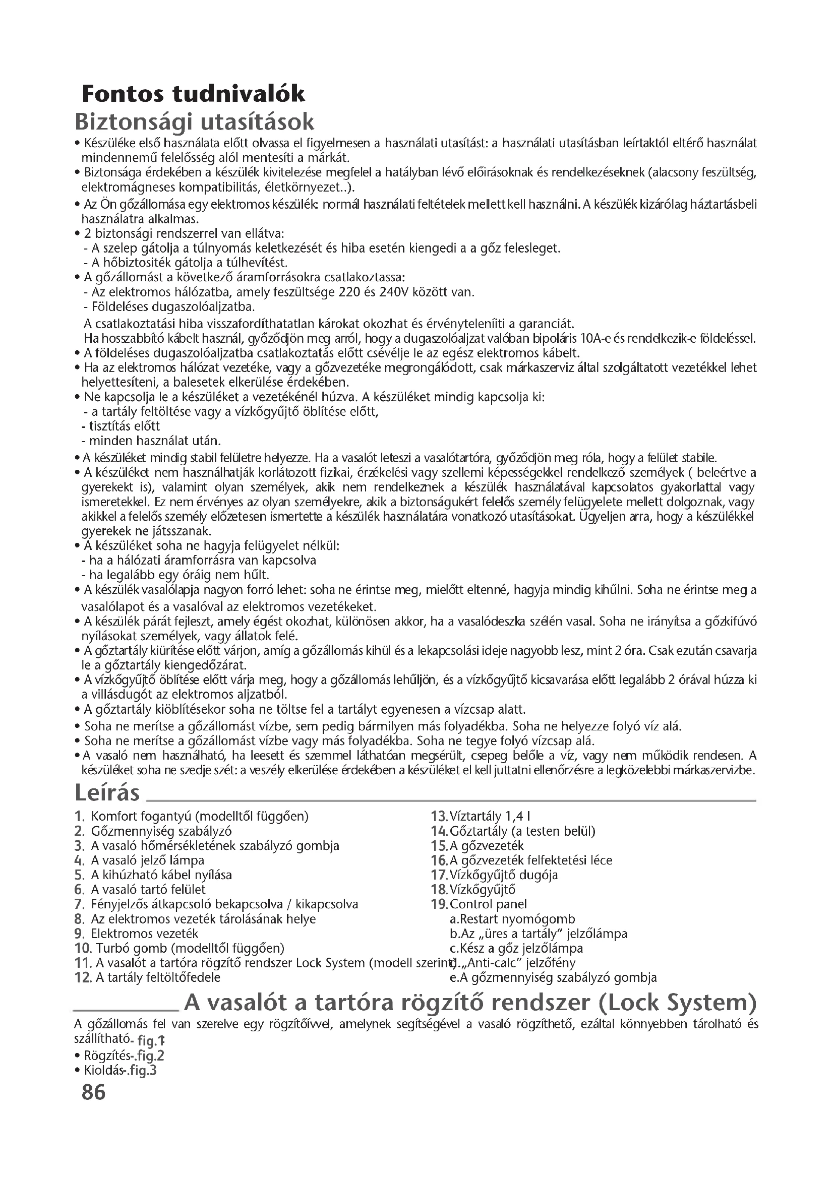 Control panel a.Restart nyomógomb b.Az „üres a tartály” jelzőlámpa c.Kész a gŒz jelzőlámpa d.„Anti-calc” jelzŒfény e.A gŒzmennyiség szabályzó gombja Leírás A vasalót a tartóra rögzítŒ rendszer (Lock System) A gŒzállomás fel van szerelve egy rögzítŒívvel, amelynek segítségével a vasaló rögzíthetŒ, ezáltal könnyebben tárolható és szállítható - fig.1