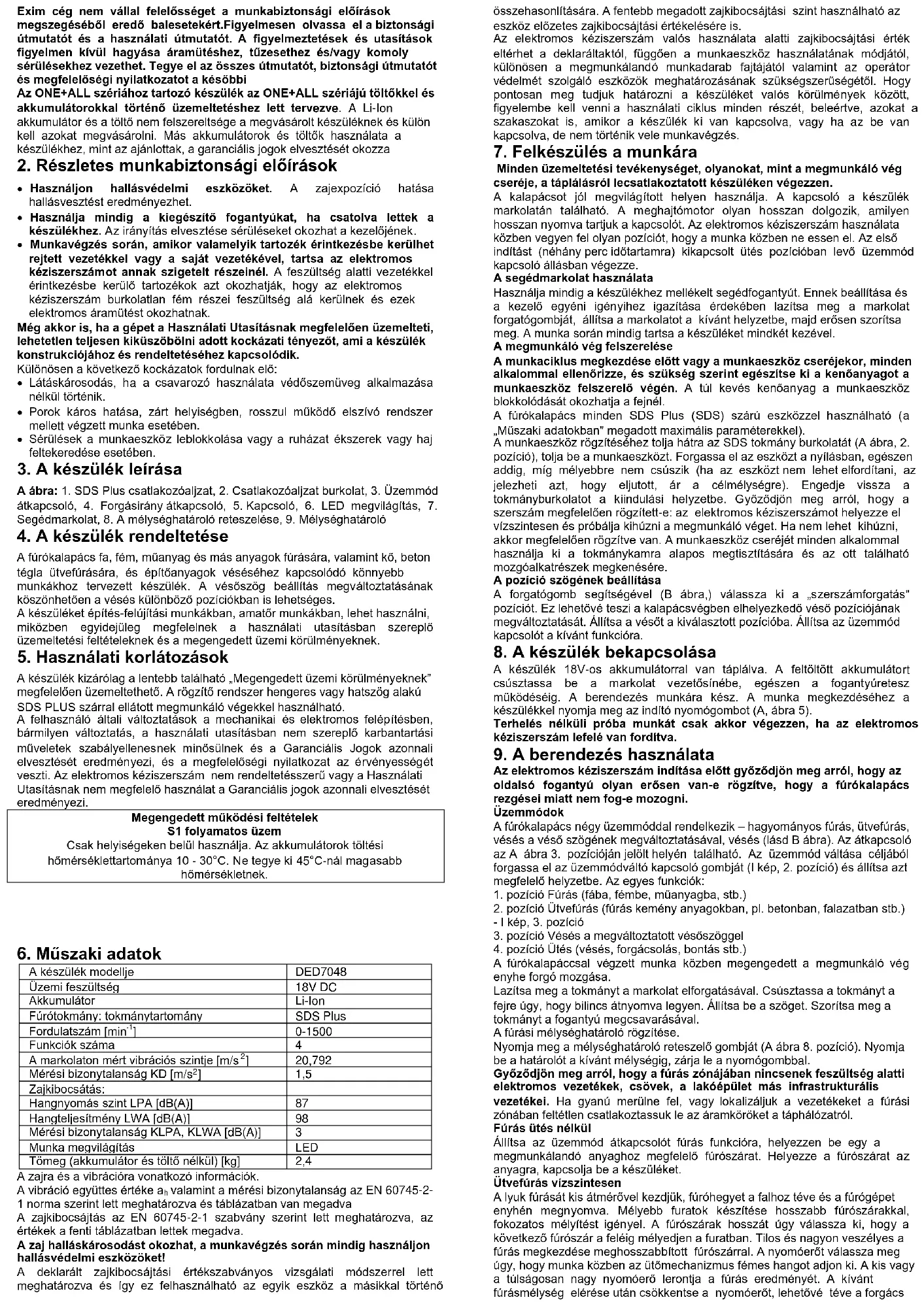 A készülék kizárólag a lentebb található „Megengedett üzemi körülményeknek” megfelelően üzemeltethető. A rögzítő rendszer hengeres vagy hatszög alakú SDS PLUS szárral ellátott megmunkáló végekkel használható. A felhasználó általi változtatások a mechanikai és elektromos felépítésben, bármilyen változtatás, a használati utasításban nem szereplő karbantartási műveletek szabályellenesnek minősülnek és a Garanciális Jogok azonnali elvesztését eredményezi, és a megfelelőségi nyilatkozat az érvényességét veszti. Az elektromos kéziszerszám nem rendeltetésszerű vagy a Használati Utasításnak nem megfelelő használat a Garanciális jogok azonnali elvesztését eredményezi. Megengedett működési feltételek S1 folyamatos üzem Csak helyiségeken belül használja. Az akkumulátorok töltési hőmérséklettartománya 10 - 30°C. Ne tegye ki 45°C-nál magasabb hőmérsékletnek.