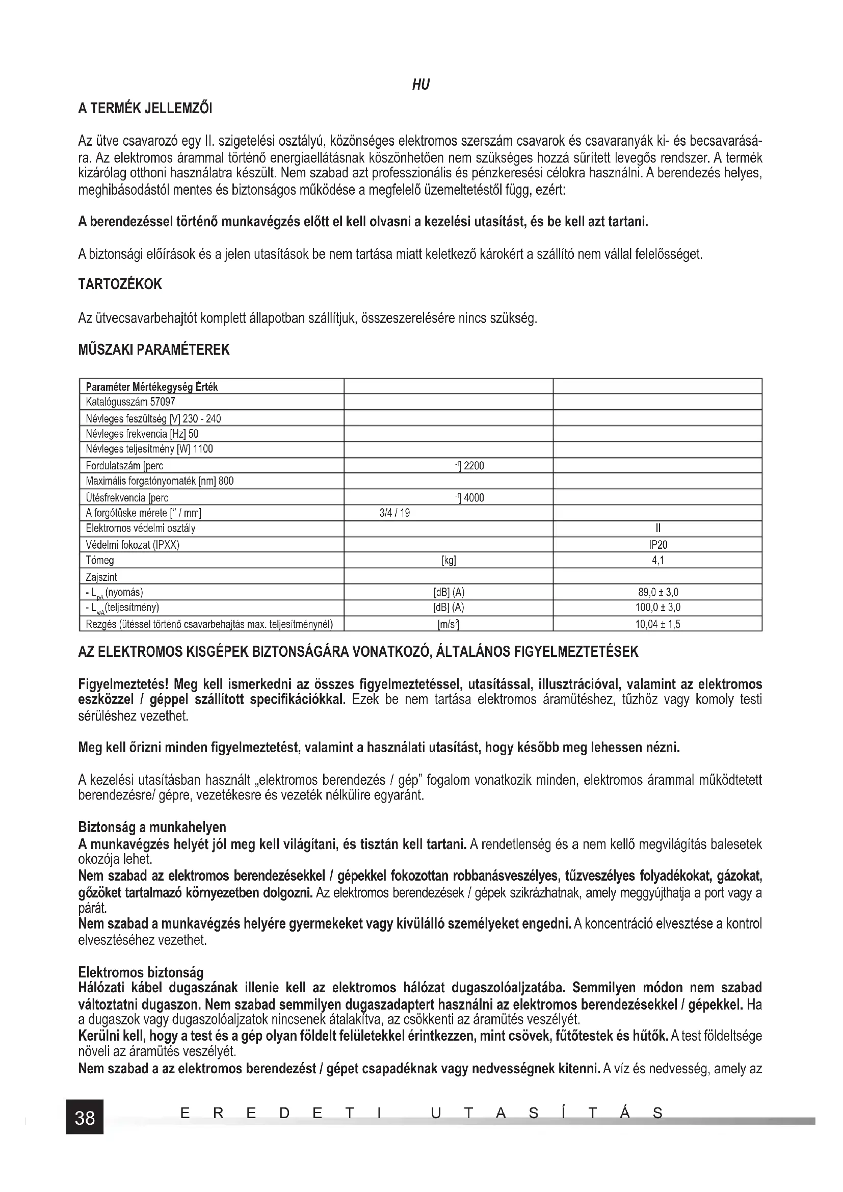 Paraméter Mértékegység Érték Katalógusszám 57097 Névleges feszültség [V] 230 - 240 Névleges frekvencia [Hz] 50 Névleges teljesítmény [W] 1100 Fordulatszám [perc