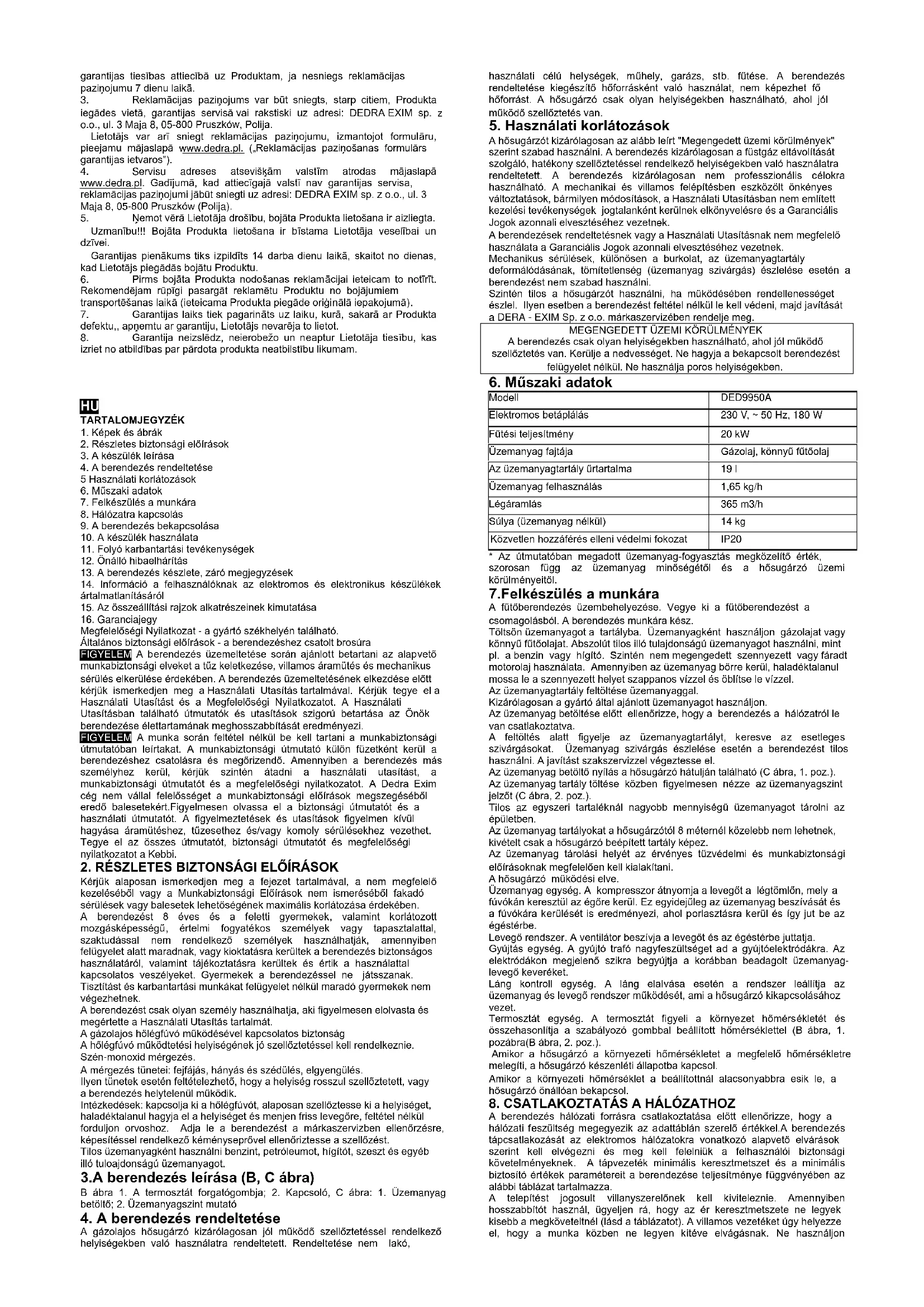 A hősugárzót kizárólagosan az alább leírt "Megengedett üzemi körülmények" szerint szabad használni. A berendezés kizárólagosan a füstgáz eltávolítását szolgáló, hatékony szellőztetéssel rendelkező helyiségekben való használatra rendeltetett. A berendezés kizárólagosan nem professzionális célokra használható. A mechanikai és villamos felépítésben eszközölt önkényes változtatások, bármilyen módosítások, a Használati Utasításban nem említett kezelési tevékenységek jogtalanként kerülnek elkönyvelésre és a Garanciális Jogok azonnali elvesztéséhez vezetnek. A berendezések rendeltetésnek vagy a Használati Utasításnak nem megfelelő használata a Garanciális Jogok azonnali elvesztéséhez vezetnek. Mechanikus sérülések, különösen a burkolat, az üzemanyagtartály deformálódásának, tömítetlenség (üzemanyag szivárgás) észlelése esetén a berendezést nem szabad használni. Szintén tilos a hősugárzót használni, ha működésében rendellenességet észlel. Ilyen esetben a berendezést feltétel nélkül le kell védeni, majd javítását a DERA - EXIM Sp. z o.o. márkaszervizében rendelje meg.