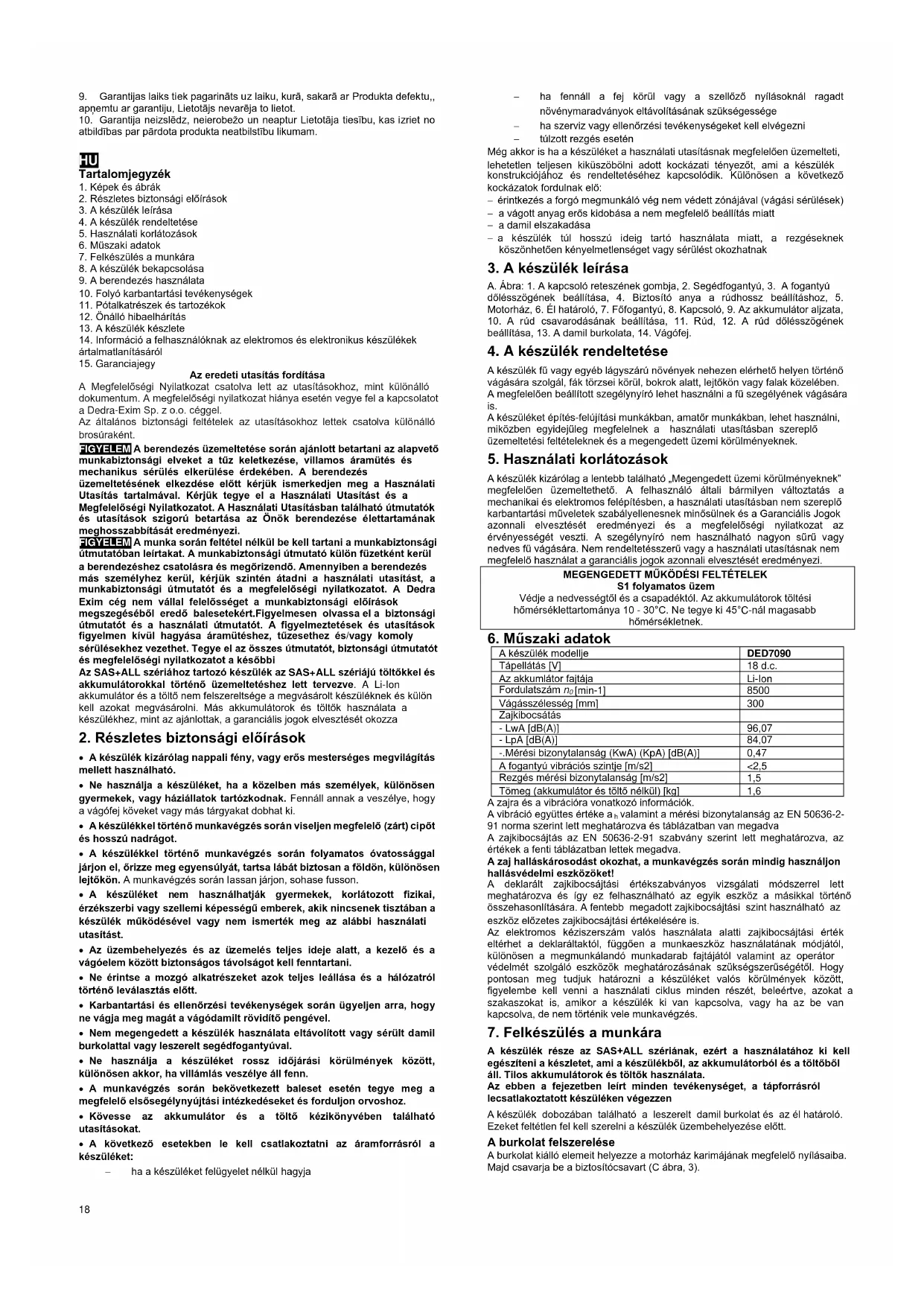 Az eredeti utasítás fordítása A Megfelelőségi Nyilatkozat csatolva lett az utasításokhoz, mint különálló dokumentum. A megfelelőségi nyilatkozat hiánya esetén vegye fel a kapcsolatot a Dedra-Exim Sp. z o.o. céggel. Az általános biztonsági feltételek az utasításokhoz lettek csatolva különálló brosúraként. FIGYELEM A berendezés üzemeltetése során ajánlott betartani az alapvető munkabiztonsági elveket a tűz keletkezése, villamos áramütés és mechanikus sérülés elkerülése érdekében. A berendezés üzemeltetésének elkezdése előtt kérjük ismerkedjen meg a Használati Utasítás tartalmával. Kérjük tegye el a Használati Utasítást és a Megfelelőségi Nyilatkozatot. A Használati Utasításban található útmutatók és utasítások szigorú betartása az Önök berendezése élettartamának meghosszabbítását eredményezi. FIGYELEM A munka során feltétel nélkül be kell tartani a munkabiztonsági útmutatóban leírtakat. A munkabiztonsági útmutató külön füzetként kerül a berendezéshez csatolásra és megőrizendő. Amennyiben a berendezés más személyhez kerül, kérjük szintén átadni a használati utasítást, a munkabiztonsági útmutatót és a megfelelőségi nyilatkozatot. A Dedra Exim cég nem vállal felelősséget a munkabiztonsági előírások megszegéséből eredő balesetekért.Figyelmesen olvassa el a biztonsági útmutatót és a használati útmutatót. A figyelmeztetések és utasítások figyelmen kívül hagyása áramütéshez, tűzesethez és/vagy komoly sérülésekhez vezethet. Tegye el az összes útmutatót, biztonsági útmutatót és megfelelőségi nyilatkozatot a későbbi Az SAS+ALL szériához tartozó készülék az SAS+ALL szériájú töltőkkel és akkumulátorokkal történő üzemeltetéshez lett tervezve. A Li-Ion akkumulátor és a töltő nem felszereltsége a megvásárolt készüléknek és külön kell azokat megvásárolni. Más akkumulátorok és töltők használata a készülékhez, mint az ajánlottak, a garanciális jogok elvesztését okozza