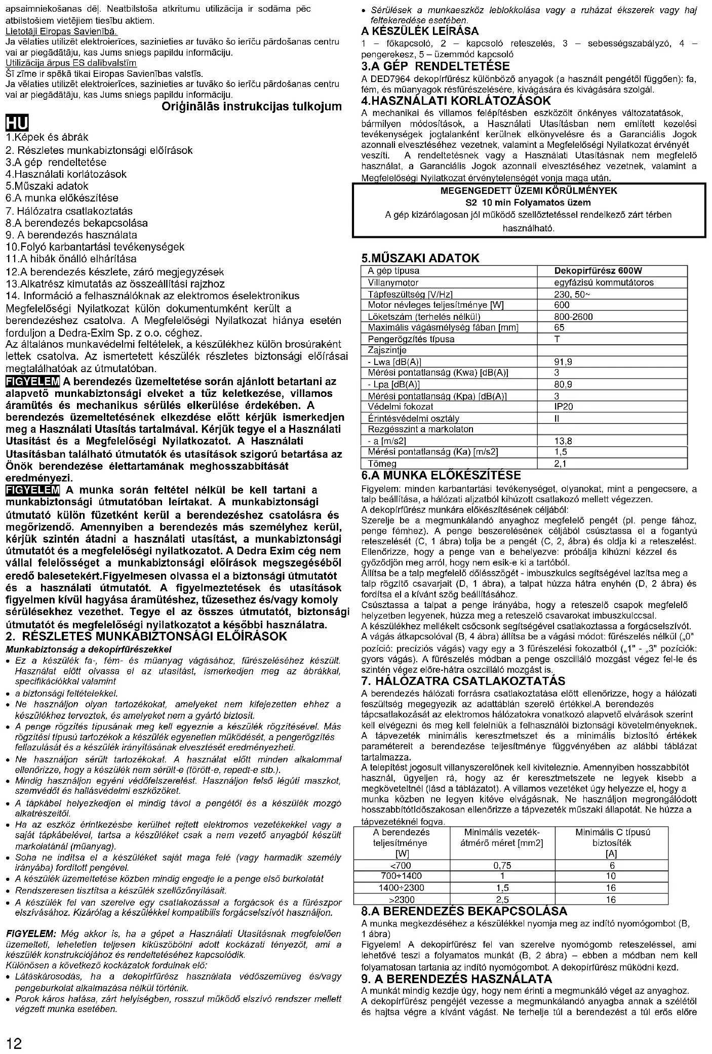 Megfelelőségi Nyilatkozat külön dokumentumként került a berendezéshez csatolva. A Megfelelőségi Nyilatkozat hiánya esetén forduljon a Dedra-Exim Sp. z o.o. céghez. Az általános munkavédelmi feltételek, a készülékhez külön brosúraként lettek csatolva. Az ismertetett készülék részletes biztonsági előírásai megtalálhatóak az útmutatóban. FIGYELEM A berendezés üzemeltetése során ajánlott betartani az alapvető munkabiztonsági elveket a tűz keletkezése, villamos áramütés és mechanikus sérülés elkerülése érdekében. A berendezés üzemeltetésének elkezdése előtt kérjük ismerkedjen meg a Használati Utasítás tartalmával. Kérjük tegye el a Használati Utasítást és a Megfelelőségi Nyilatkozatot. A Használati Utasításban található útmutatók és utasítások szigorú betartása az Önök berendezése élettartamának meghosszabbítását eredményezi. FIGYELEM A munka során feltétel nélkül be kell tartani a munkabiztonsági útmutatóban leírtakat. A munkabiztonsági útmutató külön füzetként kerül a berendezéshez csatolásra és megőrizendő. Amennyiben a berendezés más személyhez kerül, kérjük szintén átadni a használati utasítást, a munkabiztonsági útmutatót és a megfelelőségi nyilatkozatot. A Dedra Exim cég nem vállal felelősséget a munkabiztonsági előírások megszegéséből eredő balesetekért.Figyelmesen olvassa el a biztonsági útmutatót és a használati útmutatót. A figyelmeztetések és utasítások figyelmen kívül hagyása áramütéshez, tűzesethez és/vagy komoly sérülésekhez vezethet. Tegye el az összes útmutatót, biztonsági útmutatót és megfelelőségi nyilatkozatot a későbbi használatra.
