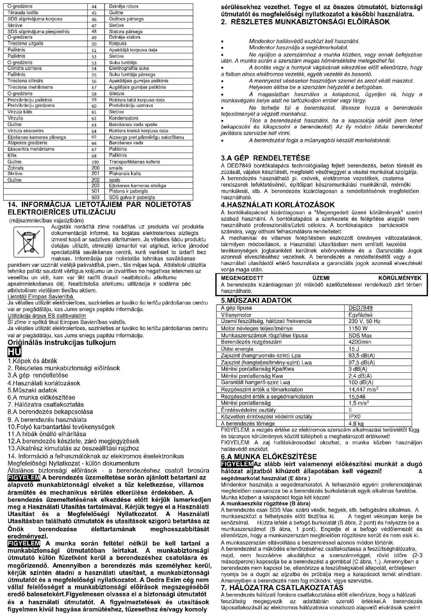 A gép típusa DED7849 Villanymotor Egyfázisú Üzemi feszültség, hálózati frekvencia 230 V, 50 Hz Motor névleges teljesítménye 1150 W Munkaszerszámok rögzítése típusa SDS Max Berendezés rezgésszám 4200/min Ütési energia 15 J Zajszint (hangnyomás-szint) Lpa 83,5 dB(A) Zajszint (hangteljesítmény-szint) Lwa 97,5 dB(A) Mérési pontatlanság Kpa/Kwa 3 dB(A) Mérési pontatlanság Kwa 2,4 dB(A) Garantált hangerő-szint Lwa 100 dB(A) Rezgésszint érték a főmarkolaton 14,447 m/s