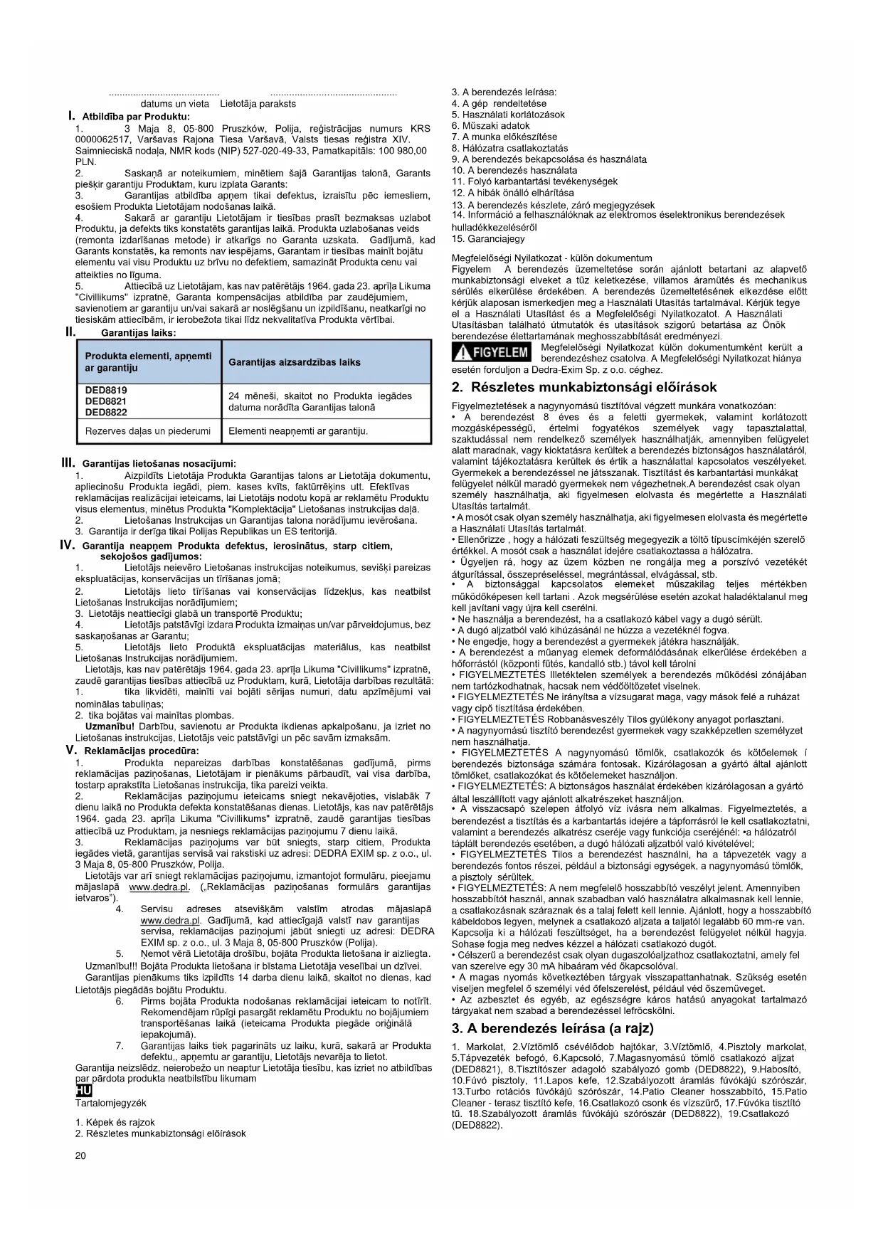garanciális szervizben, vagy írásban az alábbi címen: DEDRA EXIM sp. z o.o., ul. 3 Maja 8, 05-800 Pruszków. A Felhasználó a reklamációt a www.dedra.pl weboldalon található űrlap segítségével jelentheti be. („Garanciális reklamáció bejelentési űrlap”). Az egyes országok szerviz címei a www.dedra.pl weboldalon elérhetőek. Amennyiben az adott országban nincs garanciális szervíz, a reklamációs bejelentést ajánljuk a következő címre küldeni: DEDRA-EXIM Sp. z o.o., ul. 3 Maja 8, 05-800 Pruszków (Lengyelország).