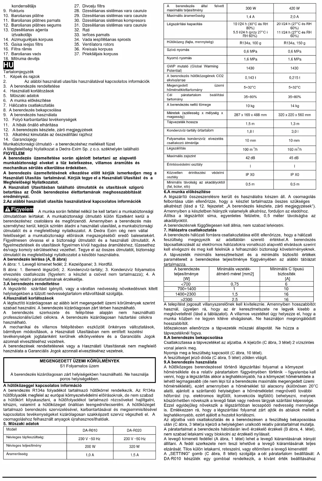 A telepítést jogosult villanyszerelőnek kell kiviteleznie. Amennyiben hosszabbítót használ, ügyeljen rá, hogy az ér keresztmetszete ne legyek kisebb a megköveteltnél (lásd a táblázatot). A villamos vezetéket úgy helyezze el, hogy a munka közben ne legyen kitéve elvágásnak. Ne használjon megrongálódott hosszabbítót. Időszakosan ellenőrizze a tápvezeték műszaki állapotát. Ne húzza a tápvezetéknél fogva. 8.A berendezés bekapcsolása Csatlakoztassa a tápvezetéket az aljzatba. A kijelzőn (C ábra, 3 tétel) 2 vízszintes vonal jelenik meg. Nyomja meg a feszültség kapcsolót (C ábra, 10 tétel). A feszültséget jelző dióda (C ábra, 5 tétel) zölden világít. 9.A berendezés használata A hűtőközeges berendezéssel történő légszárítási folyamat a környezet hőmérséklete és a relatív páratartalom függvényében történik – figyelembe kell venni, hogy a légszárítás akkor a leghatékonyabb, ha a környezet hőmérséklete a lehető legmagasabb (de nem lépi túl a berendezés maximális megengedett üzemi hőmérsékletét), ezért amennyiben a hőmérséklet túl alacsony (különösen 20°C alatti, ajánlott a szárítandó helyiségben a hőmérsékletet megnövelő további hőforrást (np. elektromos légfűtőt, konvekciós légfűtőt) behelyezni, melynek köszönhetően növekszik a levegő falak vagy nedves tárgyak szárítási képessége. Ezzel egyidejűleg növekszik a légszárítóban lecsapódó nedvesség mennyisége is. Emlékezzen rá, hogy a légszárítási folyamat zárt ajtók és ablakok mellett a leghatékonyabb, ezért ajálott a huzatot korlátozni. Az aljzatba való csatlakoztatás és a berendezésen a feszültség bekapcsolása után (C ábra, 3 tétel)a kijelző a helyiségben uralkodó relatív páratartalmat mutatja. A páratartalmat a berendezés hátoldalán levő érzékelő érzékeli (B ábra, 4. tétel), nem szabad letakarni vagy blokkolni az érzékelő nyílásait. A levegő kimeneti fedéllel (A ábra, 1 tétel) lehet a levegő kiáramlásának irányát állítani. A fedél szerkezete nem teszi lehetővé a levegő kiáramlásának teljes elzárását. Tilos külön letakarni, reteszelni, vagy eltömíteni a levegő kimenetét! A „SETTING” gomb (C ábra, 8 tétel) szolgálja a cél páratartalom beállítását: A DA-R010 készülék egy gombbal rendelkezik, a kívánt érték beállításáhoztöbbször nyomja meg a „SETTING” gombot, a kijelző (C ábra, 3 tétel) kijelzi a kiválasztott értéket; a DA-R020 készülék 2 db „SETTING” gombbal rendelkezik, melyekkel felfelé és lefelé lehet szabályozni. A cél páratartalom 35% és 80% között állítható 5 százalékonként, de folyamatos üzemmód is beállítható (ilyenkor a kijelzőn a folyamatos üzemmód „CO” jele jelenik meg). A „MODE” gombbal (C ábra, 7 tétel) lehet az üzemmódokat váltani. A DA-R010 készüléken 2 üzemmód található, melyek a ventilátor sebessége és a készülék által keltett zaj tekintetében térnek el egymástól. A gyorsabb üzemmódot a „DRY” dióda (C ábra, 1 tétel), a halk üzemmódot a „QUIET” dióda (C ábra, 2 tétel) jelzi. A DA-R020 modell további 2 üzemmóddal rendelkezik: az „AUTO” (C ábra, 11 tétel) automatikusan szabályozza berendezés üzemének intenzitását, míg a „FAN” (C ábra, 12 tétel) üzemmódban csak a ventilátor működik (a légszárítás nem üzemel). A „TIMER” (C ábra, 9 tétel) gombbal állítható az időkapcsoló, melyek az órákban megadott idő elteltével kikapcsolja a berendezést. Az időkapcsoló beállításához többször nyomja meg a „TIMER” gombot, míg a kijelzőn megjelenik a kívánt érték órában megadva. Az aktív időkapcsolót dióda (C ábra, 4 tétel) jelzi. Az időkapcsoló 1 és 24 óra között állítható. A berendezés alkalmas a kondenzvíz folyamatos elvezetésére. Ennek érdekében használjon 10 mm belső átmérőjű csövet (figyelem: a csövet a készlet nem tartalmazza), vegye ki a kondenzvíz-tartályt és szerelje be a csövet (D ábra). A tartályt helyezze vissza (megfelelő mélyedéssel rendelkezik, melyen a csövet át kell vezetni). A cső másik végét vezesse a lefolyó rácsába vagy csatornájába. Ügyeljen rá, hogy a folyamatos kondenzvíz elvezető cső ne legyen megtörve vagy beszifonozva. A lehető legrövidebb módon kell vezetni a lefolyó nyílásba/ rácsba, lehetővé téve a kondenzvíz szabad gravitációs esését. 10.Folyó karbantartási tevékenységek Tilos a kondenzvíz-tartály úszóját rögzíteni vagy eltávolítani. Ez a berendezés üzemzavarához vezethet. A berendezés tartálya úszóval rendelkezik, mely monitorozza a kondenzvíz- tartályban a víz szintjét. Amennyiben a tartály megtelik, a berendezés 15 rövid hangjelzést ad és a „FULL” dióda (C ábra, 6 tétel) pirosan felgyullad. Ekkor óvatosan vegye ki a kondenzvíz-tartályt (B ábra, 2 tétel), a két oldalánál megfogva. Öntse ki a kondenzvizet a csatornába és a tartályt helyezze vissza. A berendezés folyatja a működést. A levegő bemeneti szűrőt (B ábra, 1 tétel) időnként ki kell tisztítani. Vegye ki a szűrőt, a bar oldalon kezdve (E ábra). A szűrőt porszívóval vagy langyos vízzel tisztítsa. A kimosás után a szűrőt szárítsa ki és szerelje vissza a berendezésbe. A berendezés automatikus felolvasztás funkcióval rendelkezik. Túl alacsony környezeti hőmérséklet esetén a levegőből lecsapódó pára ráfagyhat a lamellákra és azokat megrongálhatja. Az ilyen üzemzavar elkerülése érdekében a berendezés hűtőegysége automatikusan kikapcsol, míg a berendezés körül áramló levegő eltávolítja a jeget. Nem szabad ezt a folyamatot semmi módon támogatni