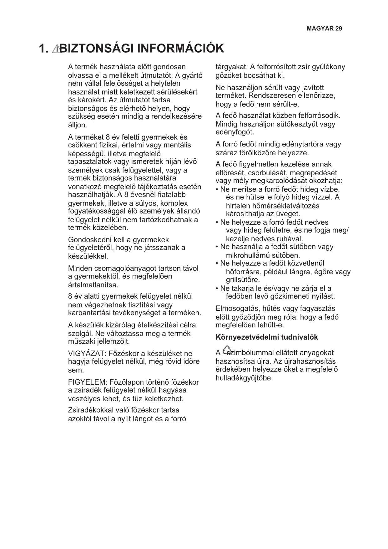 A termék használata előtt gondosan olvassa el a mellékelt útmutatót. A gyártó nem vállal felelősséget a helytelen használat miatt keletkezett sérülésekért és károkért. Az útmutatót tartsa biztonságos és elérhető helyen, hogy szükség esetén mindig a rendelkezésére álljon. A terméket 8 év feletti gyermekek és csökkent fizikai, értelmi vagy mentális képességű, illetve megfelelő tapasztalatok vagy ismeretek híján lévő személyek csak felügyelettel, vagy a termék biztonságos használatára vonatkozó megfelelő tájékoztatás esetén használhatják. A 8 évesnél fiatalabb gyermekek, illetve a súlyos, komplex fogyatékossággal élő személyek állandó felügyelet nélkül nem tartózkodhatnak a termék közelében. Gondoskodni kell a gyermekek felügyeletéről, hogy ne játsszanak a készülékkel. Minden csomagolóanyagot tartson távol a gyermekektől, és megfelelően ártalmatlanítsa. 8 év alatti gyermekek felügyelet nélkül nem végezhetnek tisztítási vagy karbantartási tevékenységet a terméken. A készülék kizárólag ételkészítési célra szolgál. Ne változtassa meg a termék műszaki jellemzőit. VIGYÁZAT: Főzéskor a készüléket ne hagyja felügyelet nélkül, még rövid időre sem. FIGYELEM: Főzőlapon történő főzéskor a zsiradék felügyelet nélkül hagyása veszélyes lehet, és tűz keletkezhet. Zsiradékokkal való főzéskor tartsa azoktól távol a nyílt lángot és a forró tárgyakat. A felforrósított zsír gyúlékony gőzöket bocsáthat ki. Ne használjon sérült vagy javított terméket. Rendszeresen ellenőrizze, hogy a fedő nem sérült-e. A fedő használat közben felforrósodik. Mindig használjon sütőkesztyűt vagy edényfogót. A forró fedőt mindig edénytartóra vagy száraz törölközőre helyezze. A fedő figyelmetlen kezelése annak eltörését, csorbulását, megrepedését vagy mély megkarcolódását okozhatja: