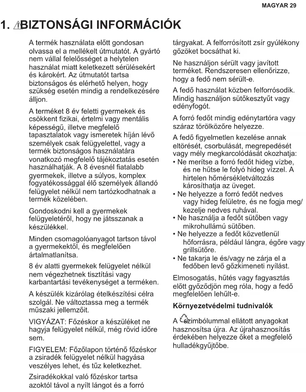 A termék használata előtt gondosan olvassa el a mellékelt útmutatót. A gyártó nem vállal felelősséget a helytelen használat miatt keletkezett sérülésekért és károkért. Az útmutatót tartsa biztonságos és elérhető helyen, hogy szükség esetén mindig a rendelkezésére álljon. A terméket 8 év feletti gyermekek és csökkent fizikai, értelmi vagy mentális képességű, illetve megfelelő tapasztalatok vagy ismeretek híján lévő személyek csak felügyelettel, vagy a termék biztonságos használatára vonatkozó megfelelő tájékoztatás esetén használhatják. A 8 évesnél fiatalabb gyermekek, illetve a súlyos, komplex fogyatékossággal élő személyek állandó felügyelet nélkül nem tartózkodhatnak a termék közelében. Gondoskodni kell a gyermekek felügyeletéről, hogy ne játsszanak a készülékkel. Minden csomagolóanyagot tartson távol a gyermekektől, és megfelelően ártalmatlanítsa. 8 év alatti gyermekek felügyelet nélkül nem végezhetnek tisztítási vagy karbantartási tevékenységet a terméken. A készülék kizárólag ételkészítési célra szolgál. Ne változtassa meg a termék műszaki jellemzőit. VIGYÁZAT: Főzéskor a készüléket ne hagyja felügyelet nélkül, még rövid időre sem. FIGYELEM: Főzőlapon történő főzéskor a zsiradék felügyelet nélkül hagyása veszélyes lehet, és tűz keletkezhet. Zsiradékokkal való főzéskor tartsa azoktól távol a nyílt lángot és a forró tárgyakat. A felforrósított zsír gyúlékony gőzöket bocsáthat ki. Ne használjon sérült vagy javított terméket. Rendszeresen ellenőrizze, hogy a fedő nem sérült-e. A fedő használat közben felforrósodik. Mindig használjon sütőkesztyűt vagy edényfogót. A forró fedőt mindig edénytartóra vagy száraz törölközőre helyezze. A fedő figyelmetlen kezelése annak eltörését, csorbulását, megrepedését vagy mély megkarcolódását okozhatja: