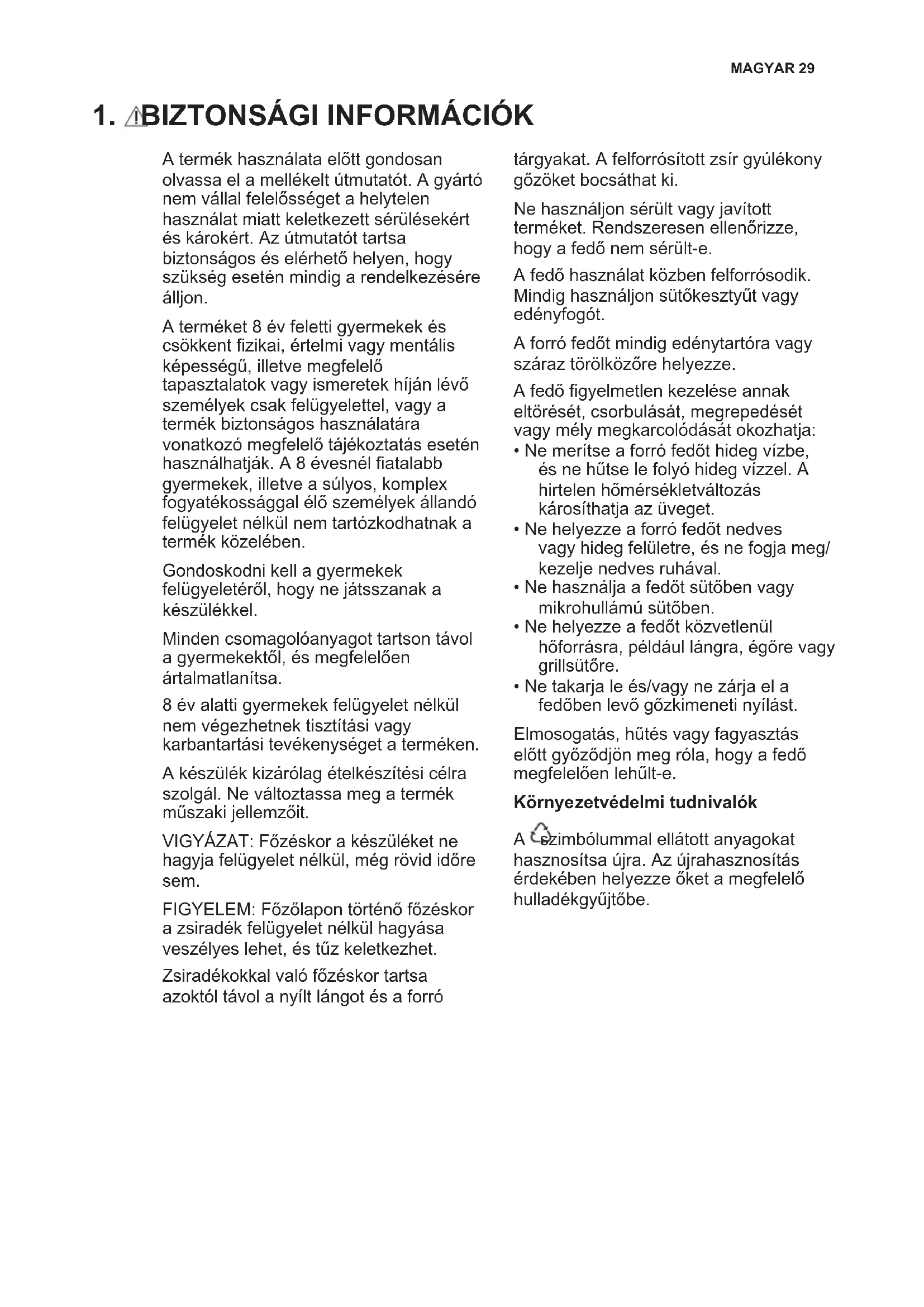 A termék használata előtt gondosan olvassa el a mellékelt útmutatót. A gyártó nem vállal felelősséget a helytelen használat miatt keletkezett sérülésekért és károkért. Az útmutatót tartsa biztonságos és elérhető helyen, hogy szükség esetén mindig a rendelkezésére álljon. A terméket 8 év feletti gyermekek és csökkent fizikai, értelmi vagy mentális képességű, illetve megfelelő tapasztalatok vagy ismeretek híján lévő személyek csak felügyelettel, vagy a termék biztonságos használatára vonatkozó megfelelő tájékoztatás esetén használhatják. A 8 évesnél fiatalabb gyermekek, illetve a súlyos, komplex fogyatékossággal élő személyek állandó felügyelet nélkül nem tartózkodhatnak a termék közelében. Gondoskodni kell a gyermekek felügyeletéről, hogy ne játsszanak a készülékkel. Minden csomagolóanyagot tartson távol a gyermekektől, és megfelelően ártalmatlanítsa. 8 év alatti gyermekek felügyelet nélkül nem végezhetnek tisztítási vagy karbantartási tevékenységet a terméken. A készülék kizárólag ételkészítési célra szolgál. Ne változtassa meg a termék műszaki jellemzőit. VIGYÁZAT: Főzéskor a készüléket ne hagyja felügyelet nélkül, még rövid időre sem. FIGYELEM: Főzőlapon történő főzéskor a zsiradék felügyelet nélkül hagyása veszélyes lehet, és tűz keletkezhet. Zsiradékokkal való főzéskor tartsa azoktól távol a nyílt lángot és a forró tárgyakat. A felforrósított zsír gyúlékony gőzöket bocsáthat ki. Ne használjon sérült vagy javított terméket. Rendszeresen ellenőrizze, hogy a fedő nem sérült-e. A fedő használat közben felforrósodik. Mindig használjon sütőkesztyűt vagy edényfogót. A forró fedőt mindig edénytartóra vagy száraz törölközőre helyezze. A fedő figyelmetlen kezelése annak eltörését, csorbulását, megrepedését vagy mély megkarcolódását okozhatja: