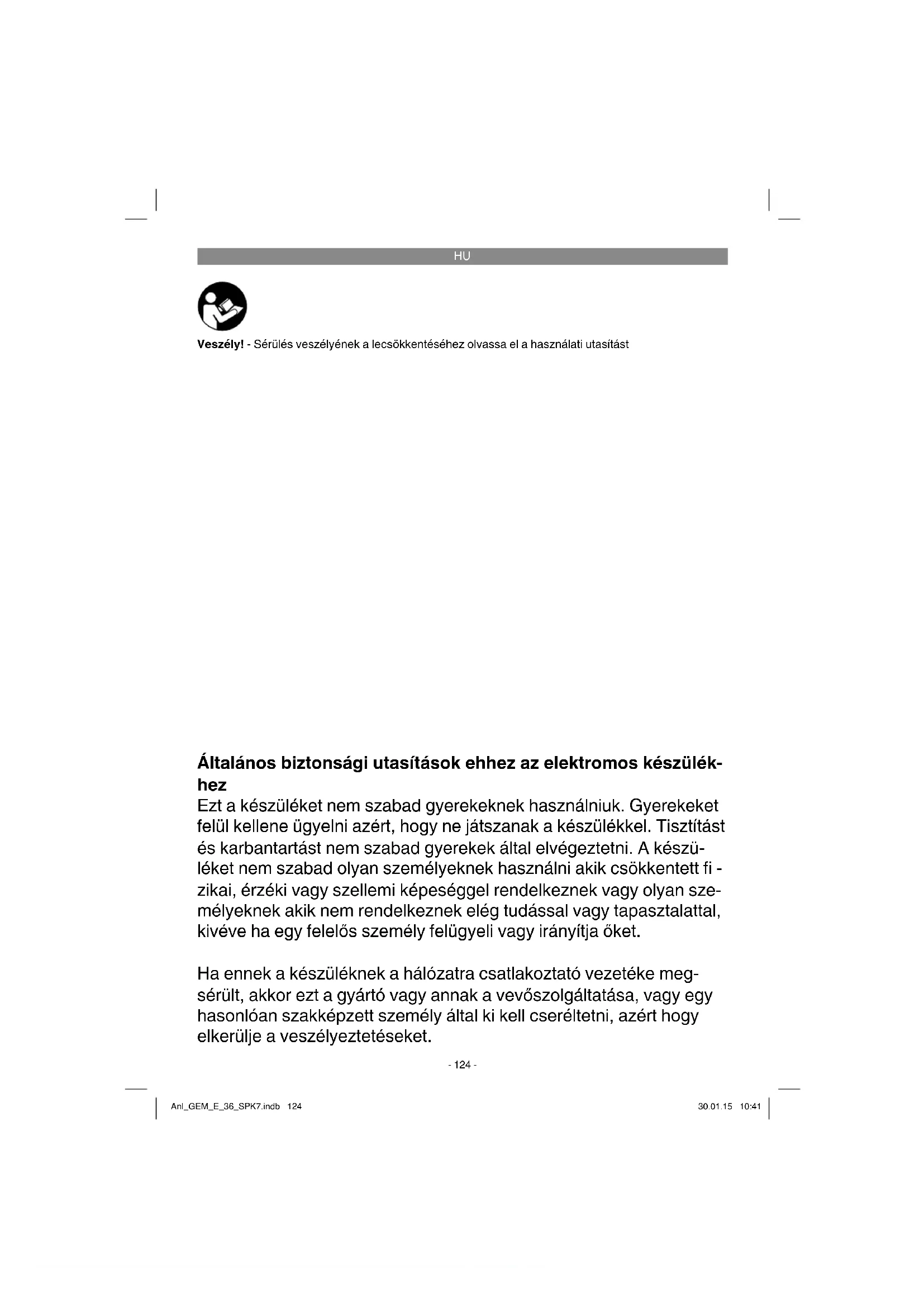 Veszély! - Sérülés veszélyének a lecsökkentéséhez olvassa el a használati utasítást Általános biztonsági utasítások ehhez az elektromos készülék- hez Ezt a készüléket nem szabad gyerekeknek használniuk. Gyerekeket felül kellene ügyelni azért, hogy ne játszanak a készülékkel. Tisztítást és karbantartást nem szabad gyerekek által elvégeztetni. A készü- léket nem szabad olyan személyeknek használni akik csökkentett fi - zikai, érzéki vagy szellemi képeséggel rendelkeznek vagy olyan sze- mélyeknek akik nem rendelkeznek elég tudással vagy tapasztalattal, kivéve ha egy felelős személy felügyeli vagy irányítja őket. Ha ennek a készüléknek a hálózatra csatlakoztató vezetéke meg- sérült, akkor ezt a gyártó vagy annak a vevőszolgáltatása, vagy egy hasonlóan szakképzett személy által ki kell cseréltetni, azért hogy elkerülje a veszélyeztetéseket. Anl_GEM_E_36_SPK7.indb 124Anl_GEM_E_36_SPK7.indb 124 30.01.15 10:4130.01.15 10:41HU