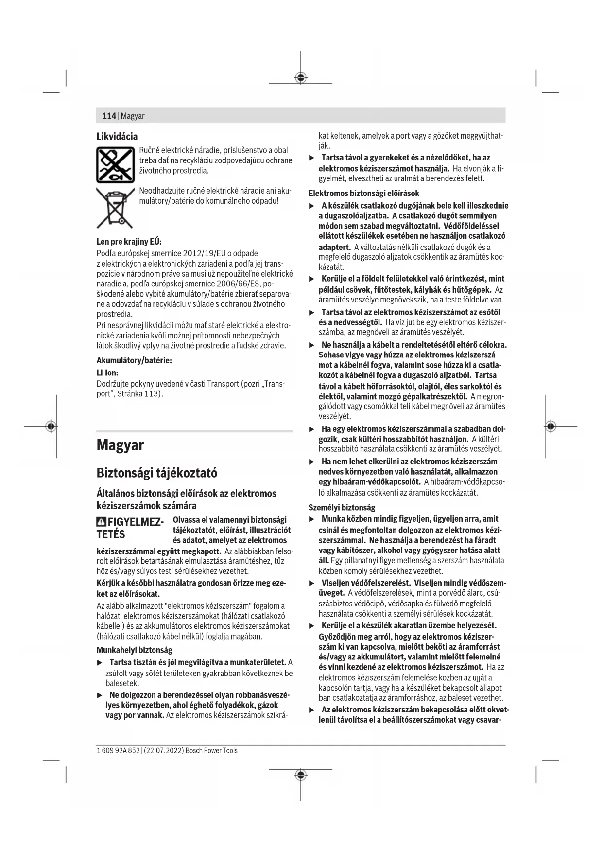 Az ezen utasításokban megadott rezgésszint és zajkibocsátá- si érték egy szabványban rögzített mérési módszerrel került meghatározásra és az elektromos kéziszerszámok egymással való összehasonlítására alkalmazható. Ez az érték a rezgés- és zajkibocsátás ideiglenes becslésére is alkalmas. A megadott rezgésszint és zajkibocsátási érték az elektro- mos kéziszerszám fő alkalmazásaira vonatkozik. Ha az elekt- romos kéziszerszámot más alkalmazásokra, eltérő betétszer- számokkal vagy nem kielégítő karbantartás mellett használ- ják, a rezgésszint és a zajkibocsátási érték a fenti értékektől eltérhet. Ez az egész munkaidőre vonatkozó rezgés- és zajki- bocsátást lényegesen megnövelheti. A rezgés- és zajkibocsátás pontos megbecsüléséhez figye- lembe kell venni azokat az időszakokat is, amikor a készülék kikapcsolt állapotban van, vagy amikor be van ugyan kap- csolva, de nem kerül ténylegesen használatra. Ez az egész munkaidőre vonatkozó rezgés- és zajkibocsátást lényegesen csökkentheti. Hozzon kiegészítő biztonsági intézkedéseket a kezelőnek a rezgések hatása elleni védelmére, például: Az elektromos ké- ziszerszám és a betétszerszámok karbantartása, a kezek me- legen tartása, a munkamenetek megszervezése. Bosch Power Tools 1 609 92A 852 | (22.07.2022)118 | Magyar Akkumulátor Az akkumulátor feltöltése u Csak a Műszaki Adatoknál megadott töltőkészüléke- ket használja. Csak ezek a töltőkészülékek felelnek meg pontosan az Ön elektromos kéziszerszámában alkalma- zásra kerülő Li‑ion-akkumulátornak. Figyelem: A lítium-ion-akkumulátorok a nemzetközi szállítási előírásoknak megfelelően csak részben feltöltve kerülnek ki- szállításra. Az akkumulátor teljes teljesítményének biztosítá- sára az első alkalmazás előtt töltse fel teljesen az akkumulá- tort. Az akkumulátor beszerelése Tolja be a feltöltött akkumulátort az akkumulátor fogadó egy- ségbe, amíg az érezhetően bepattan. Az akkumulátor kivétele Az akkumulátor eltávolításához nyomja meg az akkumulátor reteszelésfeloldó gombot és húzza ki az akkumulátort. Ne erőltesse a kihúzást. Akkumulátor töltöttségi szint kijelző Az akkumulátor feltöltési szintjelző display félig vagy teljesen benyomott be-/kikapcsoló esetén néhány másodpercig kijel- zi az akkumulátor feltöltési szintjét. LED Kapacitás Tartós fény, 3×zöld 75–100% Tartós fény, 2×zöld 40–75% Tartós fény, 1×zöld 15–40% Lassú villogás, 1×zöld 0–15% A töltési szint kijelző 3 LED-je gyorsan villog, ha a túlterhelés elleni védelem működésbe lépett. Ha csak a középső LED vil- log gyorsan, akkor az akkumulátor vagy az elektromos kézi- szerszám hőmérséklete a megengedett üzemi hőmérsélet tartományon kívül van. Hagyja lehűlni az akkumulátort és az elektromos kéziszerszámot. Tájékoztató az akkumulátor optimális kezeléséhez Óvja meg az akkumulátort a nedvességtől és a víztől. Az akkumulátort csak a –20°C...50°C hőmérséklet tarto- mányban szabad tárolni. Ne hagyja például az akkumulátort nyáron egy gépjárműben. Időnként tisztítsa meg az akkumulátor szellőzőrését egy pu- ha, tiszta és száraz ecsettel. Ha az akkumulátor feltöltése után a készülék már csak lénye- gesen rövidebb ideig üzemeltethető, akkor az akkumulátor elhasználódott és ki kell cserélni. Vegye figyelembe a hulladékba való eltávolítással kapcsola- tos előírásokat. Összeszerelés u Az elektromos kéziszerszámon végzendő minden munka (például karbantartás, szerszámcsere, stb.) megkezdése előtt, valamint szállításhoz és tároláshoz vegye ki az akkumulátort az elektromos kéziszerszám- ból. Ellenkező esetben a be‑/kikapcsoló véletlen megérin- tésekor bekapcsolódó készülék sérüléseket okozhat. Pótfogantyú u Ügyeljen arra, hogy a pótfogantyú mindig szorosan meg legyen húzva. Ellenkező esetben munka közben el- vesztheti az uralmát az elektromos kéziszerszám felett. A pótfogantyú elforgatása (lásd a Aábrát) A (15) pótfogantyút a biztonságos és fáradságmentes mun- kához bármilyen megfelelő helyzetbe lehet forgatni. – Oldja ki a(15)pótfogantyú(14)szárnyascsavarját és for- gassa el a kívánt helyzetbe a(15)pótfogantyút. Ezután húzza meg ismét szorosra a(15)pótfogantyú(14)szárnyascsavarját. Ügyeljen arra, hogy a pótfogantyú szorítógyűrűje beillesz- kedjen a házon erre a célra előirányzott horonyba. A fúrótokmány és a szerszámok kijelölése Kalapácsos fúráshoz és véséshez SDS plus-szerszámokra van szükség, amelyeket az SDS plus-fúrótokmányba lehet behelyezni. Fában, fémekben, kerámiában és műanyagokban végzett ütés nélküli fúráshoz, valamint csavarozáshoz SDS plus nél- küli szerszámokra (pl. hengeres szárú fúrófejekre) van szük- ség. Ezekhez a szerszámokhoz egy fogaskoszorús fúrótok- mányt kell használni. Figyelem: A fogaskoszorús fúrótokmányt csak a Fúrás ütés nélkül üzemmódban használja. A fúrótokmány kicserélése A fogaskoszorús fúrótokmány behelyezése/kivétele Ahhoz, hogy SDS-plus nélküli szerszámokat (például henge- res szárú fúrókat) is lehessen használni, egy megfelelő fúró- tokmányt (fogaskoszorús vagy gyorsbefogó fúrótokmányt, külön tartozék) kell felszerelni. A fogaskoszorús fúrótokmány behelyezése (lásdaBábrát) – Tisztítsa meg és kissé zsírozza be a(18)befogószár be- dugásra kerülő végét. – Forgatva tolja be a(17)fogaskoszorús fúrótokmányt a(18)tokmányszárral a szerszámbefogó egységbe, amíg az magától elreteszelésre kerül. – A(17)fogaskoszorús fúrótokmány meghúzásával ellen- őrizze annak reteszelését. Szerszámcsere A (3) porvédő sapka üzem közben messzemenően meggátol- ja a fúrás sor