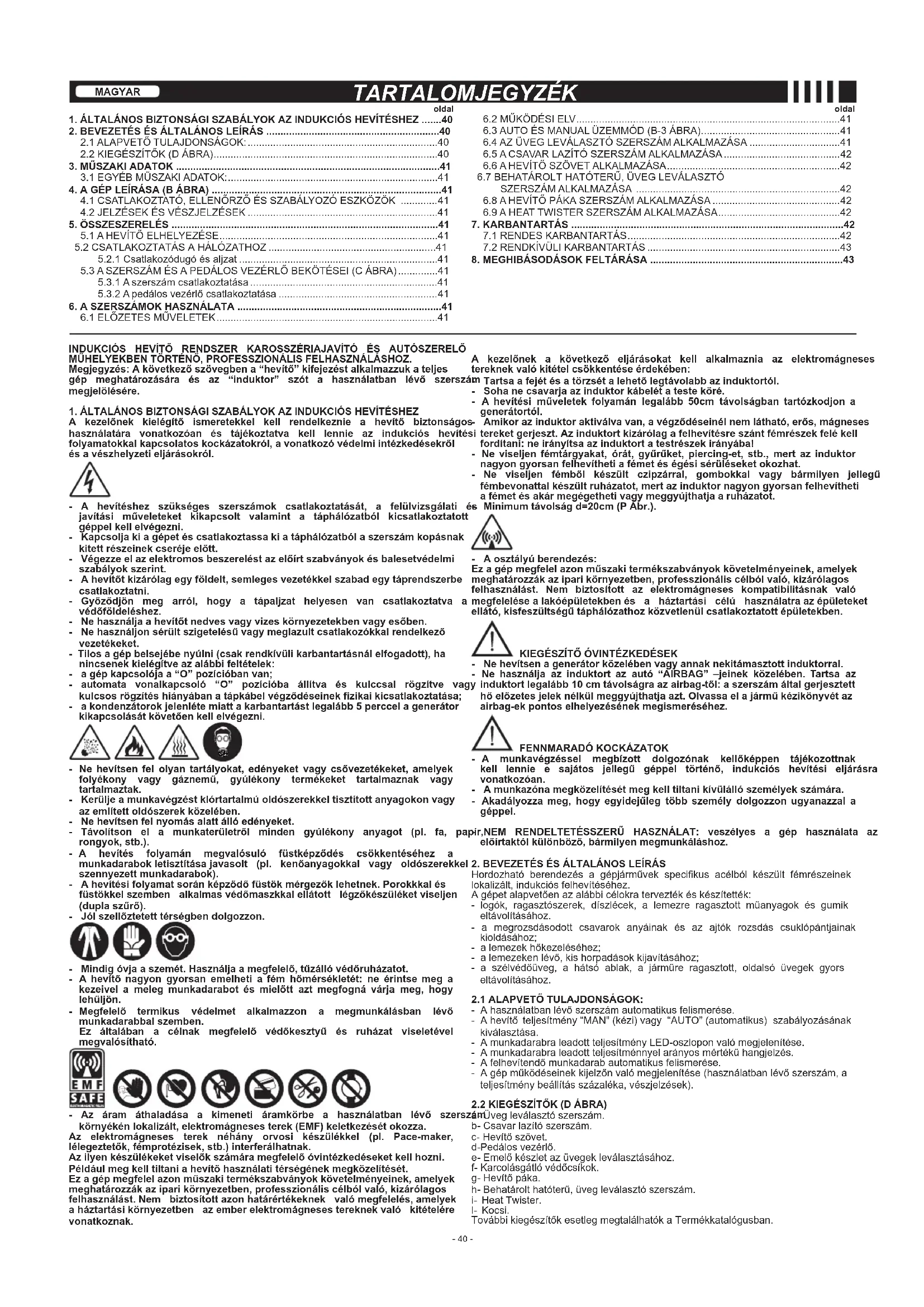 - A munkavégzéssel megbízott dolgozónak kellőképpen tájékozottnak kell lennie e sajátos jellegű géppel történő, indukciós hevítési eljárásra vonatkozóan. - Amunkazónamegközelítésétmegkelltiltanikívülállószemélyekszámára. - Akadályozza meg, hogy egyidejűleg több személy dolgozzon ugyanazzal a géppel. - NEM RENDELTETÉSSZERŰ HASZNÁLAT: veszélyes a gép használata az előírtaktólkülönböző,bármilyenmegmunkáláshoz. 2.BEVEZETÉSÉSÁLTALÁNOSLEÍRÁS Hordozható berendezés a gépjárművek specikus acélból készült fémrészeinek lokalizált, indukciós felhevítéséhez. A gépet alapvetően az alábbi célokra tervezték és készítették: - logók, ragasztószerek, díszlécek, a lemezre ragasztott műanyagok és gumik eltávolításához. - a megrozsdásodott csavarok anyáinak és az ajtók rozsdás csuklópántjainak kioldásához; - a lemezek hőkezeléséhez; - a lemezeken lévő, kis horpadások kijavításához; - a szélvédőüveg, a hátsó ablak, a járműre ragasztott, oldalsó üvegek gyors eltávolításához. 2.1ALAPVETŐTULAJDONSÁGOK: - A használatban lévő szerszám automatikus felismerése. - A hevítő teljesítmény “MAN” (kézi) vagy “AUTO” (automatikus) szabályozásának kiválasztása. - A munkadarabra leadott teljesítmény LED-oszlopon való megjelenítése. - A munkadarabra leadott teljesítménnyel arányos mértékű hangjelzés. - A felhevítendő munkadarab automatikus felismerése. - A gép működéseinek kijelzőn való megjelenítése (használatban lévő szerszám, a teljesítmény beállítás százaléka, vészjelzések). 2.2KIEGÉSZÍTŐK(DÁBRA) a- Üveg leválasztó szerszám. b- Csavar lazító szerszám. c- Hevítő szövet. d-Pedálos vezérlő. e- Emelő készlet az üvegek leválasztásához. f- Karcolásgátló védőcsíkok. g- Hevítő páka. h- Behatárolt hatóterű, üveg leválasztó szerszám. i- Heat Twister. l- Kocsi. További kiegészítők esetleg megtalálhatók a Termékkatalógusban.- 41 - 3.MŰSZAKIADATOK A gép alkalmazására és teljesítményeire vonatkozó, alapvető adatok a karakterisztikák táblázatában (hátsó panel) vannak összefoglalva az alábbi jelentéssel: A ÁBRA
