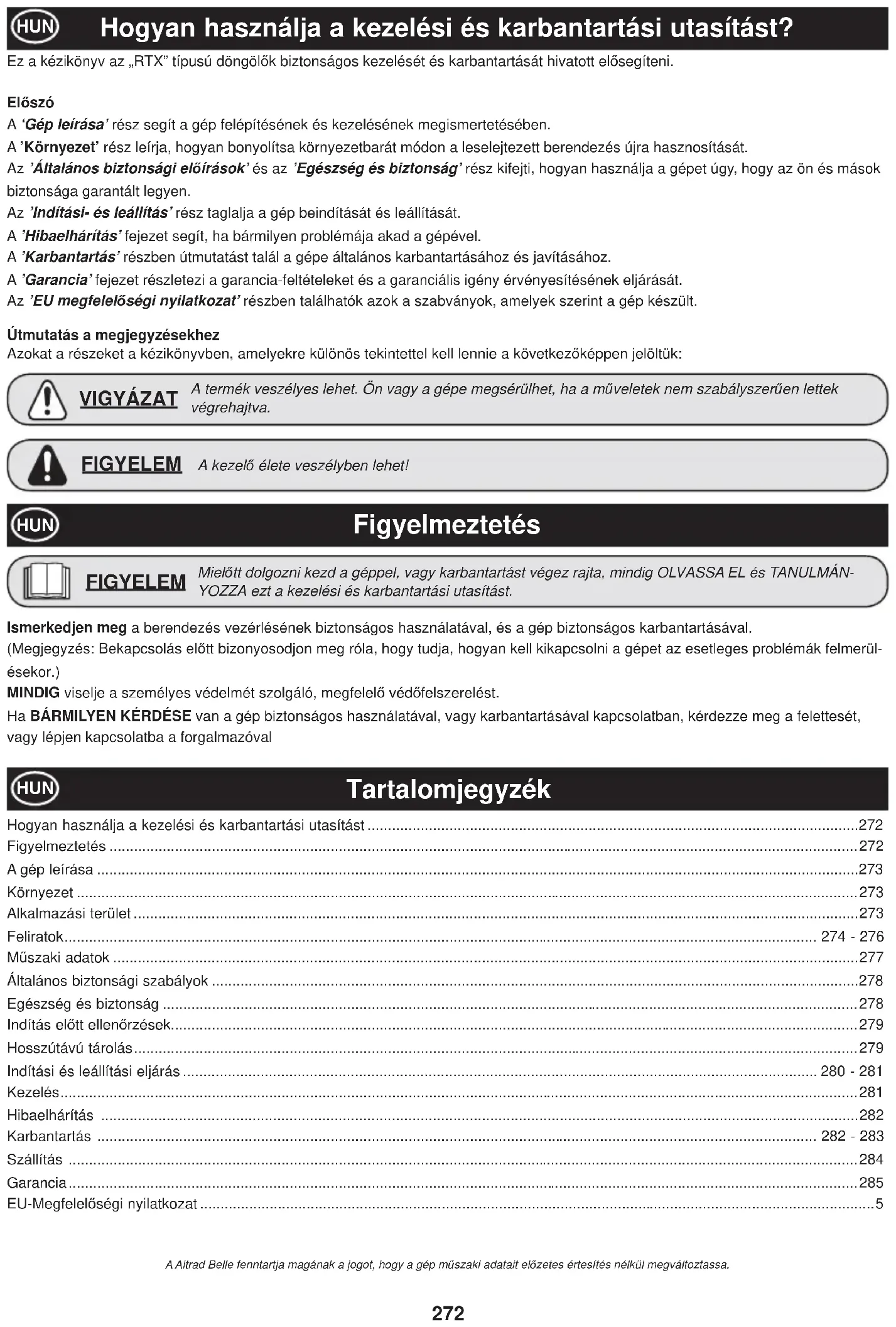 - UTILIZAğI SILICONE RO272 Hogyan használja a kezelési és karbantartási utasítást? HUN Ez a kézikönyv az „RTX” típusú döngölĘk biztonságos kezelését és karbantartását hivatott elĘsegíteni. ElĘszó A ‘Gép leírása’ rész segít a gép felépítésének és kezelésének megismertetésében. A ’Környezet’ rész leírja, hogyan bonyolítsa környezetbarát módon a leselejtezett berendezés újra hasznosítását. Az ’Általános biztonsági elĘírások’ és az ’Egészség és biztonság’ rész kifejti, hogyan használja a gépet úgy, hogy az ön és mások biztonsága garantált legyen. Az ’Indítási- és leállítás’ rész taglalja a gép beindítását és leállítását. A ’Hibaelhárítás’ fejezet segít, ha bármilyen problémája akad a gépével. A ’Karbantartás’ részben útmutatást talál a gépe általános karbantartásához és javításához. A ’Garancia’ fejezet részletezi a garancia-feltételeket és a garanciális igény érvényesítésének eljárását. Az ’EU megfelelĘségi nyilatkozat’ részben találhatók azok a szabványok, amelyek szerint a gép készült. Útmutatás a megjegyzésekhez Azokat a részeket a kézikönyvben, amelyekre különös tekintettel kell lennie a következĘképpen jelöltük: MielĘtt dolgozni kezd a géppel, vagy karbantartást végez rajta, mindig OLVASSA EL és TANULMÁN- YOZZA ezt a kezelési és karbantartási utasítást. FIGYELEM A termék veszélyes lehet. Ön vagy a gépe megsérülhet, ha a mĦveletek nem szabályszerĦen lettek végrehajtva. VIGYÁZAT A kezelĘ élete veszélyben lehet! FIGYELEM Figyelmeztetés HUN Tartalomjegyzék Ismerkedjen meg a berendezés vezérlésének biztonságos használatával, és a gép biztonságos karbantartásával. (Megjegyzés: Bekapcsolás elĘtt bizonyosodjon meg róla, hogy tudja, hogyan kell kikapcsolni a gépet az esetleges problémák felmerül- ésekor.) MINDIG viselje a személyes védelmét szolgáló, megfelelĘ védĘfelszerelést. Ha BÁRMILYEN KÉRDÉSE van a gép biztonságos használatával, vagy karbantartásával kapcsolatban, kérdezze meg a felettesét, vagy lépjen kapcsolatba a forgalmazóval HUN Hogyan használja a kezelési és karbantartási utasítást p. 272