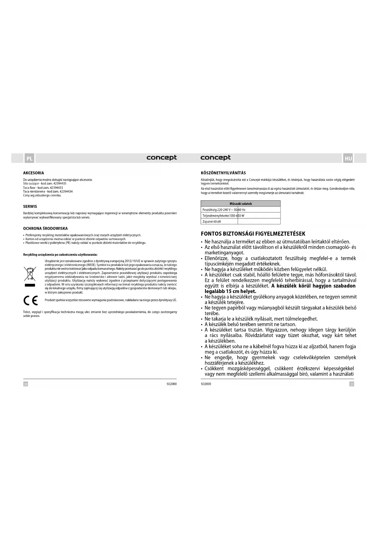 Köszönjük, hogy megvásárolta ezt a Concept márkájú készüléket, és kívánjuk, hogy használata során végig elégedett legyen termékünkkel. Az első használat előtt figyelmesen tanulmányozza át az egész használati útmutatót, és őrizze meg. Gondoskodjon róla, hogy a terméket kezelő valamennyi személy megismerje az útmutató tartalmát. Műszaki adatok Feszültség 220-240 V ~ 50/60 Hz Teljesítményfelvétel 550-650 W Zajszint 60 dB