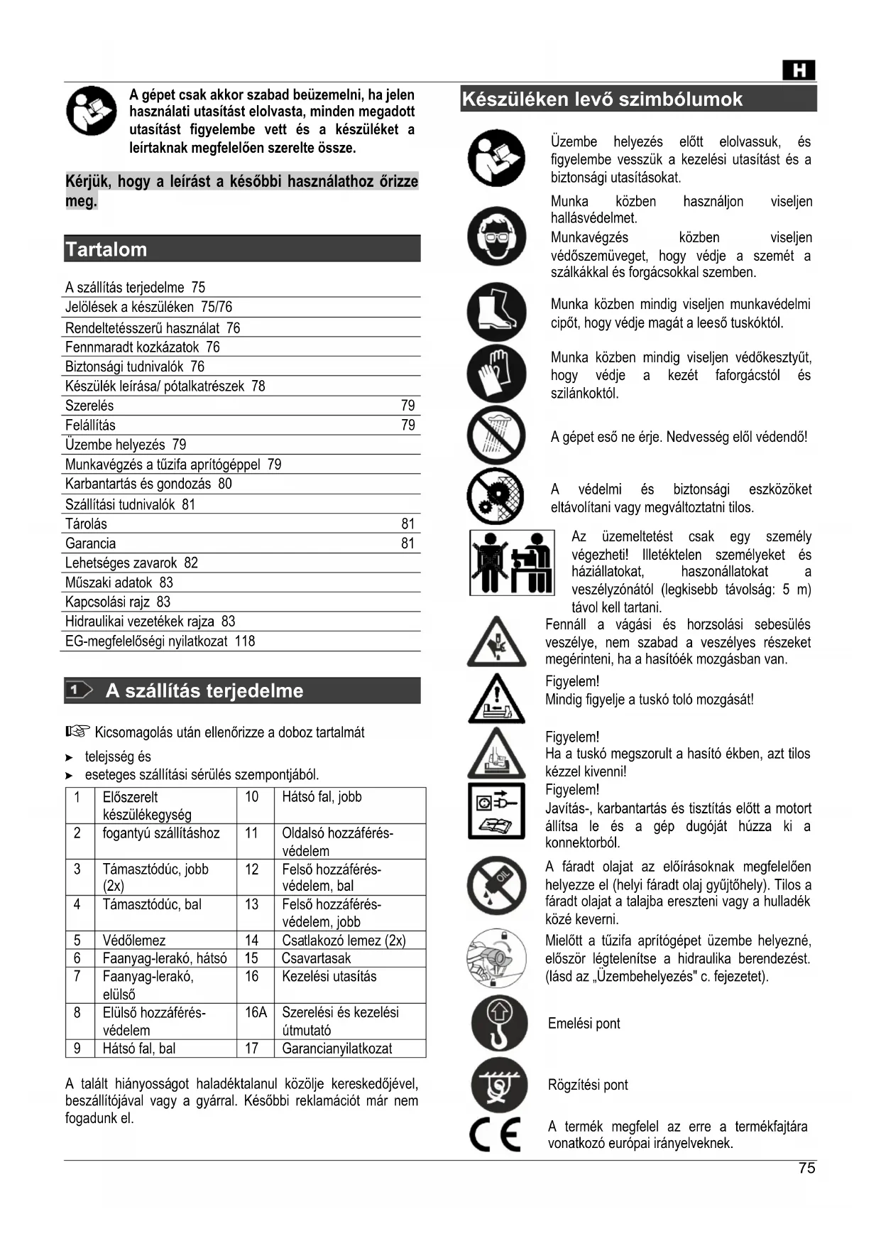 Tartalom A szállítás terjedelme 75 Jelölések a készüléken 75/76 Rendeltetésszerű használat 76 Fennmaradt kozkázatok 76 Biztonsági tudnivalók 76 Készülék leírása/ pótalkatrészek 78 Szerelés 79 Felállítás 79 Üzembe helyezés 79 Munkavégzés a tűzifa aprítógéppel 79 Karbantartás és gondozás 80 Szállítási tudnivalók 81 Tárolás 81 Garancia 81 Lehetséges zavarok 82 Műszaki adatok 83 Kapcsolási rajz 83 Hidraulikai vezetékek rajza 83 EG-megfelelőségi nyilatkozat 118
