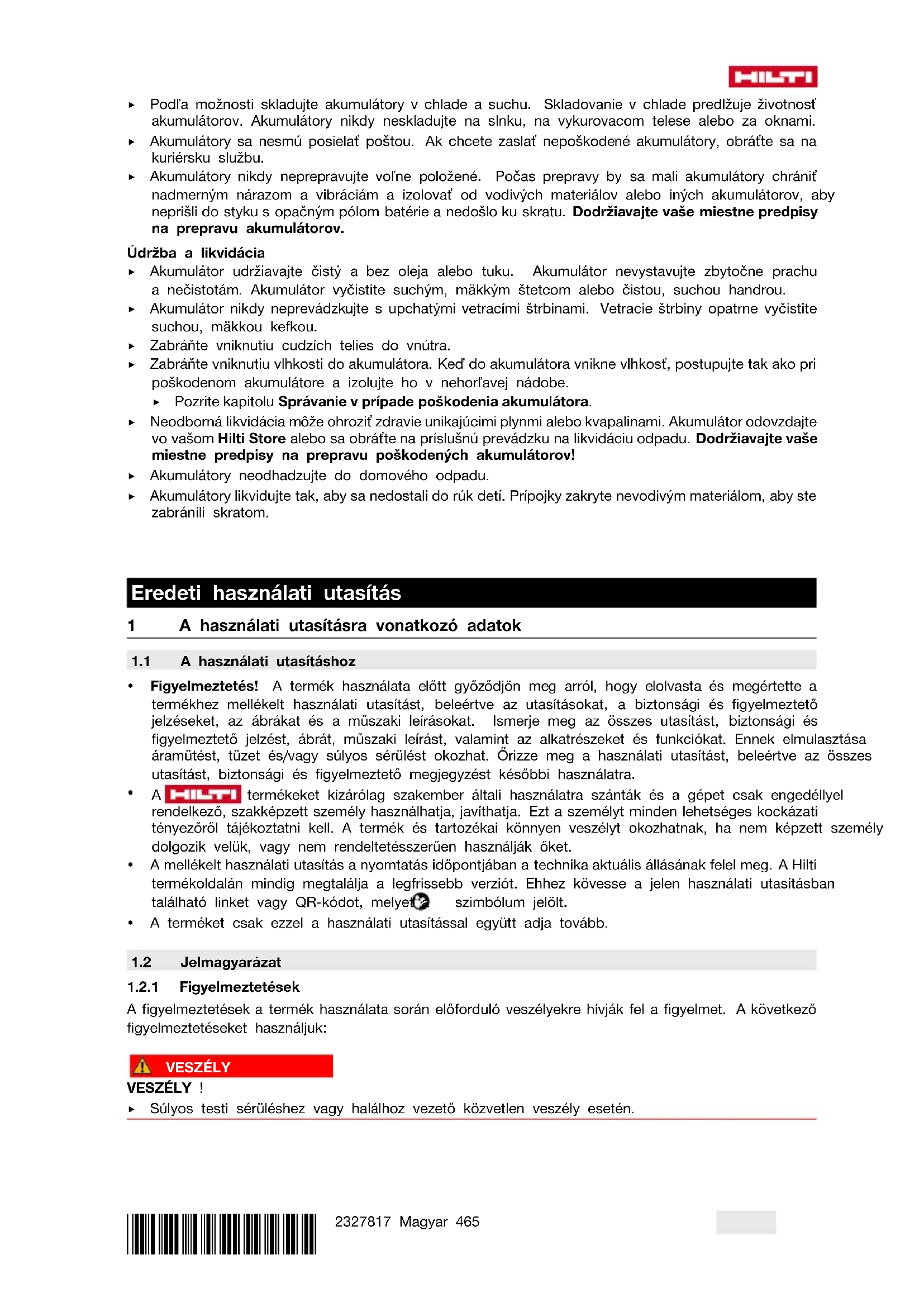 ▶ A Li-ion akkuk biztonságos kezelésére és használatára vegye figyelembe a következő biztonsági tudnivalókat. Ezek figyelmen kívül hagyása bőrirritációt, súlyos korrozív sérülést, kémiai égési sérülést, tüzet és/vagy robbanást okozhat. ▶ Az akkut csak kifogástalan műszaki állapotban használja. ▶ A sérülések elkerülése és ez egészségre erősen ártalmas folyadékok kifolyásának megakadályozására odafigyeléssel használja az akkut! ▶ Az akkuk semmi esetre sem módosíthatók vagy manipulálhatók! ▶ Az akkut tilos szétszedni, összepréselni, 80 °C (176 °F) fölé hevíteni vagy elégetni. ▶ Ne használjon vagy töltsön olyan akkut, amelyet ütés ért, vagy egyéb más módon sérült. Rendszeresen ellenőrizze az akkukat sérülés szempontjából. ▶ Soha ne használjon újrafelhasznált vagy javított akkukat. ▶ Az akkut vagy akkumulátoros elektromos kéziszerszámot soha ne használja ütőszerszámként. ▶ Az akkukat soha ne tegye ki közvetlen napsugárzásnak, magas hőmérsékletnek, szikraképződésnek vagy nyílt lángnak. Ezek robbanást okozhatnak. ▶ Ne érintse ujjal, szerszámmal, ékszerrel vagy egyéb elektromosan vezető tárgyakkal az akkumulátor pólusait. Ez az akku sérülését okozhatja, valamint anyagi károkhoz és sérülésekhez vezethet. ▶ Tartsa távol az akkumulátort esőtől, nedvességtől és folyadékoktól. A behatoló folyadék rövidzárlatot, áramütést, égési sérülést, tüzet és robbanást okozhat. ▶ Csak az ehhez az akkumulátortípushoz tervezett töltőkészülékeket és elektromos kéziszerszámokat használja. Ehhez vegye figyelembe a megfelelő használati utasítás adatait. ▶ Ne használjon és ne tárolja az akkut robbanásveszélyes környezetben.472 Magyar 2327817 *2327817* ▶ Ha érintésre túl forró az akku, akkor lehet, hogy meghibásodott. Állítsa az akkut egy látható, nem gyúlékony helyre, éghető anyagoktól elegendő távolságra. Hagyja lehűlni az akkut. Amennyiben egy óra elteltével még mindig túl forró az akku érintésre, akkor meghibásodott. Forduljon a Hilti Szervizhez vagy olvassa el a „Tudnivalók a Hilti Li-ion akkuk biztonságával és alkalmazásával kapcsolatban” c. dokumentumot. Vegye figyelembe a lítium-ion akkuk szállítására, tárolására és alkalmazására vonatkozó speciális irányelveket. 488 Olvassael a Hilti Li-ion akkuk biztonságávalésalkalmazásávalkapcsolatostudnivalókat,amelyeket a jelen használati utasítás végén található QR-kód beolvasásával érhet el.
