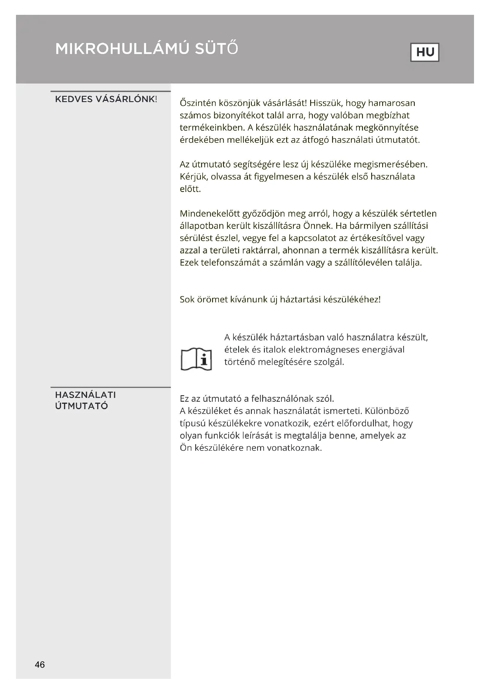 számos bizonyítékot talál arra, hogy valóban megbízhat termékeinkben. A készülék használatának megkönnyítése érdekében mellékeljük ezt az átfogó használati útmutatót. Az útmutató segítségére lesz új készüléke megismerésében. Kérjük, olvassa át figyelmesen a készülék első használata előtt. Mindenekelőtt győződjön meg arról, hogy a készülék sértetlen állapotban került kiszállításra Önnek. Ha bármilyen szállítási sérülést észlel, vegye fel a kapcsolatot az értékesítővel vagy azzal a területi raktárral, ahonnan a termék kiszállításra került. Ezek telefonszámát a számlán vagy a szállítólevélen találja. Sok örömet kívánunk új háztartási készülékéhez! A készülék háztartásban való használatra készült, ételek és italok elektromágneses energiával történő melegítésére szolgál. Ez az útmutató a felhasználónak szól. A készüléket és annak használatát ismerteti. Különböző típusú készülékekre vonatkozik, ezért előfordulhat, hogy olyan funkciók leírását is megtalálja benne, amelyek az Ön készülékére nem vonatkoznak. HASZNÁLATI ÚTMUTATÓ KEDVES VÁSÁRLÓNK! Őszintén köszönjük vásárlását! Hisszük, hogy hamarosan 46FIGYELMEZTETÉS! A készülék és hozzáférhető részei használat közben felforrósodhatnak. Ügyeljen rá, hogy ne érintse meg a fűtőelemeket. A 8 évesnél fiatalabb gyerekeket tartsa távol a készüléktől - kivéve, ha folyamatos felügyeletük. biztosított. A gyerekeket felügyelni szükséges, hogy ne játszhassanak a készülékkel. Ezt a készüléket akkor használhatják 8 éves vagy annál idősebb gyerekek, valamint csökkent fizikális, érzékszervi vagy mentális képességekkel rendelkezők, illetve megfelelő tudással és tapasztalattal nem rendelkező személyek, ha felügyeletük biztosított, vagy ha útmutatást kaptak a készülék biztonságos használatáról és megértették az ezzel járó veszélyeket. Gyerekek nem játszhatnak a készülékkel. A készülék tisztítását és karbantartását akkor végezhetik 8 évesnél idősebb gyerekek, ha felügyeletük biztosított. Tartsa távol a készüléket és a tápkábelt a 8 évesnél fiatalabb gyerekektől.