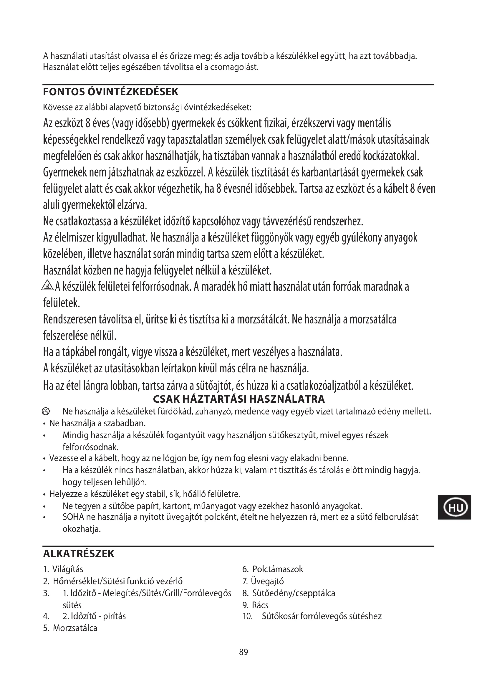 Kövesse az alábbi alapvető biztonsági óvintézkedéseket: Az eszközt 8 éves (vagy idősebb) gyermekek és csökkent zikai, érzékszervi vagy mentális képességekkel rendelkező vagy tapasztalatlan személyek csak felügyelet alatt/mások utasításainak megfelelően és csak akkor használhatják, ha tisztában vannak a használatból eredő kockázatokkal. Gyermekek nem játszhatnak az eszközzel. A készülék tisztítását és karbantartását gyermekek csak felügyelet alatt és csak akkor végezhetik, ha 8 évesnél idősebbek. Tartsa az eszközt és a kábelt 8 éven aluli gyermekektől elzárva. Ne csatlakoztassa a készüléket időzítő kapcsolóhoz vagy távvezérlésű rendszerhez. Az élelmiszer kigyulladhat. Ne használja a készüléket függönyök vagy egyéb gyúlékony anyagok közelében, illetve használat során mindig tartsa szem előtt a készüléket. Használat közben ne hagyja felügyelet nélkül a készüléket.